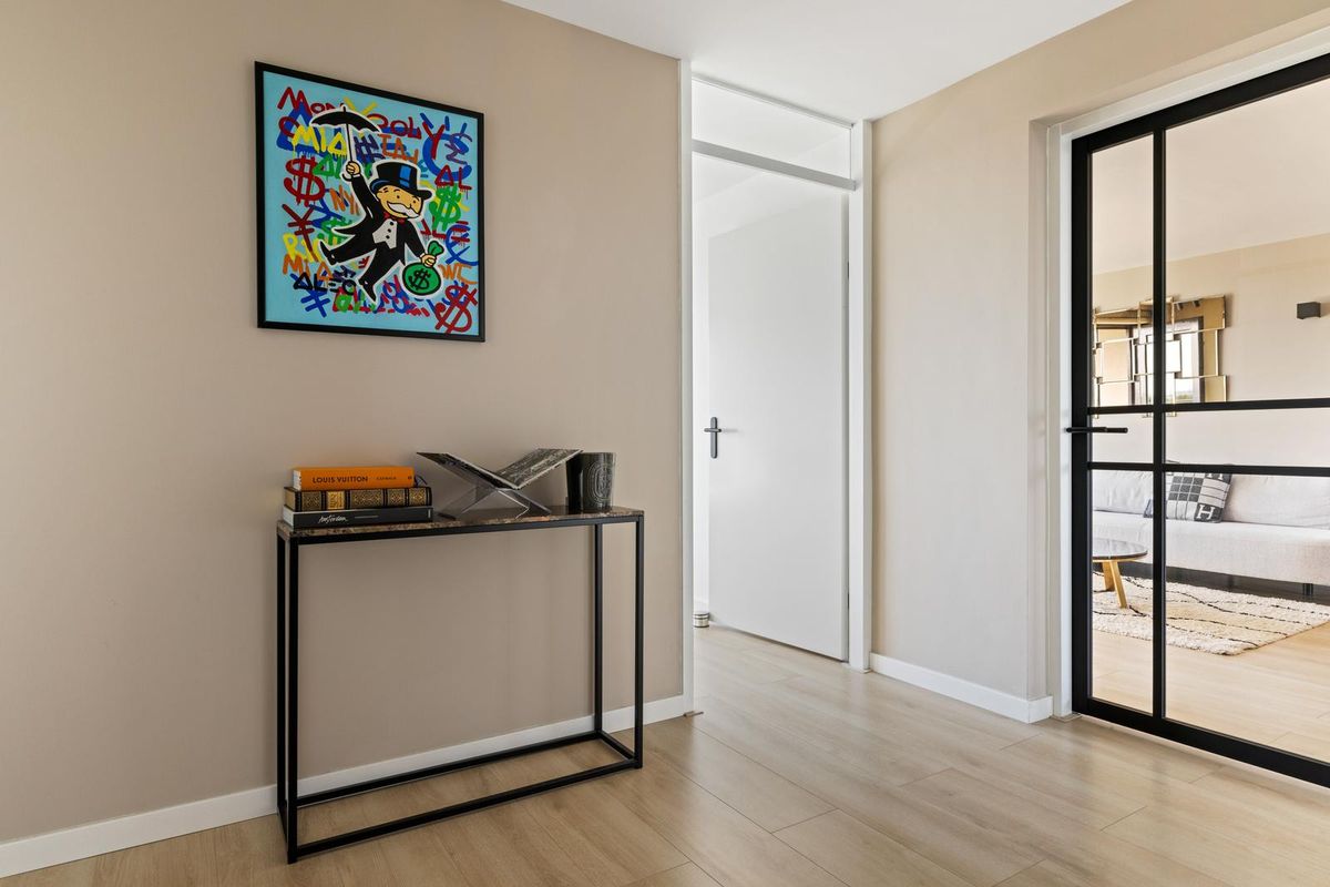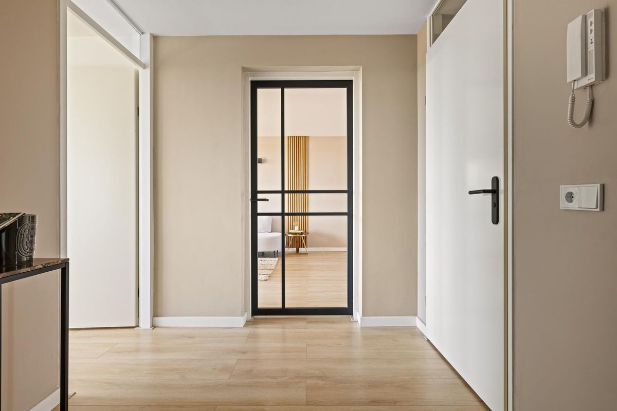 Via de afgesloten entree met intercominstallatie kom je in het trappenhuis met lift. Het appartement bevindt zich op de tiende en tevens bovenste verdieping (geen bovenburen). Je komt binnen in een hal waar ook een extra afgesloten bergruimte is gecreëerd.