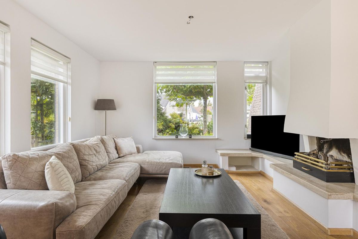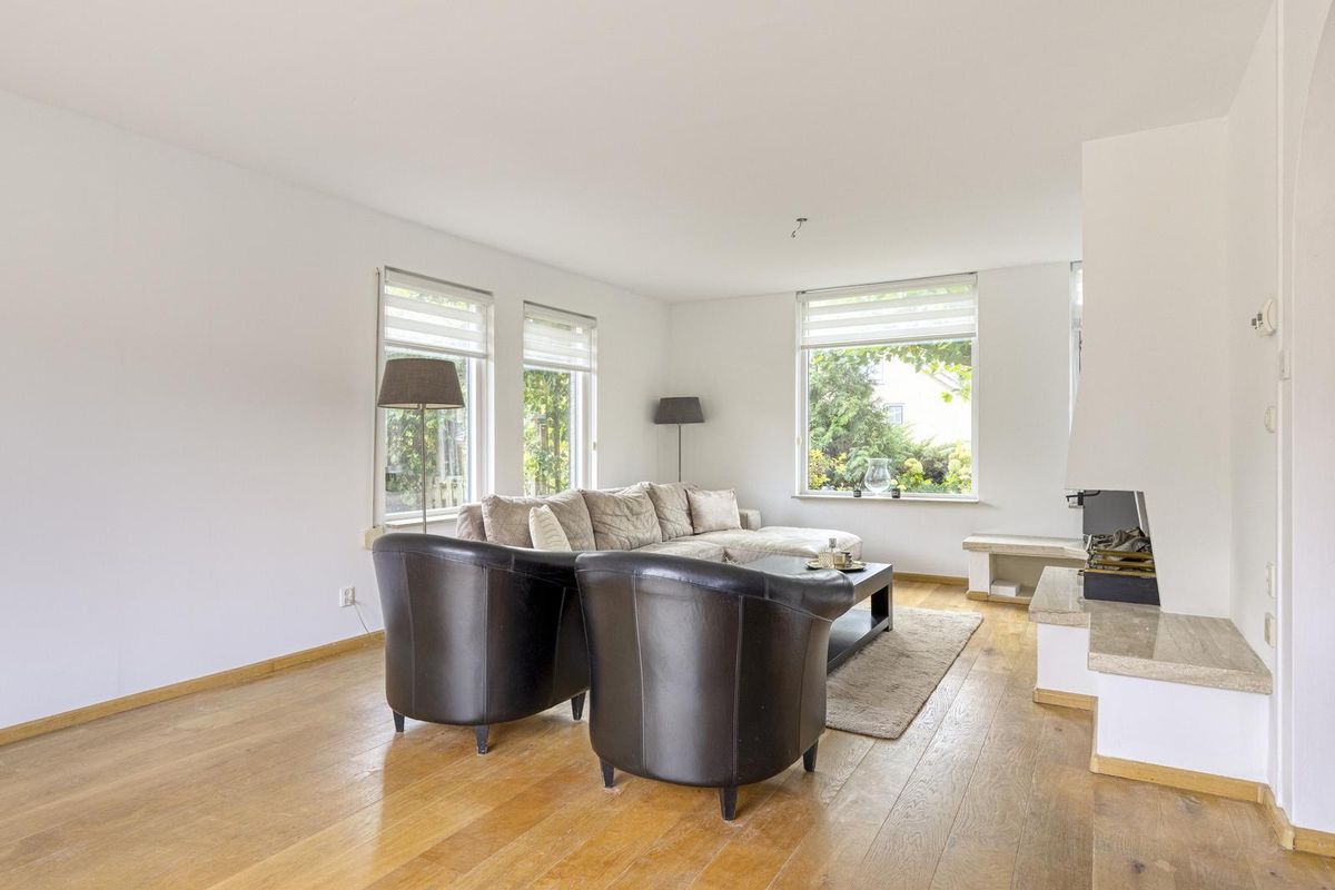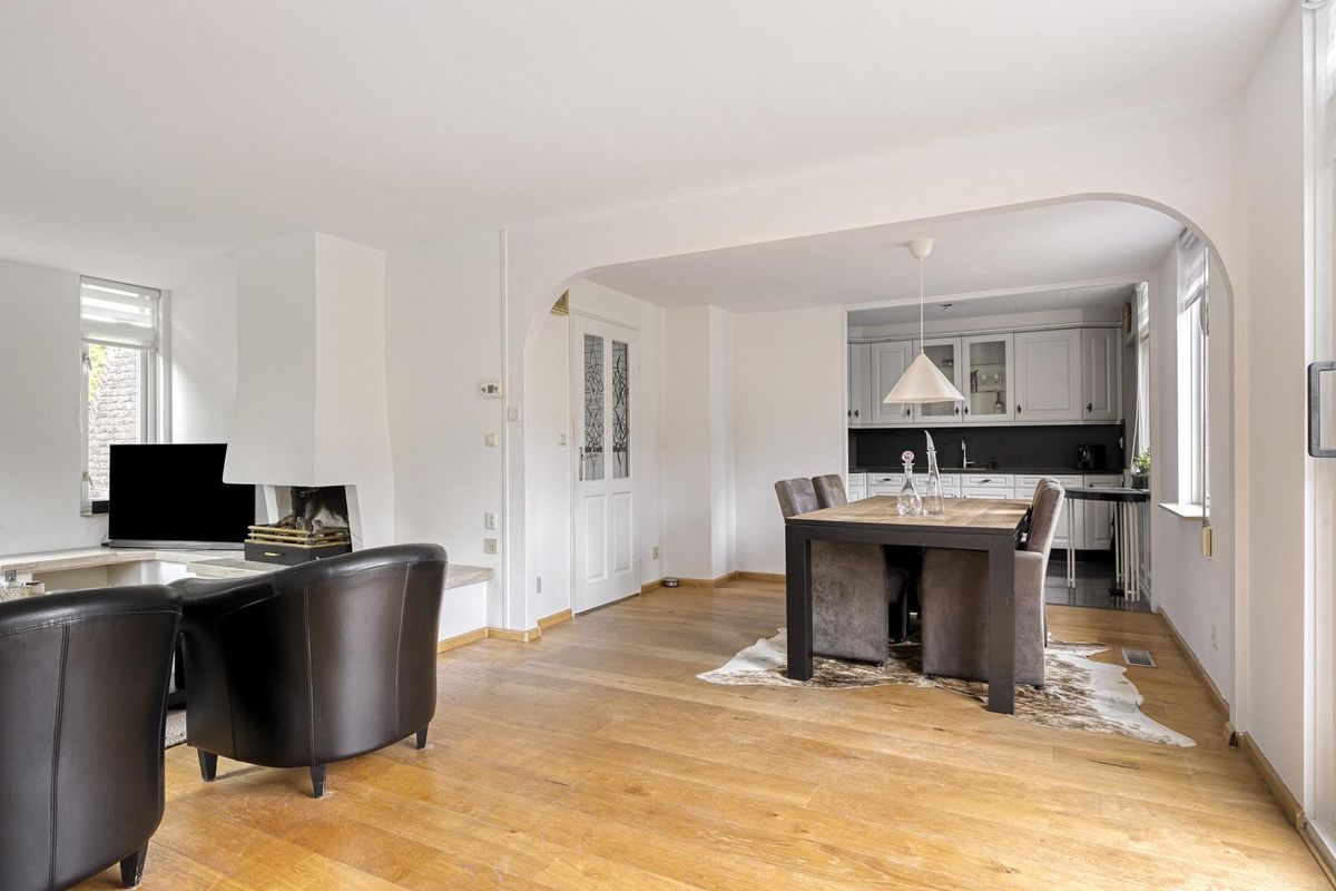 De L-vormige, tuingerichte woonkamer is een plek waar je je direct thuis voelt. Dankzij de ramen rondom geniet je van veel daglicht en uitzicht op het groen, terwijl er ook voldoende blinde muren zijn die juist plek bieden voor kasten of wanddecoratie. De woonkamer heeft een prettige indeling: een knusse zithoek bij de open haard en in het verlengde van de keuken, volop ruimte voor een grote eettafel om met het gezin, vrienden of familie lang te tafelen. De wanden zijn mooi, neutraal afgewerkt en op de vloer ligt een houten planken vloer in een warme tint. Via de schuifdeuren stap je zo het terras op – de tuin in, waar je door de beschutte ligging al snel lekker kan zitten.