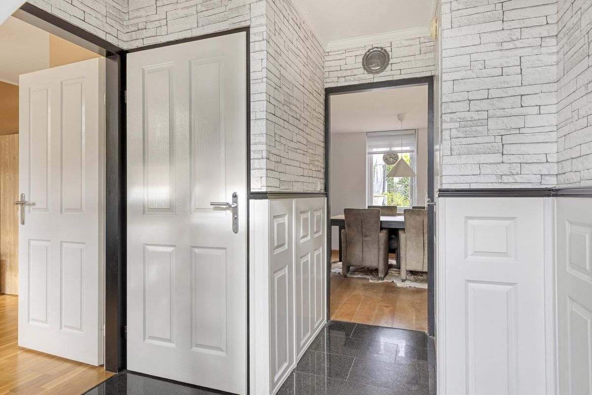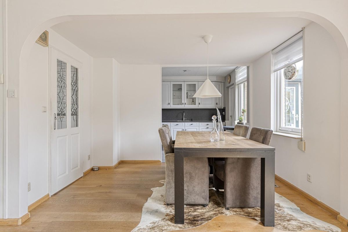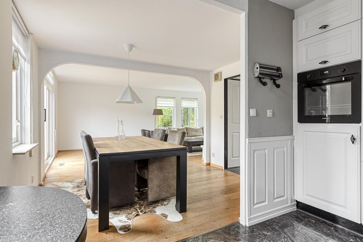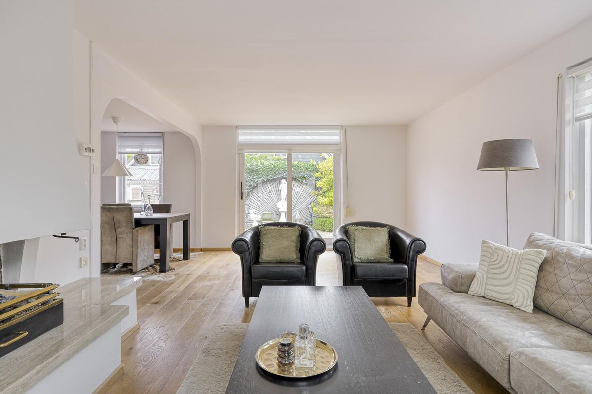 De L-vormige, tuingerichte woonkamer is een plek waar je je direct thuis voelt. Dankzij de ramen rondom geniet je van veel daglicht en uitzicht op het groen, terwijl er ook voldoende blinde muren zijn die juist plek bieden voor kasten of wanddecoratie. De woonkamer heeft een prettige indeling: een knusse zithoek bij de open haard en in het verlengde van de keuken, volop ruimte voor een grote eettafel om met het gezin, vrienden of familie lang te tafelen. De wanden zijn mooi, neutraal afgewerkt en op de vloer ligt een houten planken vloer in een warme tint. Via de schuifdeuren stap je zo het terras op – de tuin in, waar je door de beschutte ligging al snel lekker kan zitten.