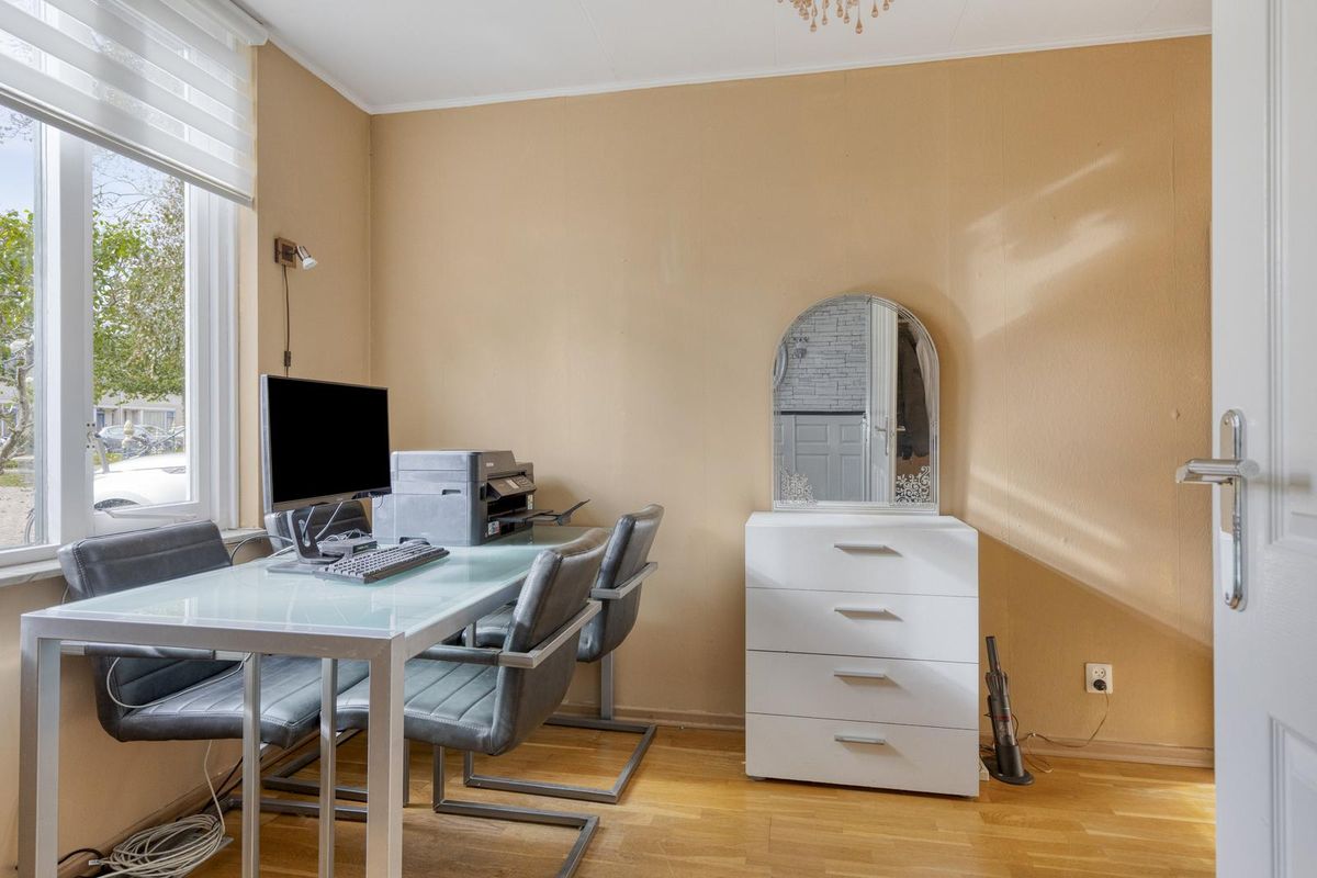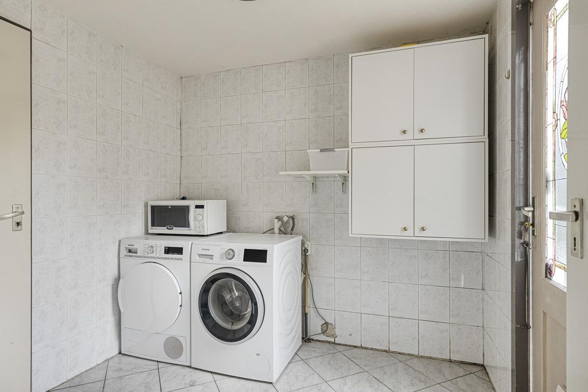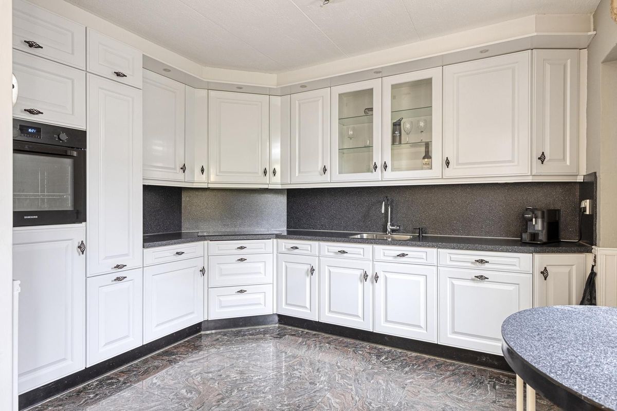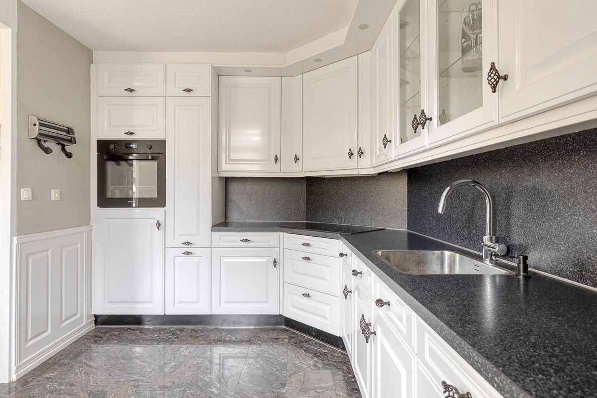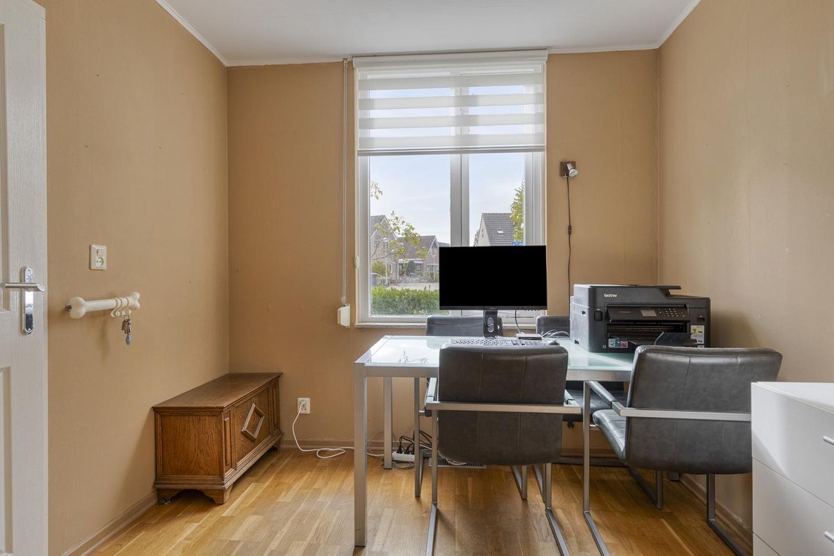 De open keuken in een hoekopstelling sluit mooi aan bij de eethoek en is praktisch ingericht met veel opbergruimte in zowel boven- als onderkasten. Verder is ze uitgerust met de nodige apparatuur zoals een combi-oven, koelkast, inductie kookplaat, close-in boiler en vaatwasser. Het werkblad met natuursteen-look biedt door de opstelling genoeg praktische werkruimte. Aansluitend bevindt zich de bijkeuken, handig met aansluitingen voor het witgoed en extra bergruimte, van hieruit loop je direct door naar de verlengde garage. Op de begane grond vind je daarnaast nog een kamer van circa 9 m², nu in gebruik als werkkamer – ideaal voor thuiswerkers – maar ook geschikt als logeer- of slaapkamer.