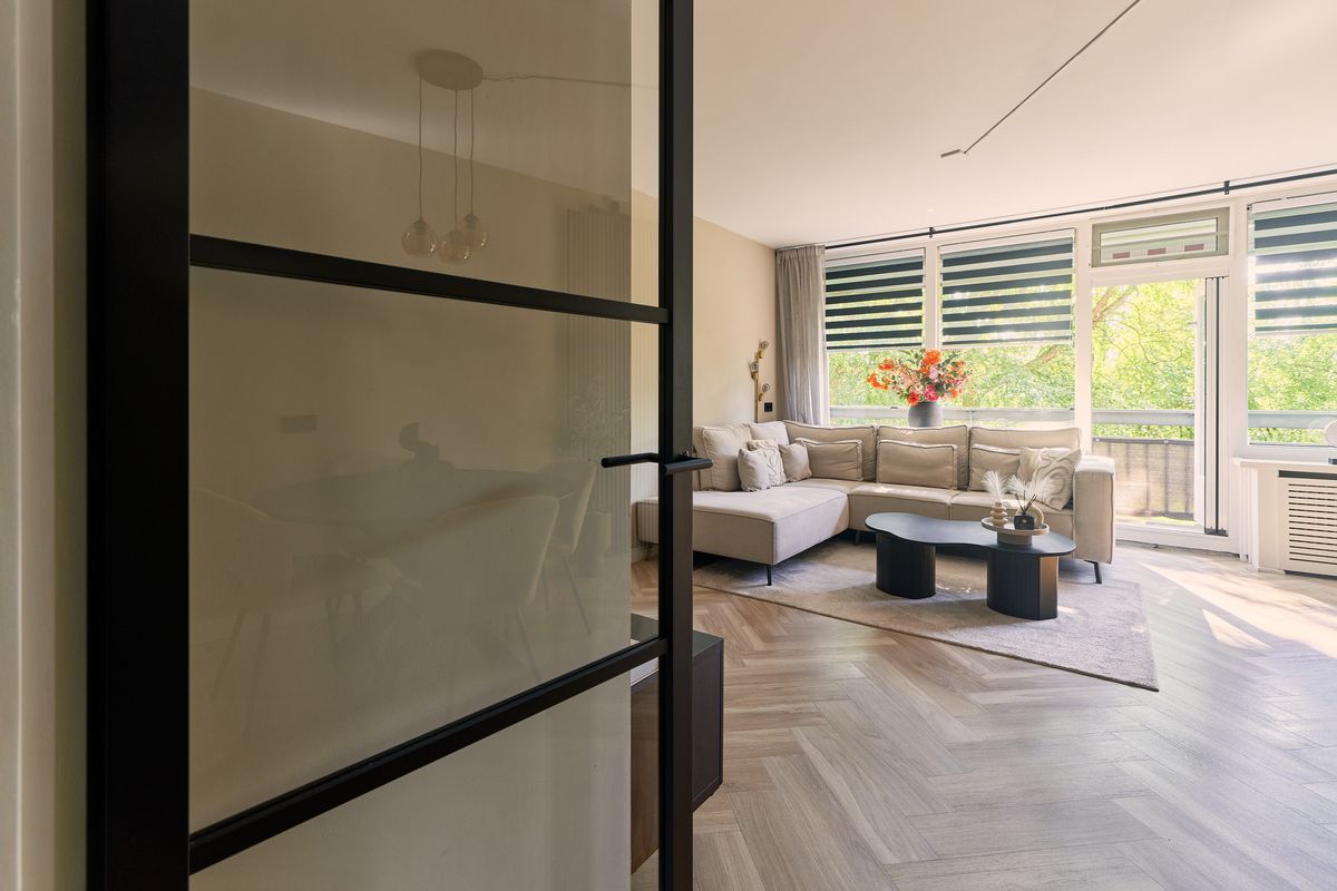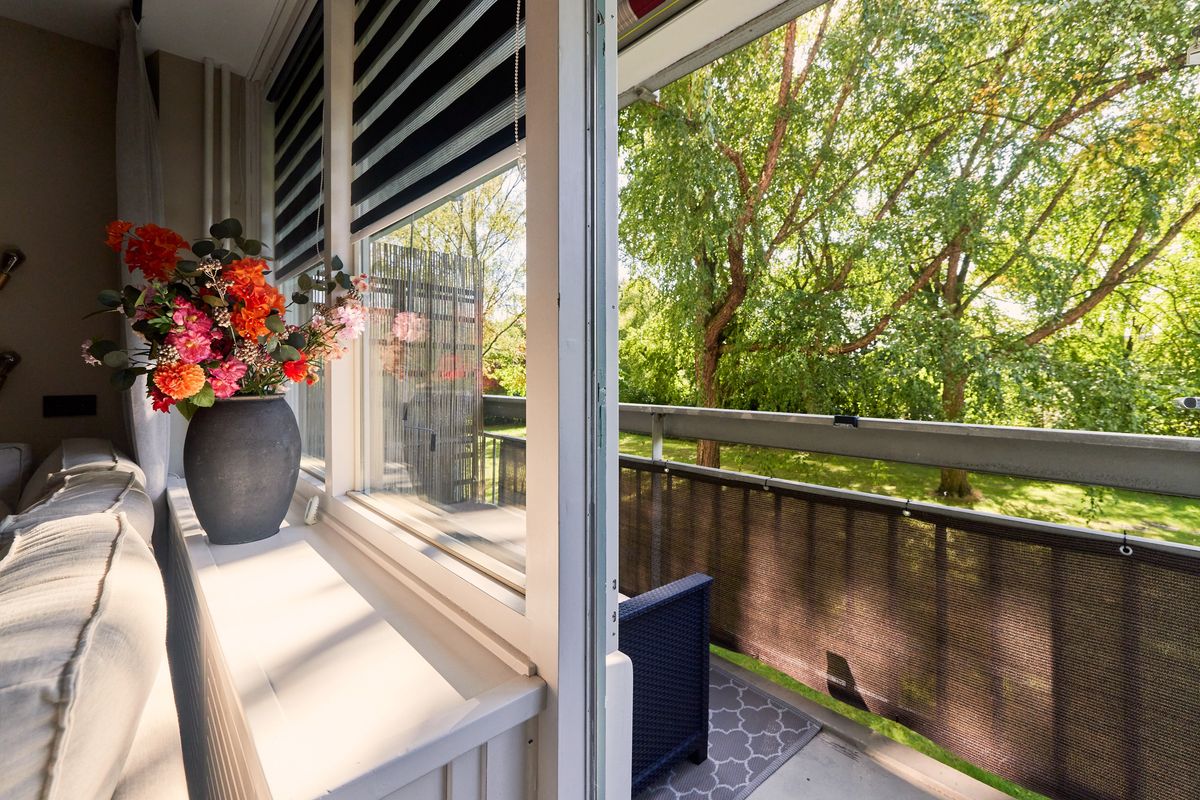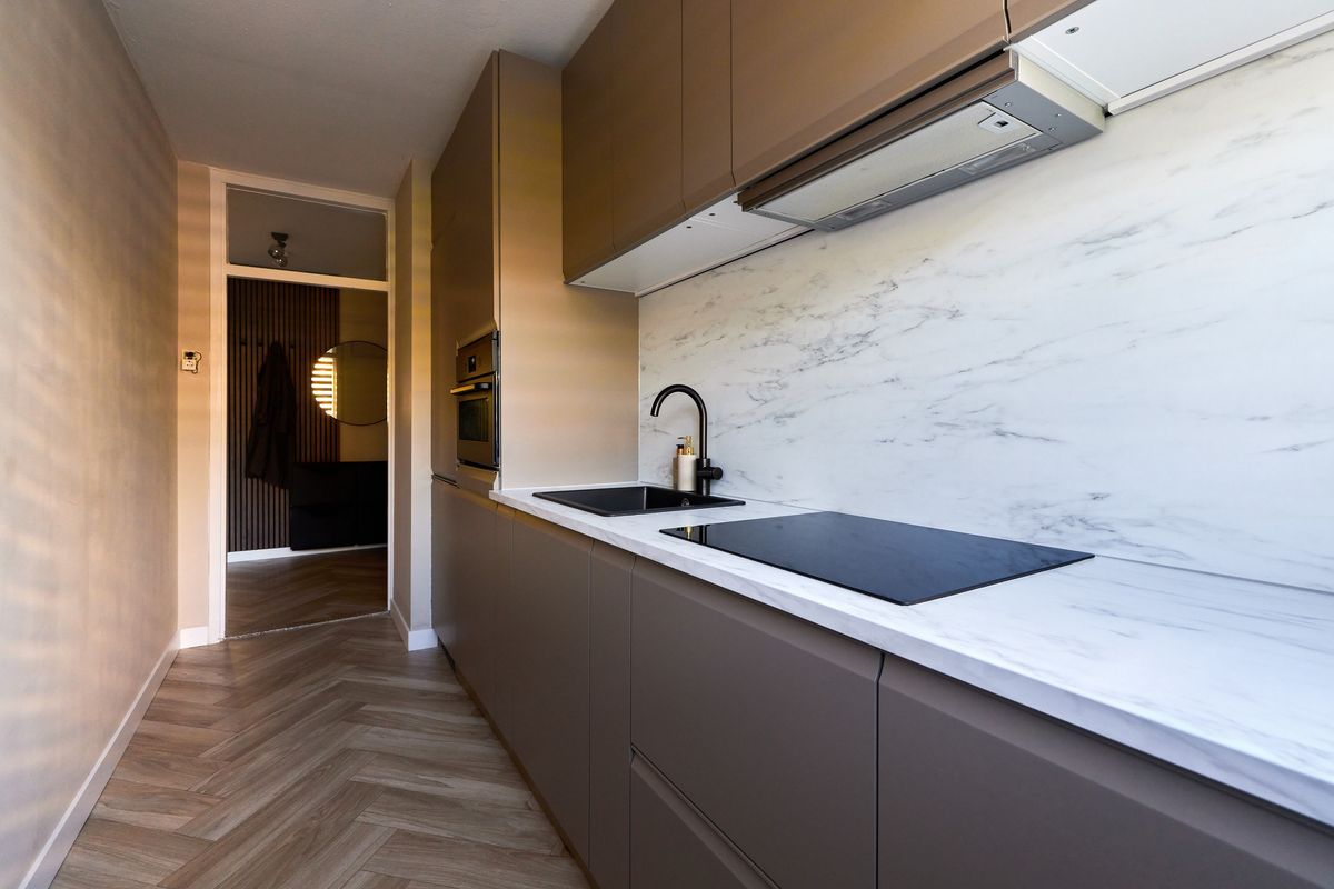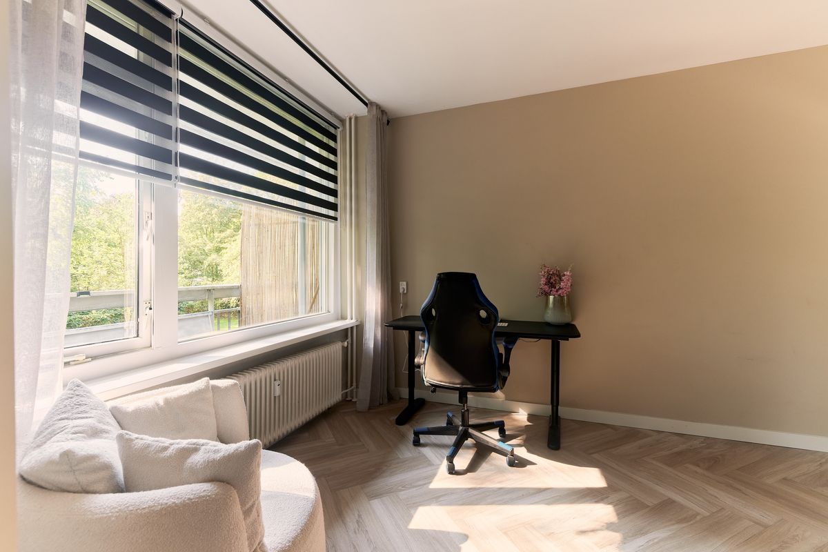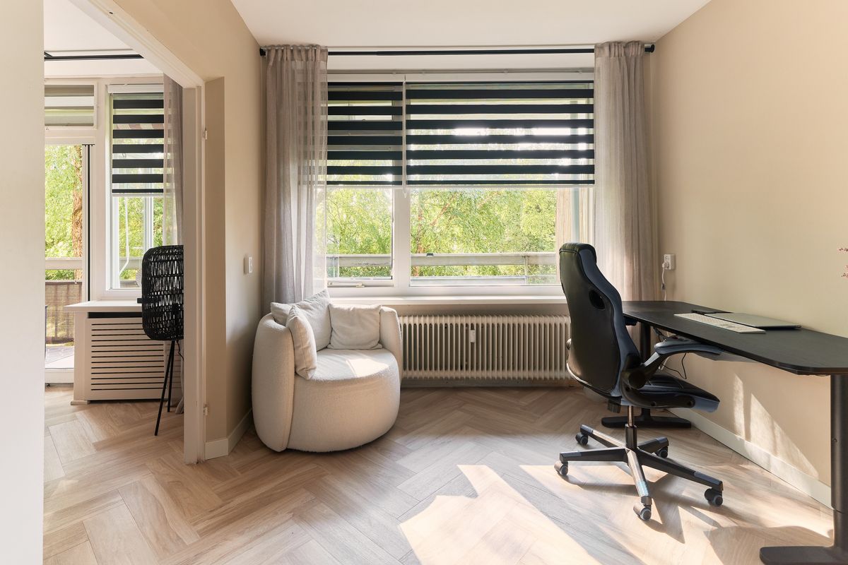 Via de centrale entree op de begane grond, met intercom en brievenbussen, stap je het verzorgde complex binnen. Het appartement op de eerste verdieping bereik je eenvoudig met de trap of de lift – ideaal voor wie gemak en toegankelijkheid belangrijk vindt. Achter de voordeur wacht een verrassend licht en goed onderhouden appartement, waar de strakke afwerking en de warme sfeer je meteen zullen aanspreken. De ruime hal biedt plaats aan je garderobe en geeft toegang tot alle vertrekken. De woonkamer is heerlijk licht dankzij de grote raampartijen en het vrije uitzicht. De moderne PVC-vloer loopt door het hele appartement en alle gordijnen, rolgordijnen en rails blijven achter. Vanuit de woonkamer stap je bovendien zo het balkon op, gelegen op het zonnige zuiden – een fijne plek om in alle rust te genieten van de middag- en avondzon. Grenzend aan de woonkamer ligt een van de twee slaapkamers, momenteel ingericht als werkkamer maar ook zeer geschikt als eetkamer of hobbyruimte. De tweede slaapkamer ligt aan de andere zijde van de hal en is eveneens licht en netjes afgewerkt. De keuken is in 2024 volledig vernieuwd: strak vormgegeven in een rustige kleurstelling met een stijlvolle marmerlook achterwand en uitgerust met moderne inbouwapparatuur zoals een 4-pits inductiekookplaat, afzuigkap, combimagnetron, vaatwasser, koelkast en vriezer. De badkamer is modern betegeld en voorzien van een inloopdouche, wastafelmeubel en verwarmde spiegel. Het toilet bevindt zich apart, naast de badkamer. Een groot pluspunt is de aanwezigheid van twee bergingen: één direct naast de voordeur, met elektra en aansluitingen voor de wasmachine en droger – handig dat ze niet in de badkamer staan – en een tweede, ruime berging op de begane grond, ideaal voor fietsen en grotere spullen. De verwarming verloopt via blokverwarming. De maandelijkse bijdrage bedraagt in totaal € 269,90, bestaande uit € 164,90 aan servicekosten en een voorschot van € 105,- voor de stookkosten.