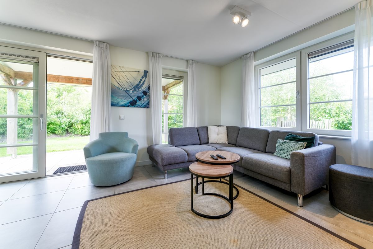 De woonkamer is licht en ruim opgezet, met grote raampartijen die zorgen voor veel natuurlijke lichtinval. De schuifpui leidt naar het overdekte terras, waardoor binnen en buiten naadloos in elkaar overlopen — perfect om het hele jaar door te genieten van de omgeving.