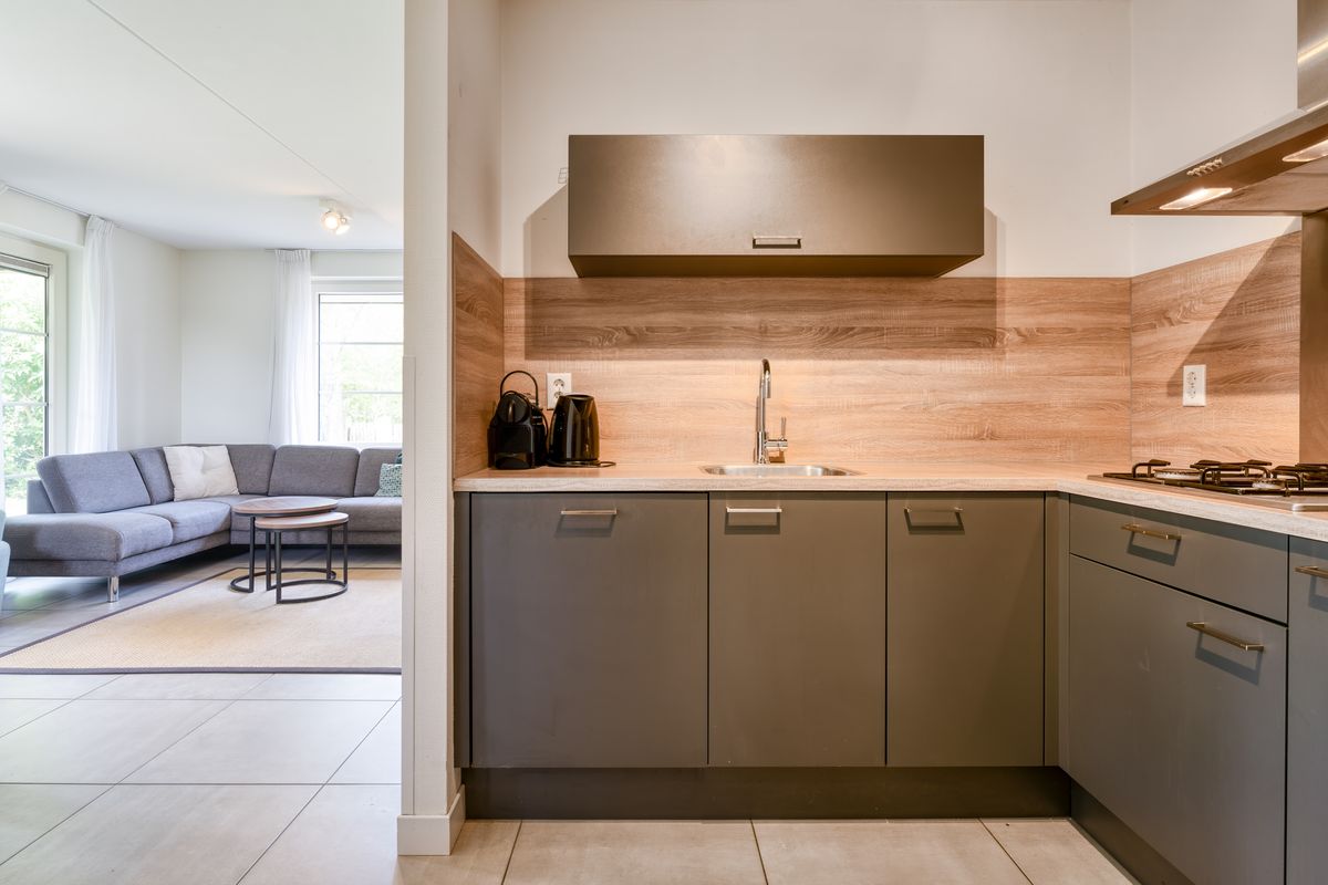 De woonkamer staat in open verbinding met de moderne keuken. Deze is uitgerust met een keukenblok in hoekopstelling en beschikt over alle noodzakelijke, hoogwaardige inbouwapparatuur. Koken wordt hier een feestje!