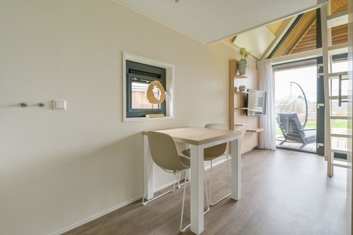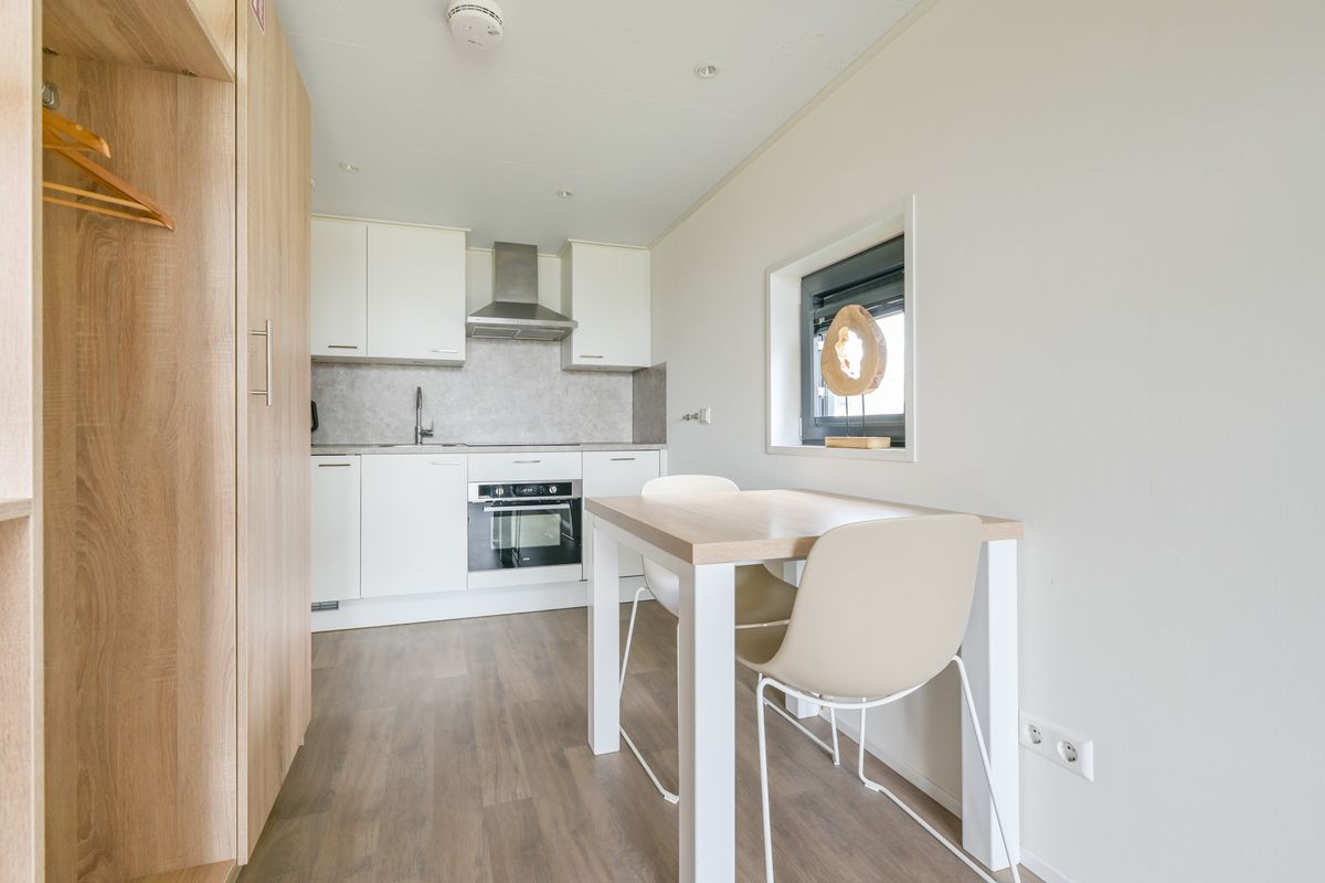 Aangrenzend bevindt zich de open keuken, praktisch ingedeeld en voorzien van alle gemakken: een kookplaat, afzuigkap, combi-oven, vaatwasser, koelkast met vriesvak en ruim werkblad. Er is voldoende plaats voor een eettafel waar je gezellig kunt tafelen met uitzicht naar buiten. De keuken sluit mooi aan bij de rest van het interieur en voelt ondanks het compacte formaat ruim en overzichtelijk aan.
