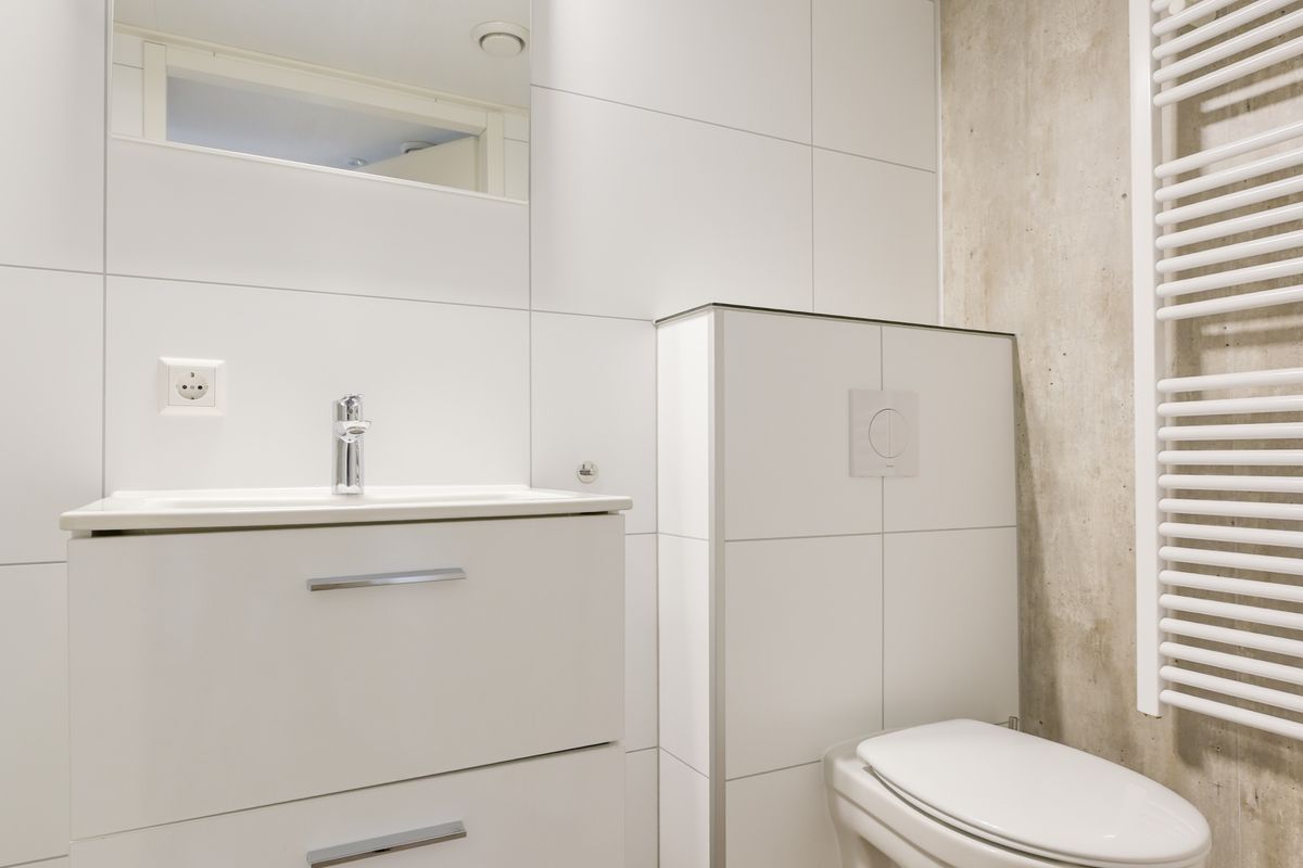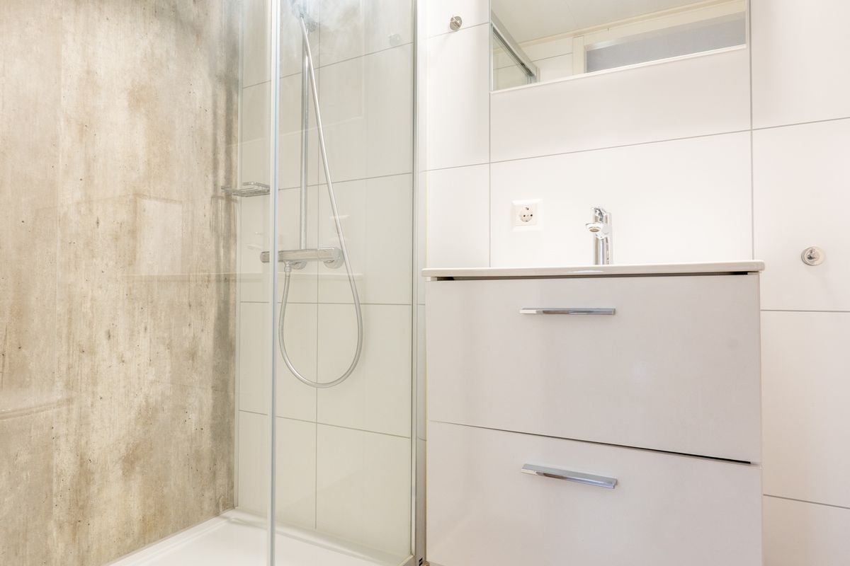 De badkamer is modern en luxe uitgevoerd met een ruime inloopdouche, een hangtoilet, wastafelmeubel met spiegel en een handdoekradiator. De afwerking met witte tegels, houttinten en een betonlook wand zorgt voor een stijlvol geheel dat rust en comfort uitstraalt.