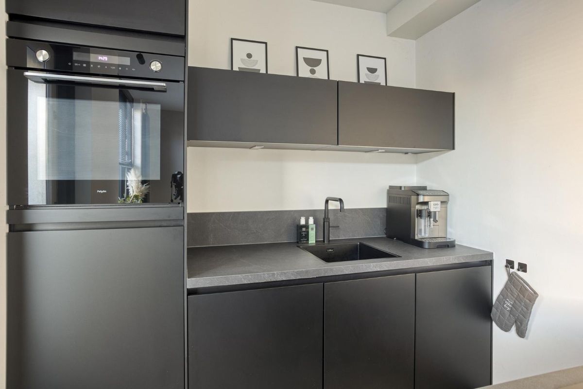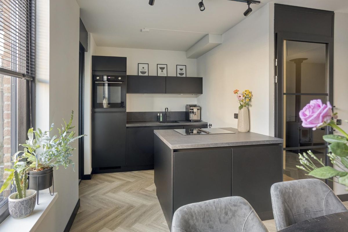 De open keuken sluit hier perfect op aan en is uitgevoerd in een moderne, donkere stijl.