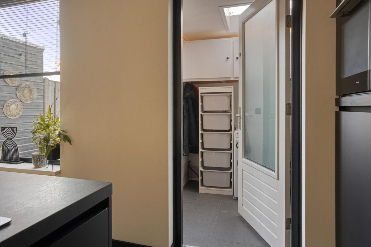 Hier heb je alles netjes uit het zicht, terwijl je ook direct toegang hebt tot buiten — handig als je even snel je was wilt ophangen of iets wilt wegzetten.