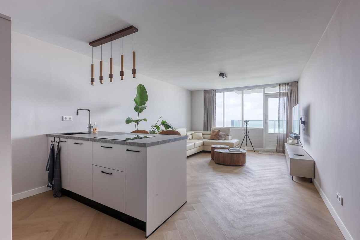 Fraai entree met mooie tochtdeur, gang, prachtige woonkamer met schitterend uitzicht over het strand en de zee, de moderne open keuken is voorzien van diverse moderne voorzieningen, waaronder een inductie kookplaat, vaatwasser, koel-vrieskast en combi oven/magnetron. Vanuit de woonkamer is er toegang tot het heerlijke, zonnige balkon met glazen balkonafscheiding. Het balkon is gelegen op het westen, ideaal om te ontspannen en te genieten van de adembenemende zonsondergang.
