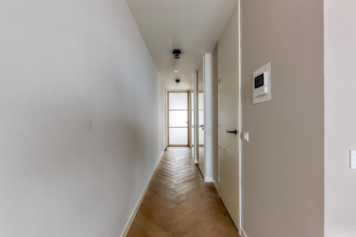 Tussenruimte met een kast over de volle breedte, welke zou kunnen worden gebruikt als logeerruimte. Aparte Easy clean toilet met fonteintje. Goede ruime slaapkamer met aansluitend de badkamer. Deze is voorzien van een ruime inloopdouche met o.a. een regendouche, wastafel met meubel en wasmachine. De plafondhoge binnendeuren hebben verborgen scharnieren.
