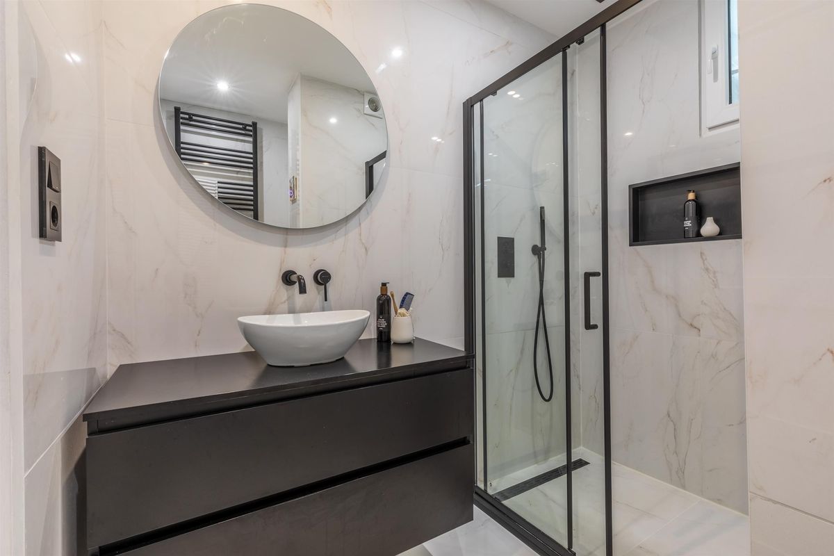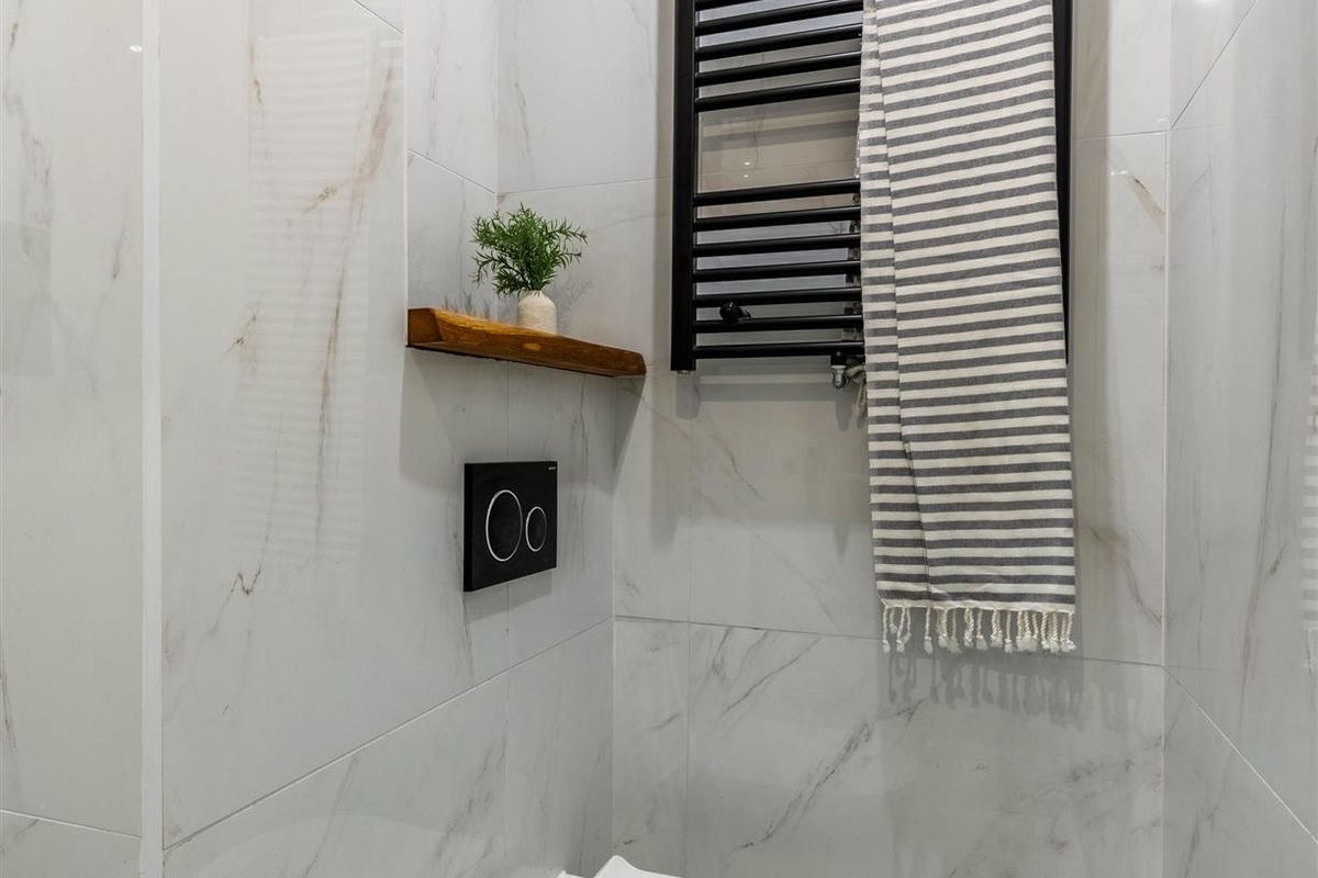 De badkamer is stijlvol gerenoveerd met marmerlook wand- en vloertegels en voorzien van