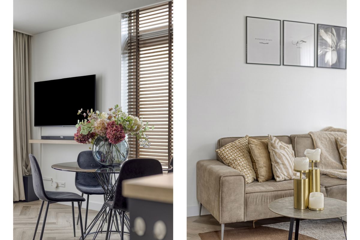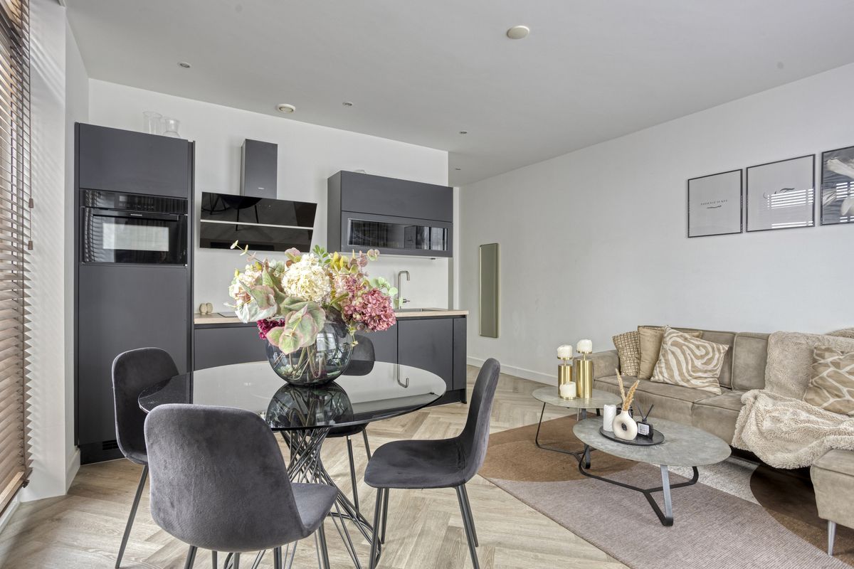 De woonkamer is slim ingericht en voelt verrassend ruim aan. Grote ramen en openslaande deuren naar het dakterras zorgen voor veel licht en een luchtige sfeer. Het terras zelf is royaal en biedt een heerlijke plek voor een ontbijt in de zon, een zomerse borrel met vrienden of een ontspannen avond onder de sterren. Door de directe toegang vanuit de woonkamer wordt buiten écht een verlengstuk van je leefruimte.
