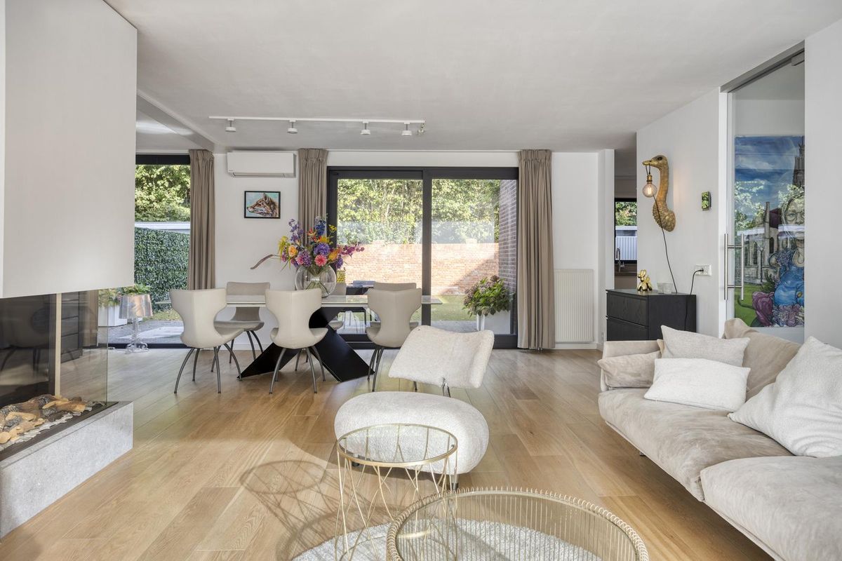 De fraaie parketvloer en de sfeervolle houthaard geven de ruimte een warme uitstraling.
