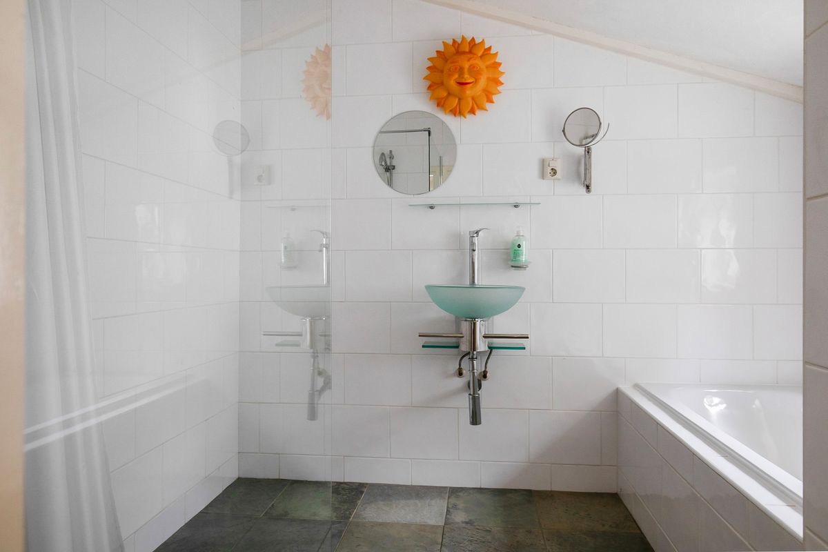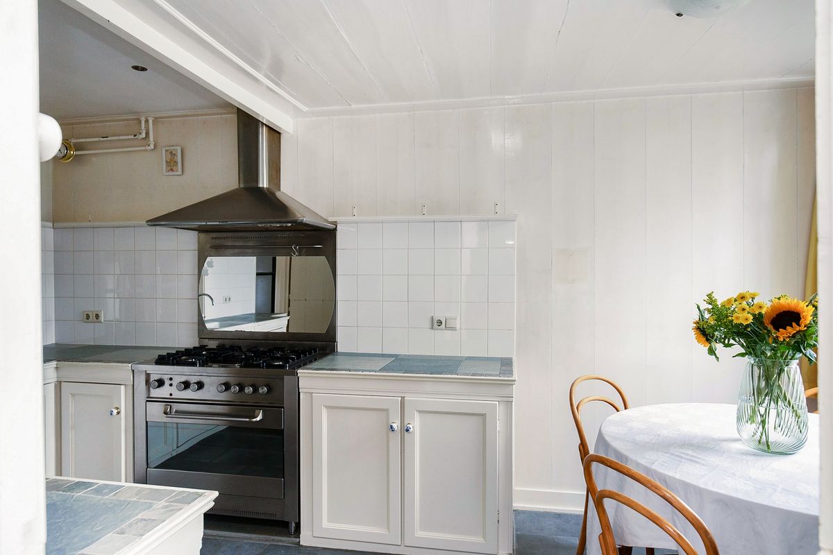 De ruime leefkeuken met eetgedeelte is voorzien van een gasfornuis met oven en wasbak. Aansluitend bevindt zich de bijkeuken met was- en drogeropstelling, koelkast met vriezer, en toegang tot de achtertuin. De badkamer beschikt over een inloopdouche, ligbad en wastafel.