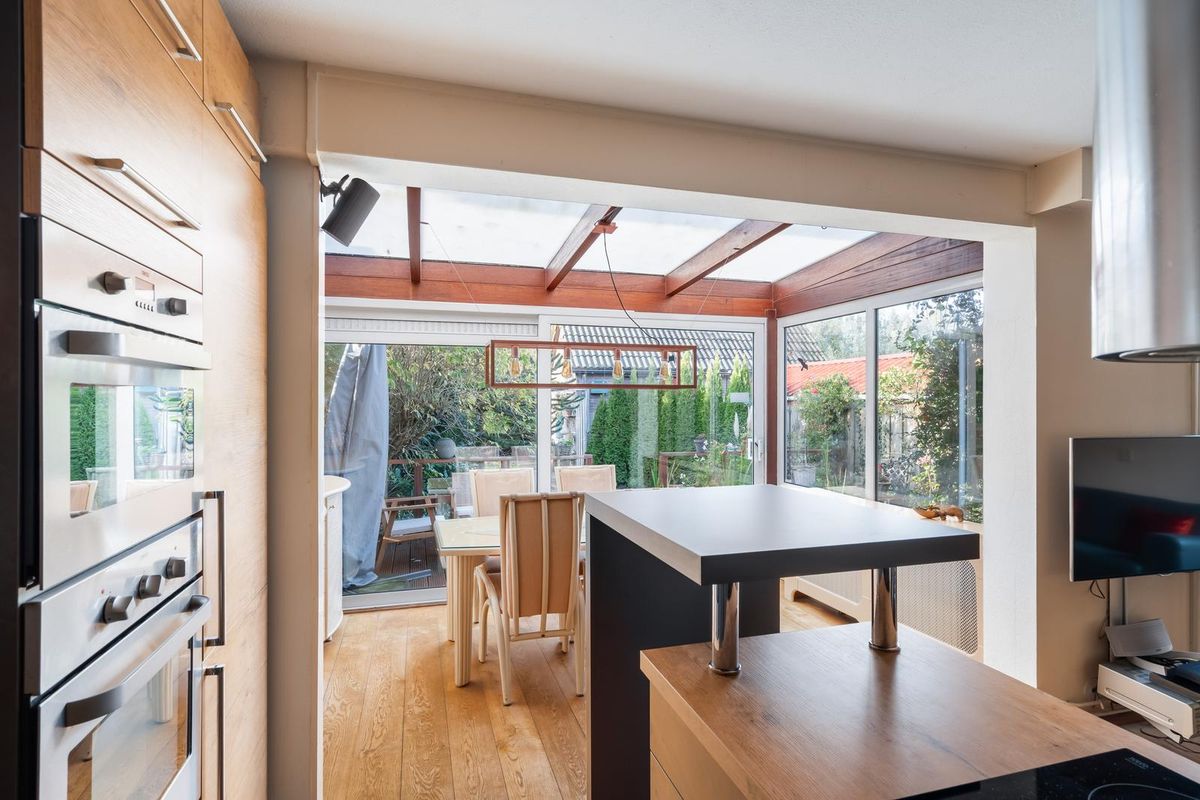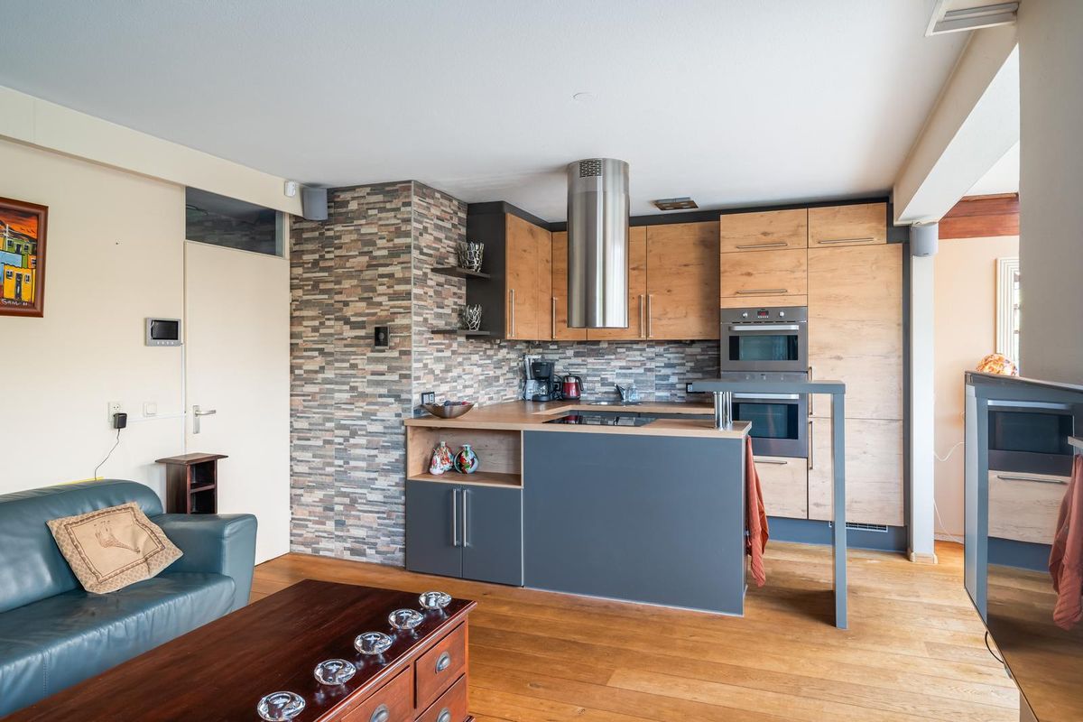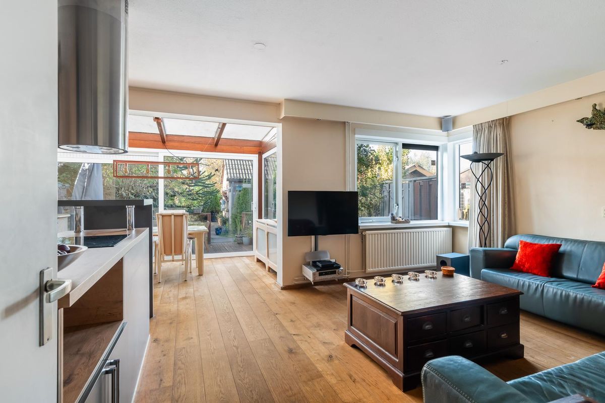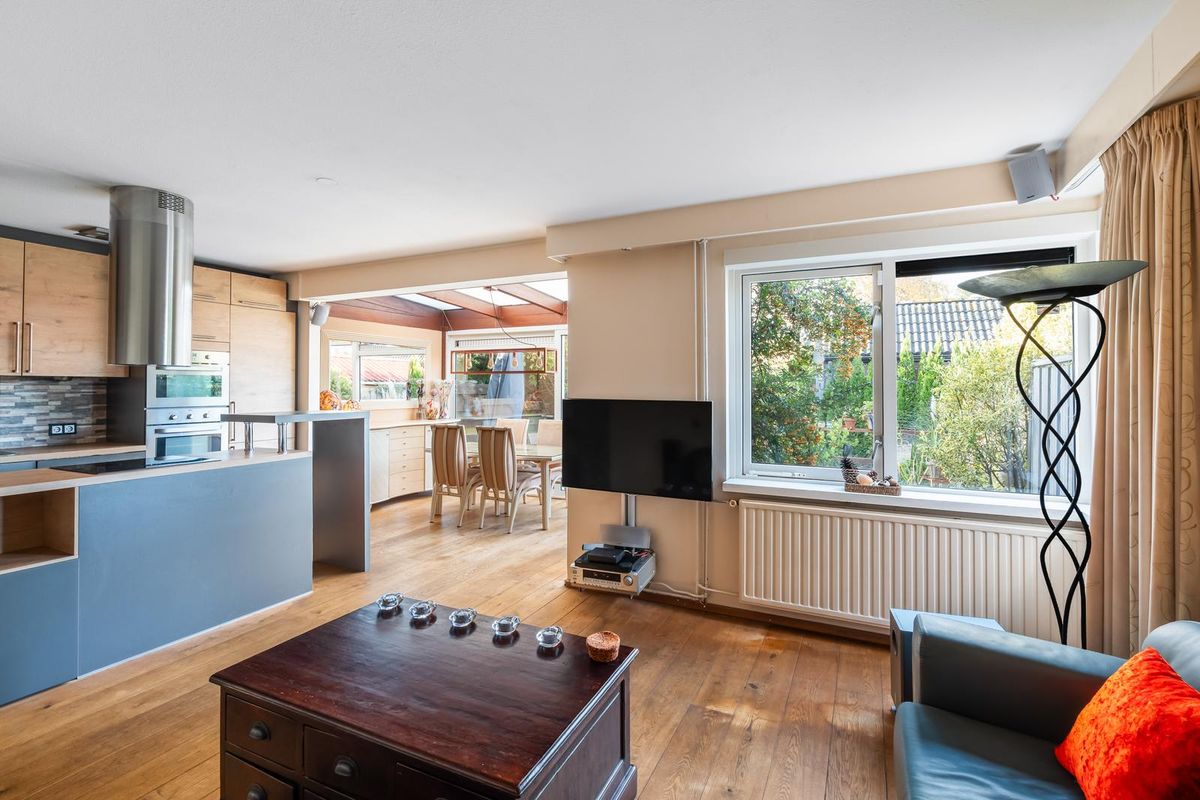 Hal met aparte toiletruimte, trapopgang naar boven en doorgang naar de woonkamer. De woonkamer heeft een zitgedeelte met open keuken. In de uitbouw met licht doorlatend dak is ruimte voor een gezellig eetgedeelte, met uitzicht op de fantastische tuin. De keuken is voorzien van koelkast, vriezer, Miele vaatwasmachine, inductiekookplaat, afzuigkap, oven en magnetron. De gehele benedenverdieping is afgewerkt met een houten vloer en de houten kozijnen in de woonkamer zijn vernieuwd.
