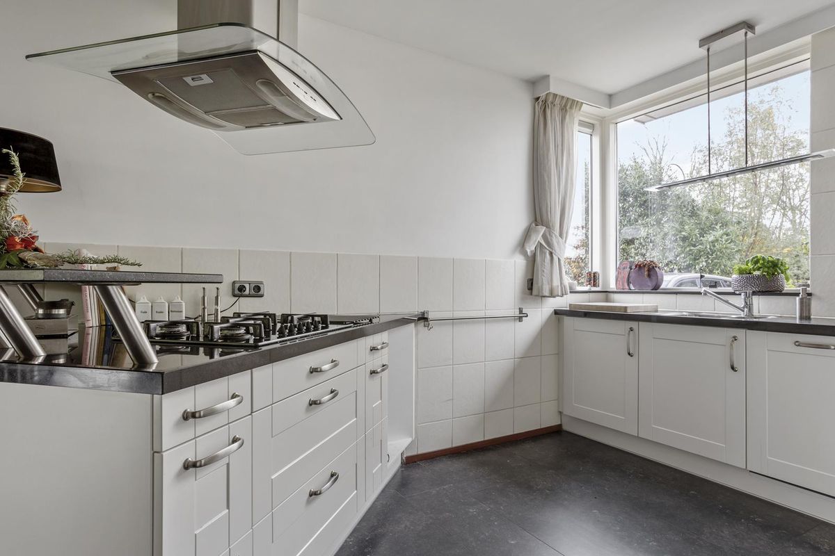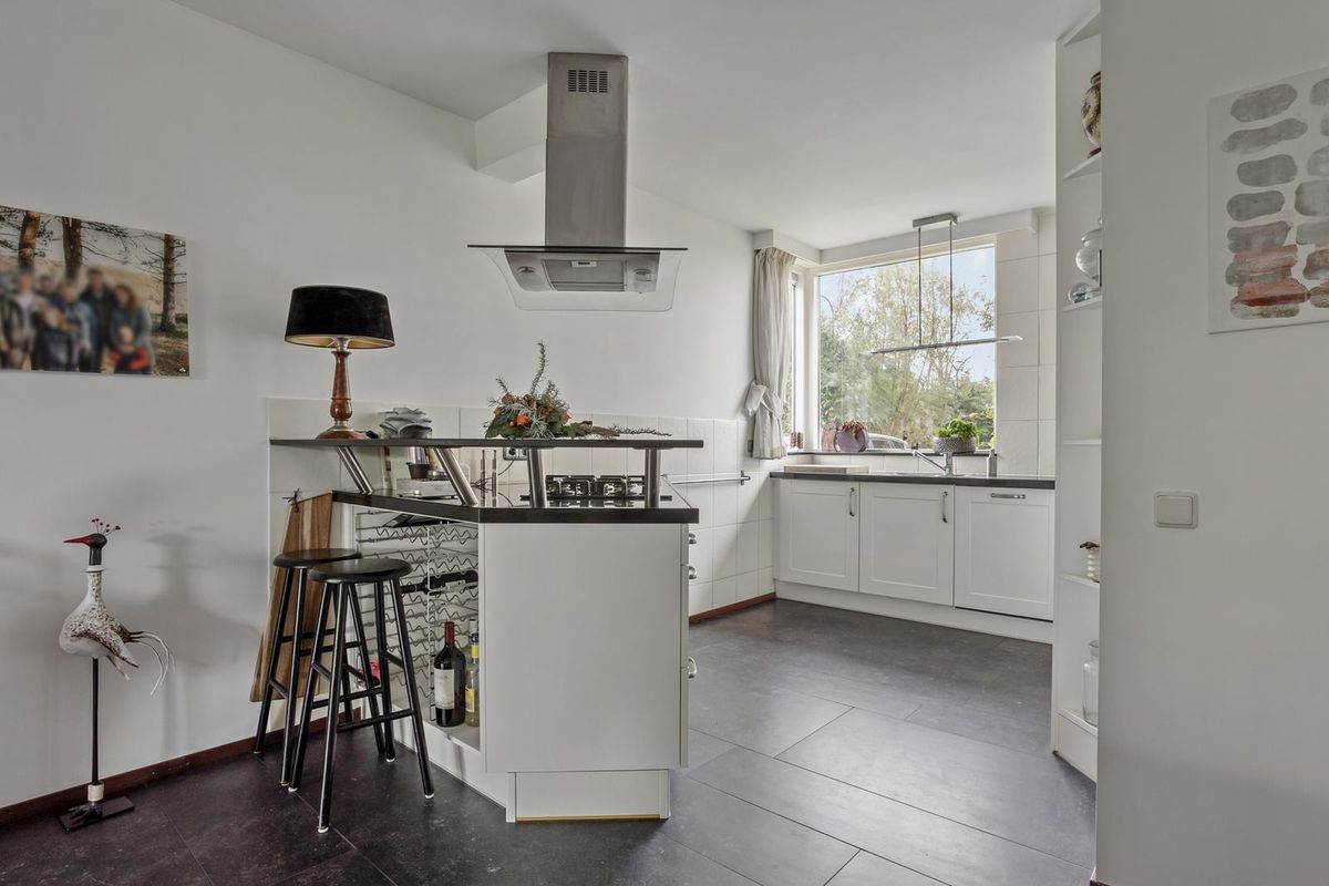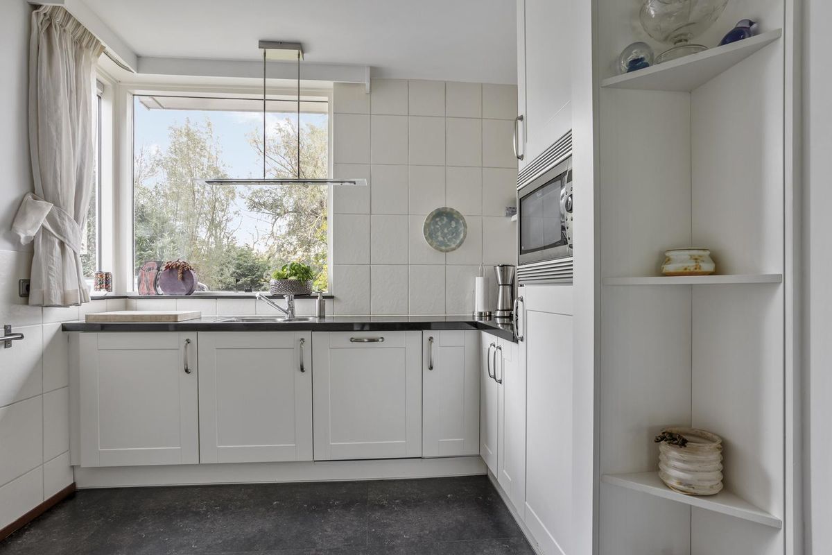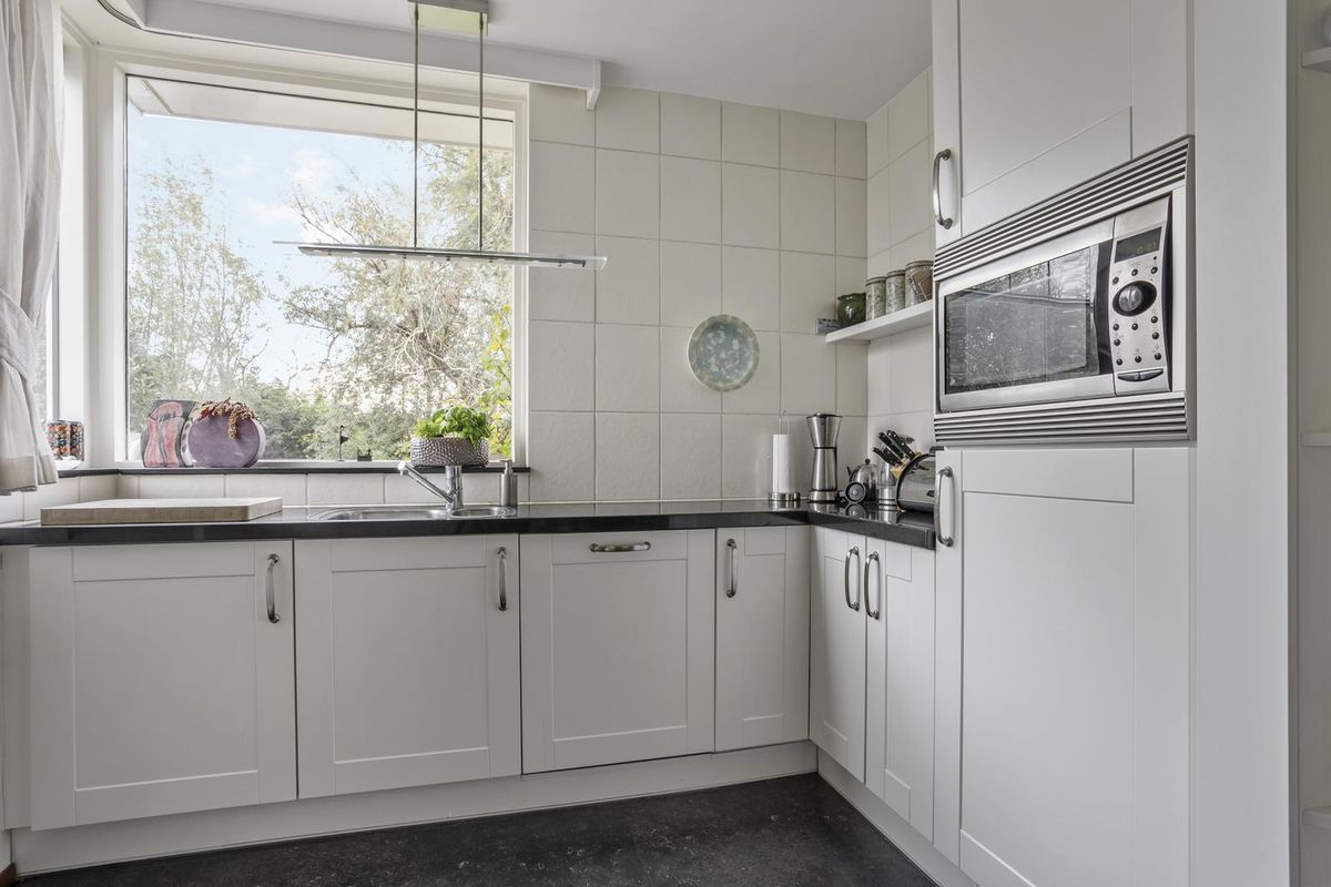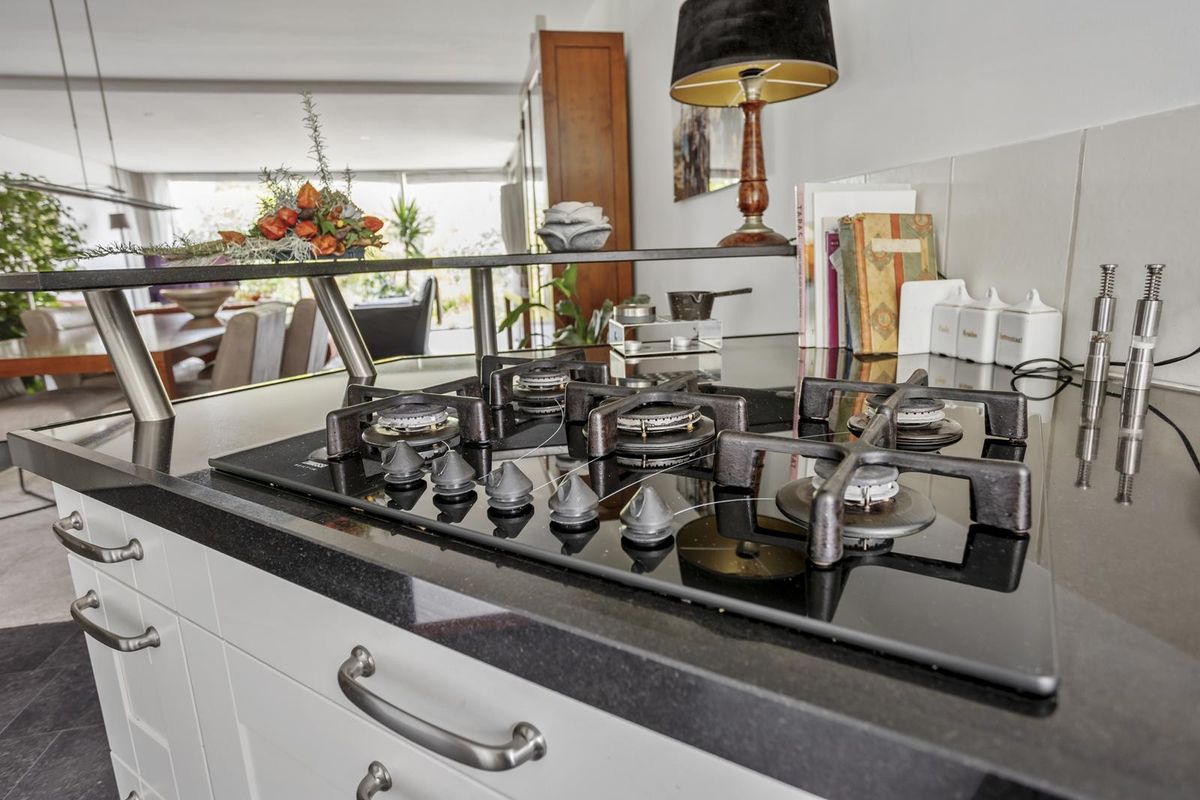 Aan de voorzijde bevindt zich de open keuken met een nette keukenopstelling, voorzien van diverse inbouwapparatuur: vaatwasser, koelkast, magnetron, afzuigkap en 5 pits gaskookplaat.