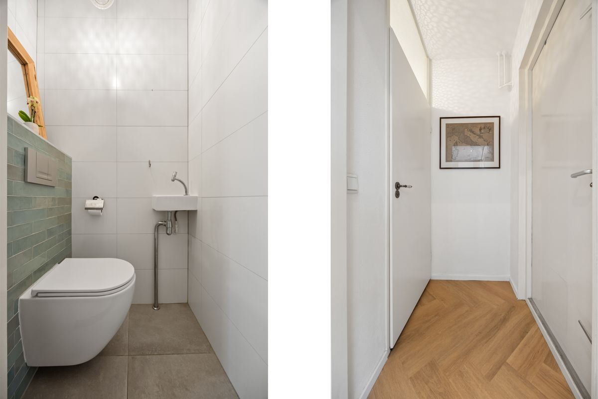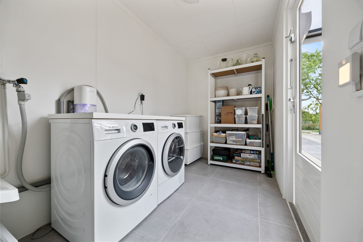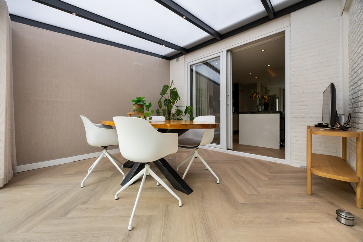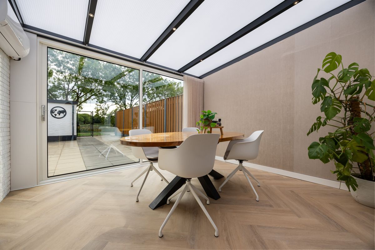 Via de schuifpui kom je in de serre, een heerlijk lichte en geïsoleerde ruimte met vloerverwarming, ideaal voor een grote eettafel of juist een extra zithoek. Het serredak is uitgevoerd met extra dikke carbonaatplaten van 32 mm (in plaats van de gebruikelijke 16 mm) en voorzien van een UV-laag, wat zorgt voor extra comfort en duurzaamheid. Aangrenzend vind je de praktische bijkeuken met wasmachine- en drogeraansluiting, veel bergruimte en toegang tot het toilet dat in 2023 is vernieuwd. In deze ruimte ligt geen vloerverwarming maar is er wel een radiator aanwezig.