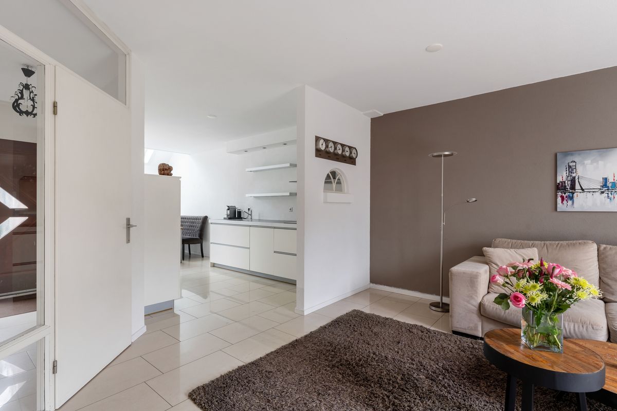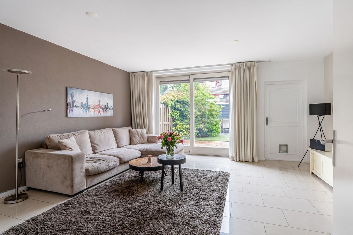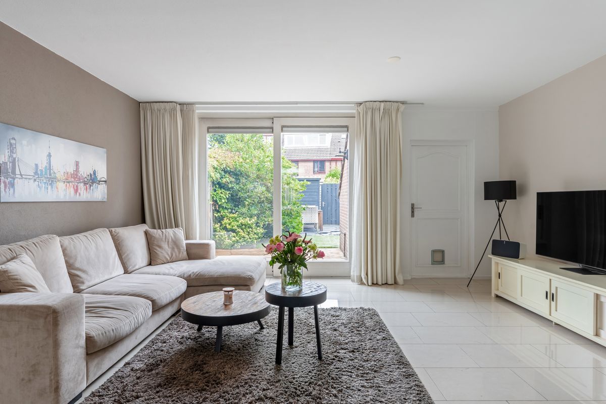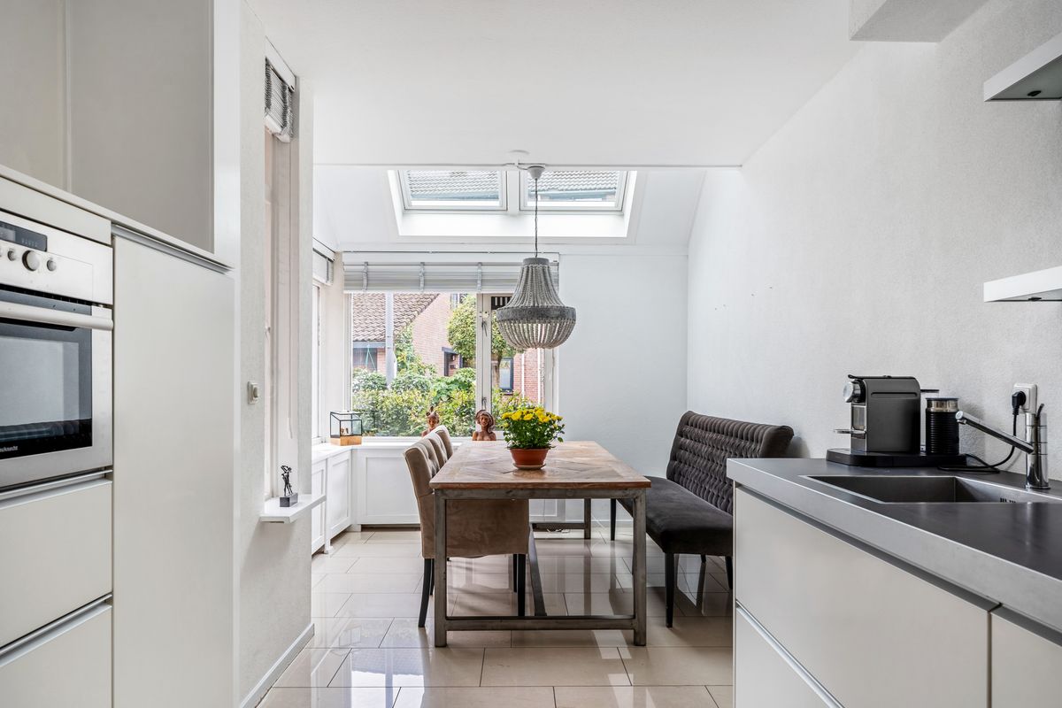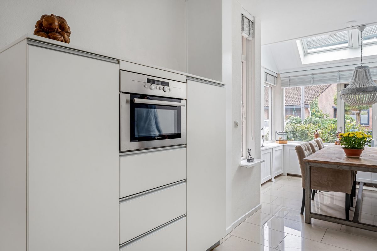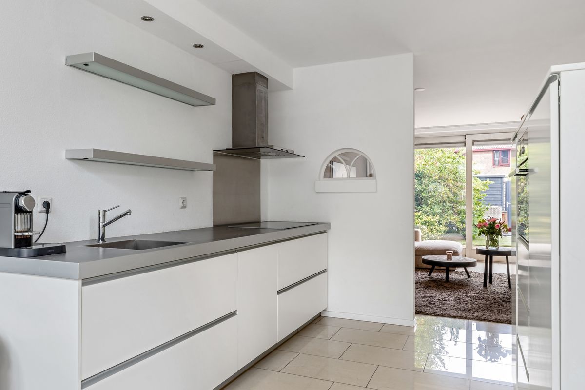 Ruime en lichte living met schuifpui naar zonnige achtertuin. Ruime open keuken met moderne keukenopstelling en grote raampartijen, veel bergruimte en de volgende inbouwapparatuur: 5-pits inductiekookplaat (2023), RvS afzuigschouw, combi magnetronoven, vaatwasser (2021), close-in boiler (2021) en koelkast (2020).