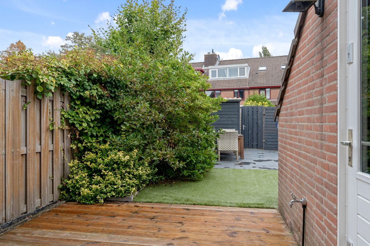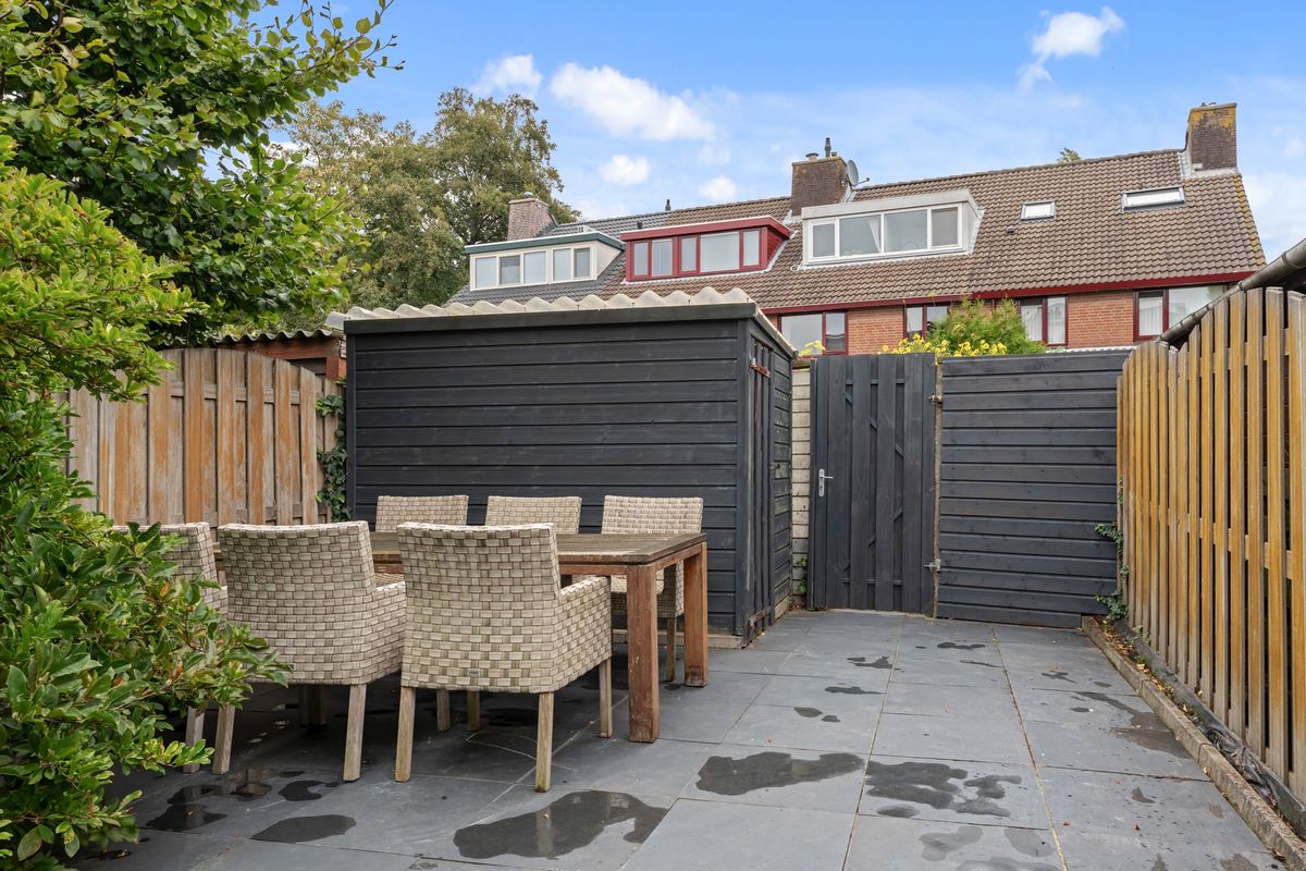 Fraaie en privacy volle achtertuin met achterom op het oosten met veel zonuren. Vrijstaande berging van ruim 4m2 met elektra.