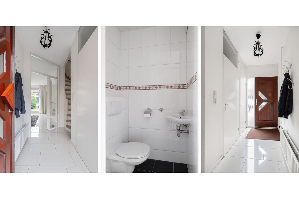 Fraai aangelegde voortuin. Entree, ruime hal met meterkast en garderobe, hangend toilet.
