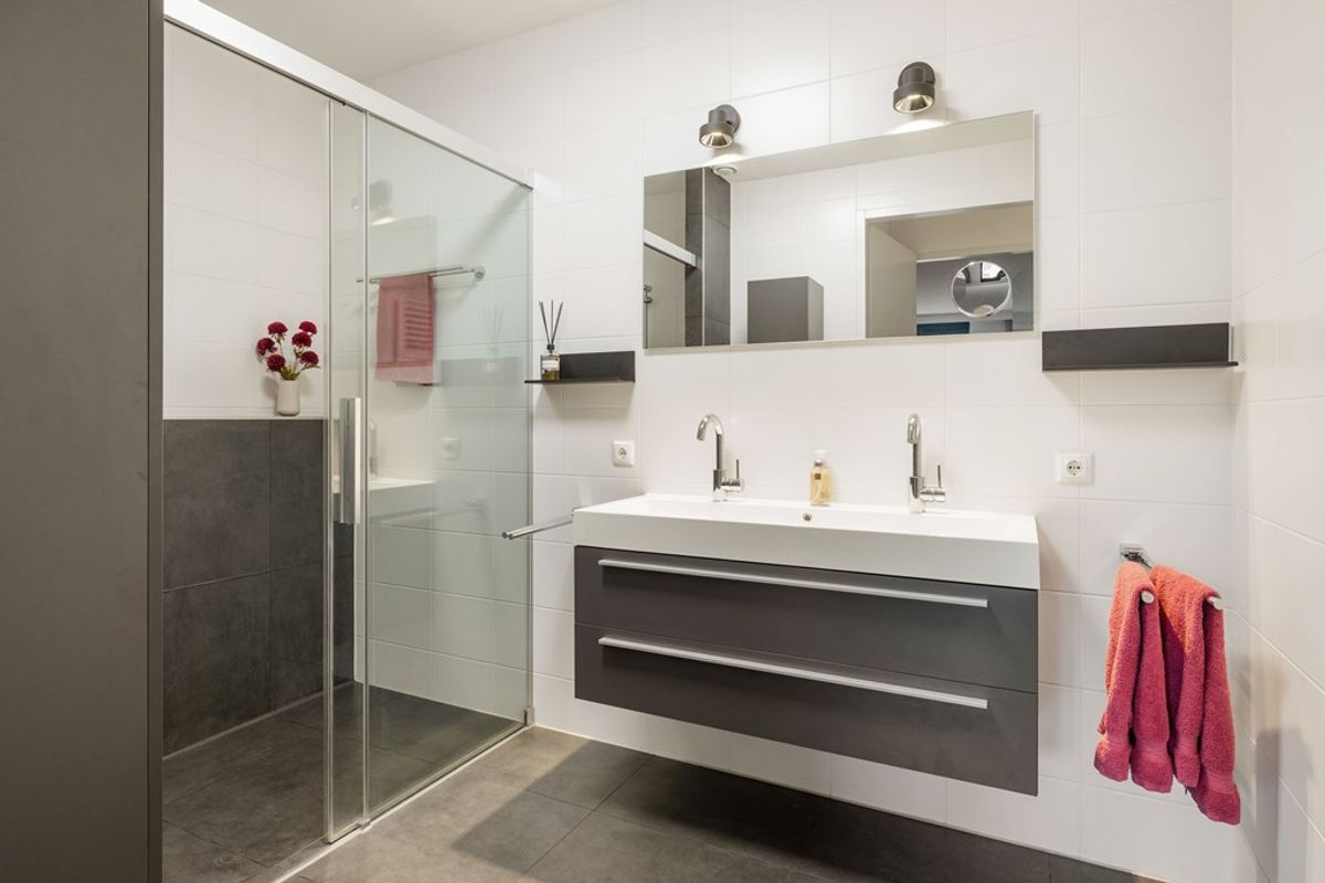 Het appartement beschikt over drie ruime slaapkamers, elk met een prettige lichtinval en voldoende indelingsvrijheid. De moderne badkamer is compleet uitgevoerd met een inloop regendouche, een dubbele wastafel met meubel en een toilet. In de hal bevindt zich daarnaast een separaat gastentoilet en een praktische berging met ruimte voor wasmachine en droger.