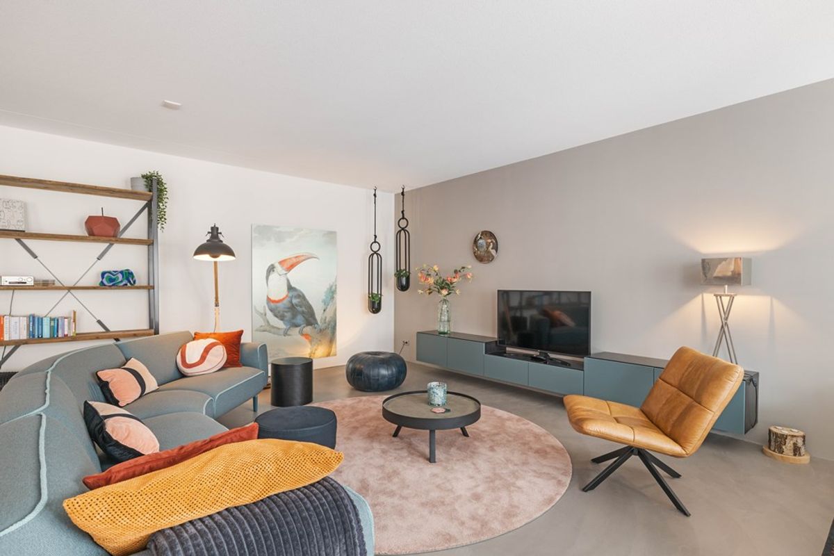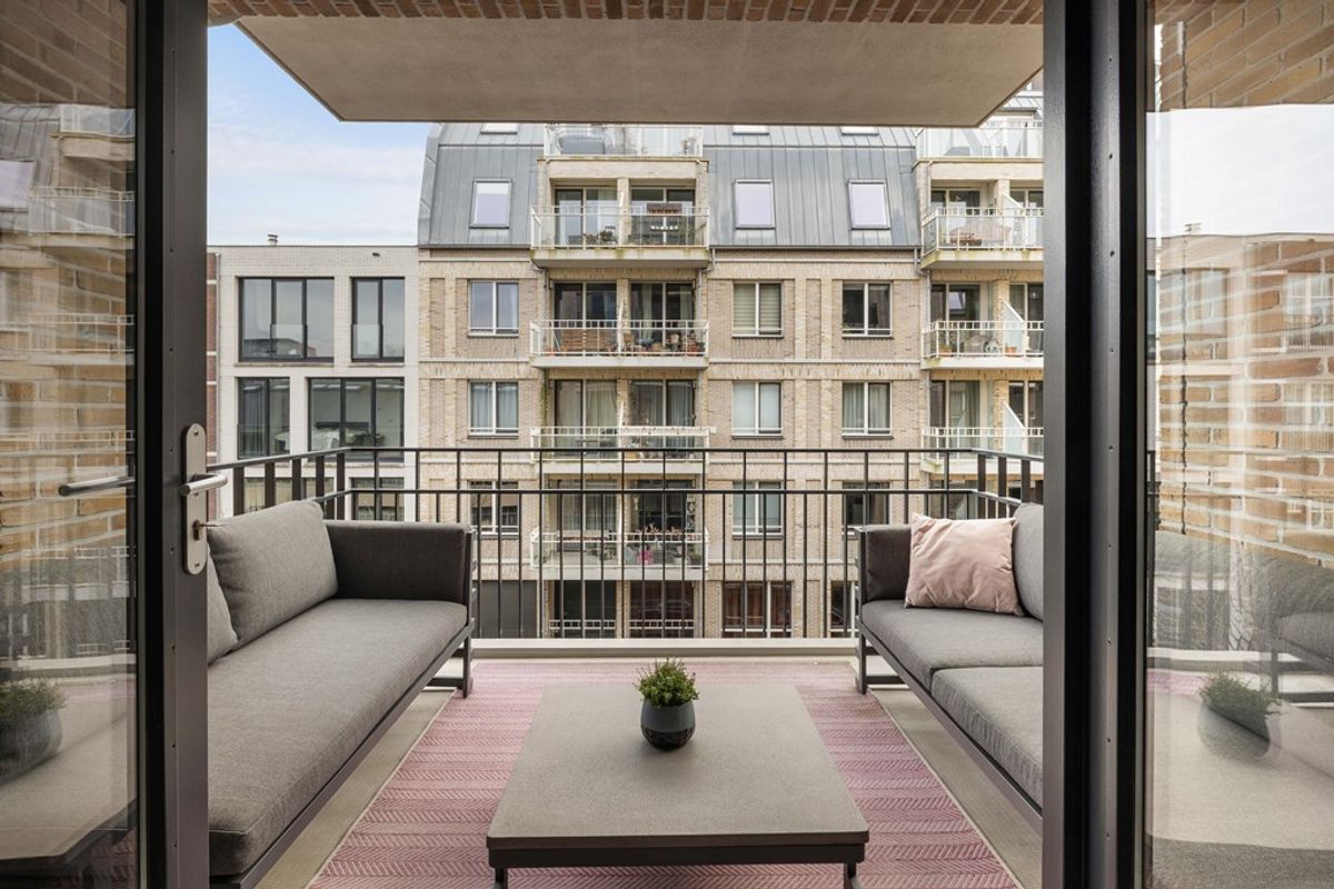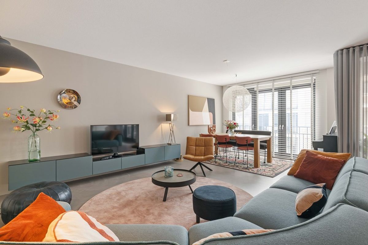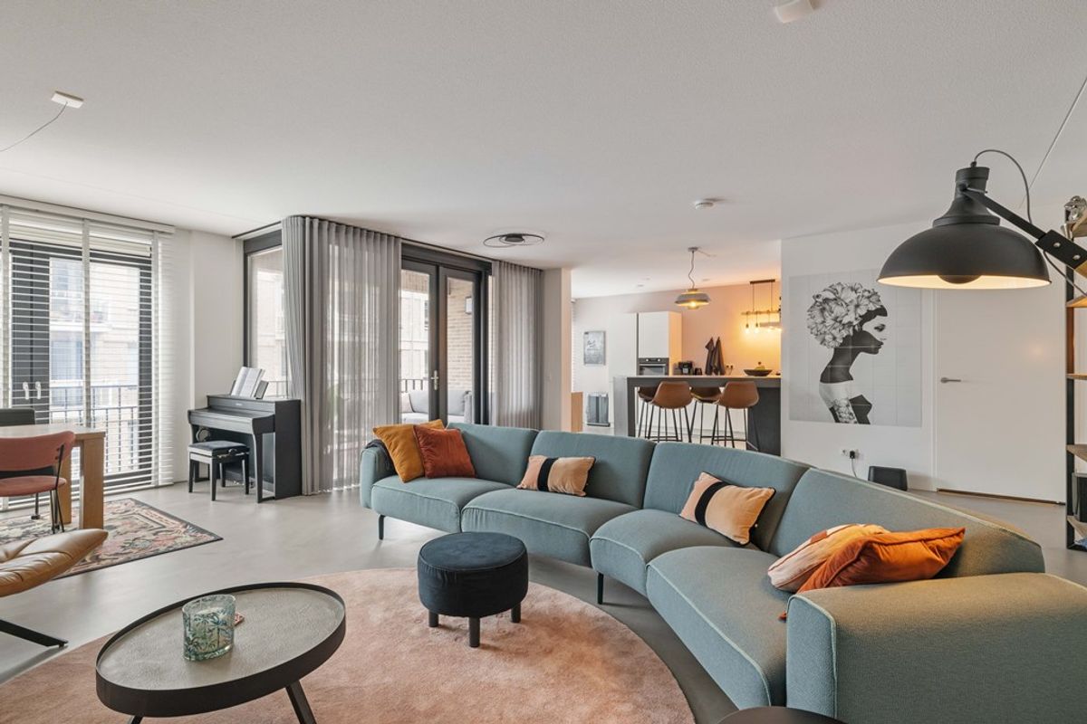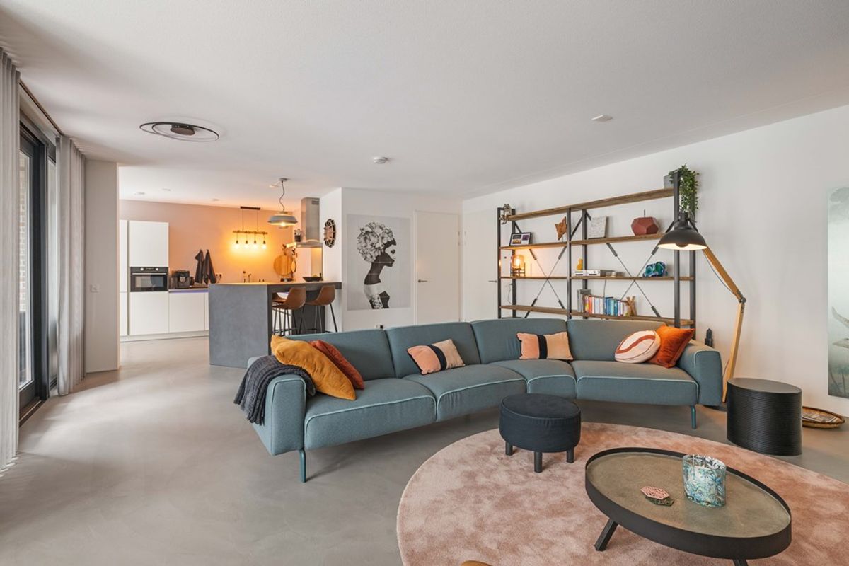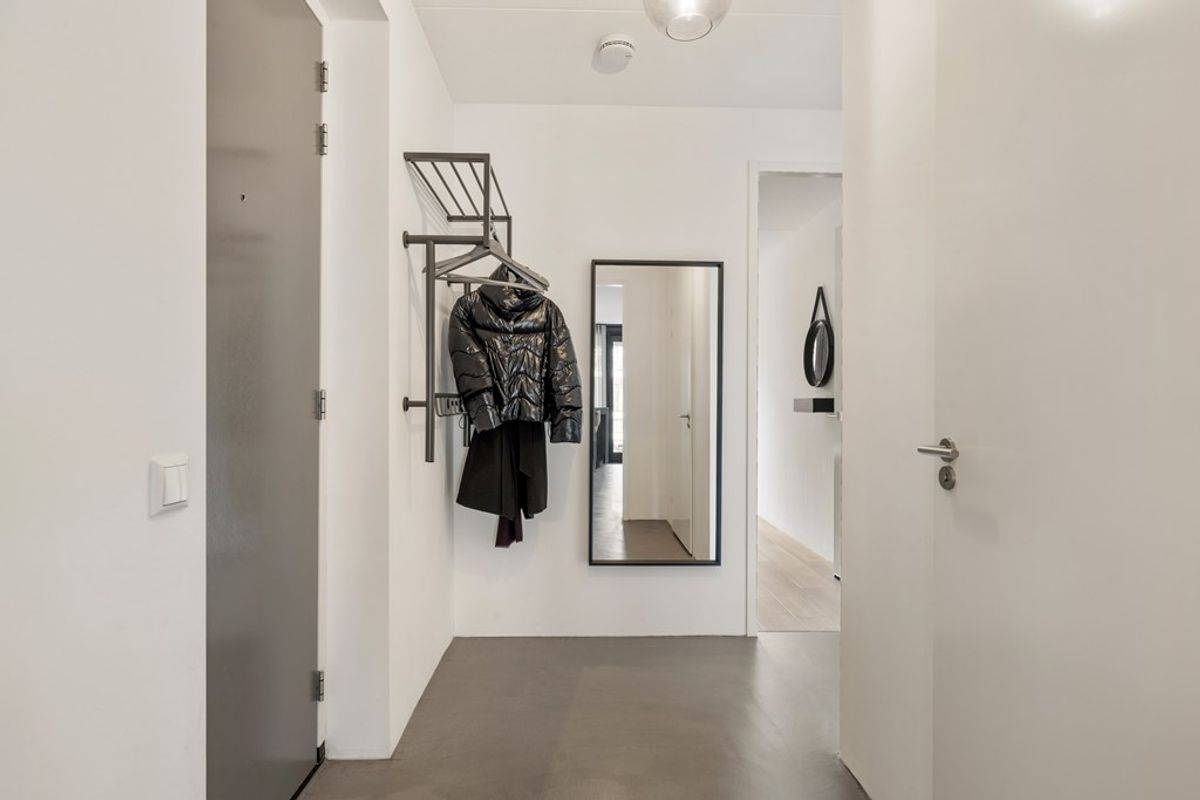 Het appartement is gelegen op de tweede verdieping van het complex en is tot in detail verzorgd en luxe afgewerkt. Via de hal bereik je de royale woonkamer, die dankzij de grote raampartijen veel licht ontvangt. De gietvloer en de openslaande deuren naar het zonnige terras op het zuiden versterken het ruimtelijke en comfortabele gevoel.