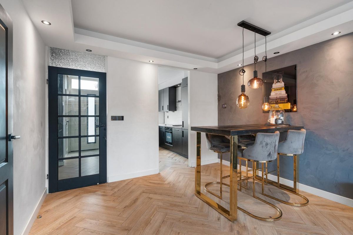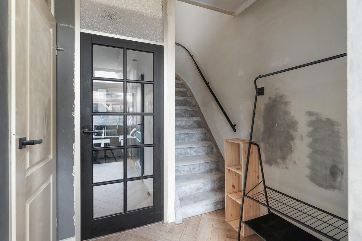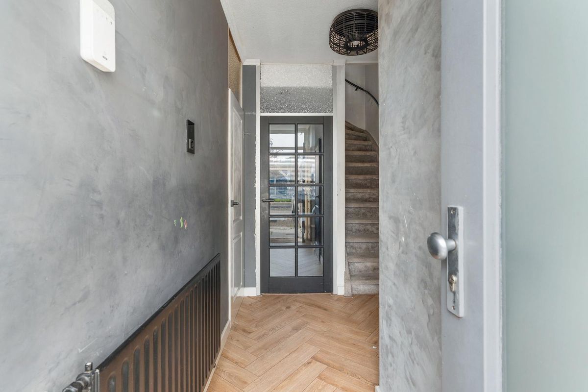 - Entree: Dit is de hal van de woning met een moderne visgraatvloer en strakke muren. Vanuit hier heb je toegang tot de trap, het toilet en de woonkamer via een stijlvolle zwarte glazen deur.