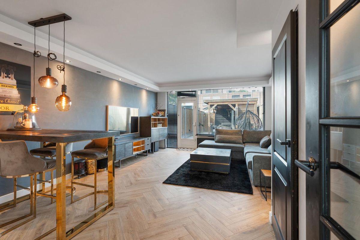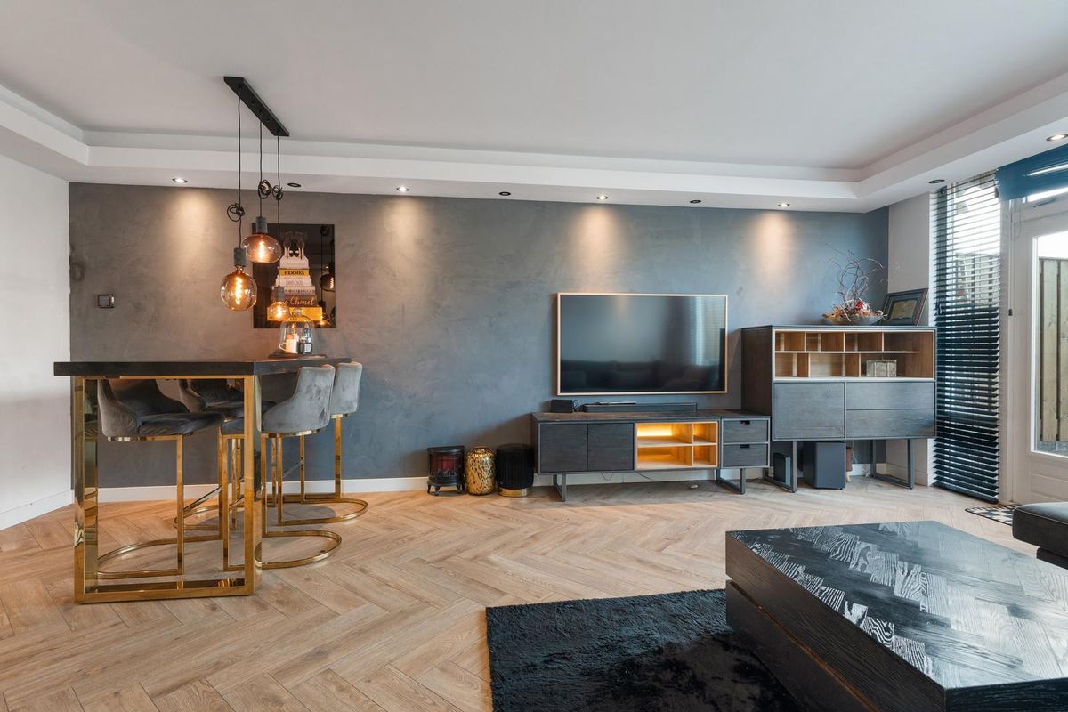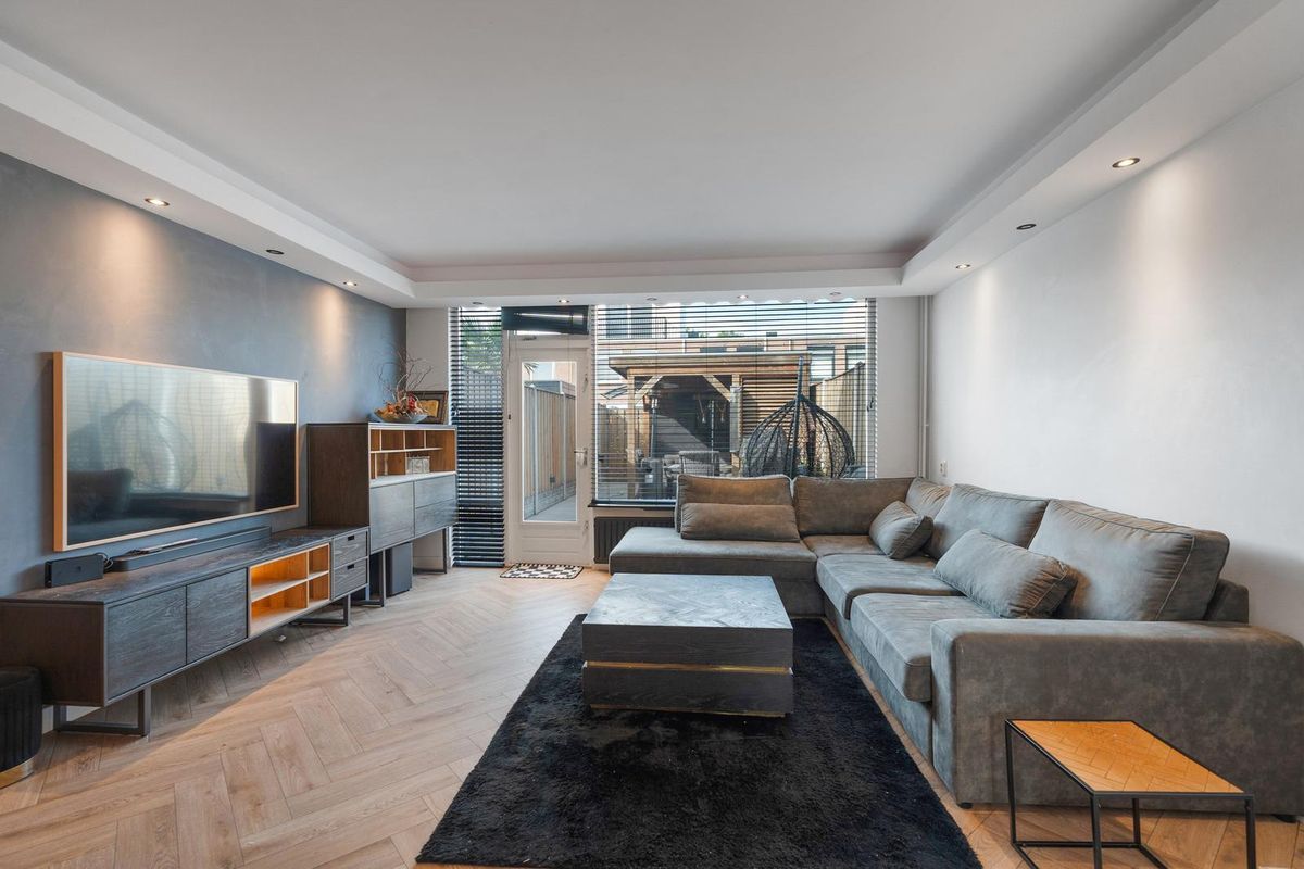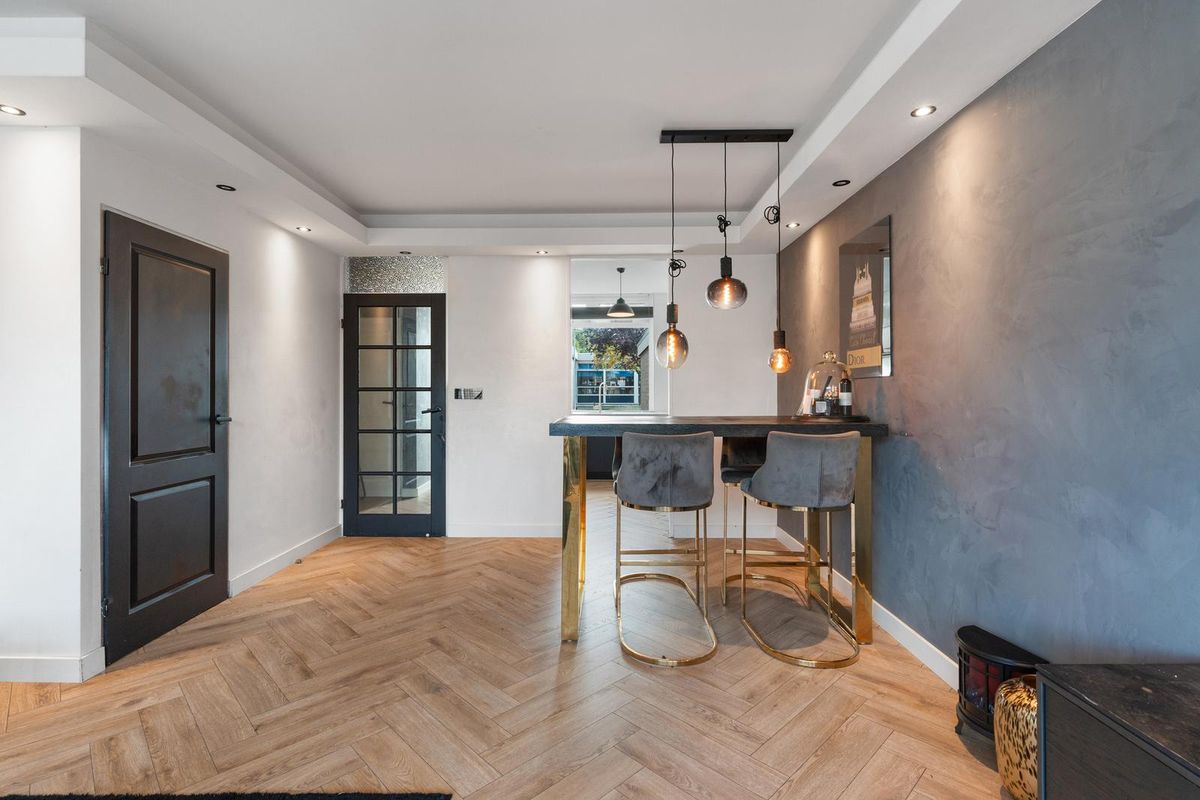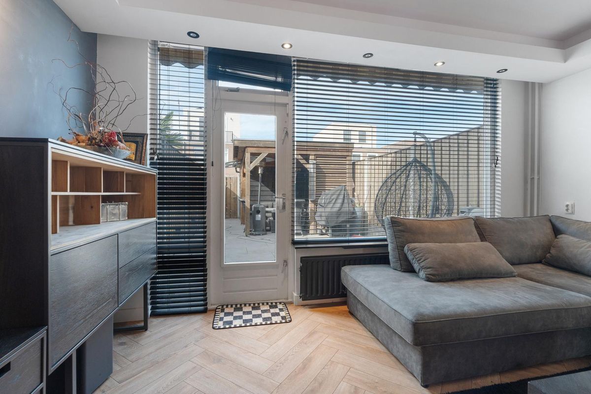 - Woonkamer: De woonkamer kenmerkt zich door een strakke afwerking met lichte wanden en een visgraatvloer die de ruimte een moderne uitstraling geeft. Dankzij de grote raampartijen valt er veel daglicht binnen en is er direct toegang tot de tuin. Daarnaast is er een vaste kast aanwezig, wat extra praktische opbergruimte biedt.