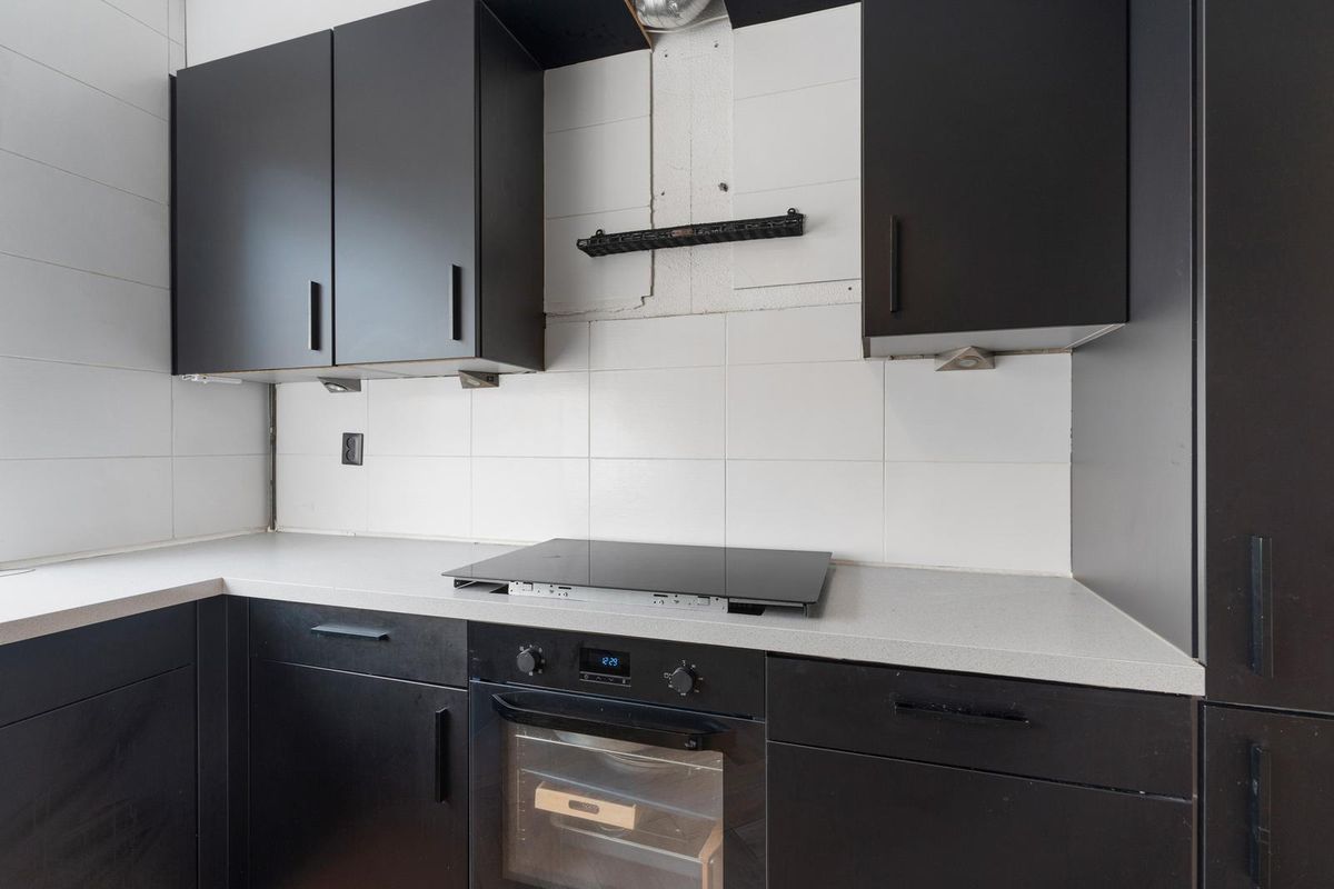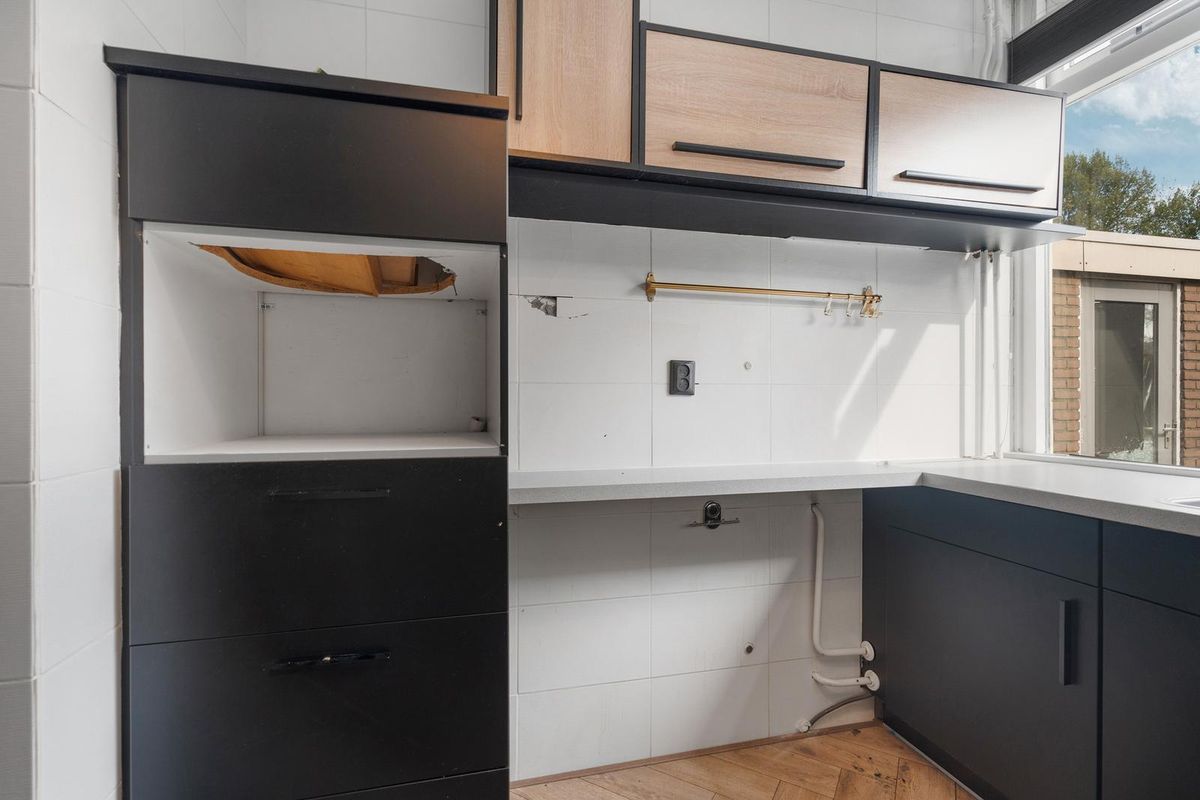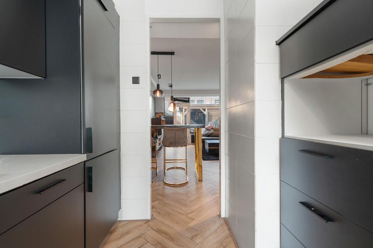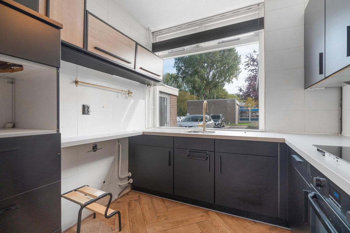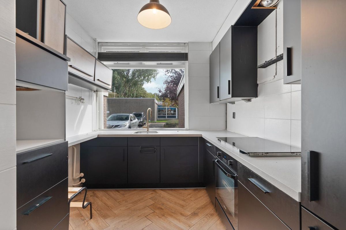 - Keuken: De keuken heeft een praktische hoekopstelling met een moderne uitstraling door de donkere kastfronten en het lichte werkblad. Het grote raam zorgt voor veel daglicht en uitzicht op de straatzijde, waardoor de ruimte licht en open aanvoelt.