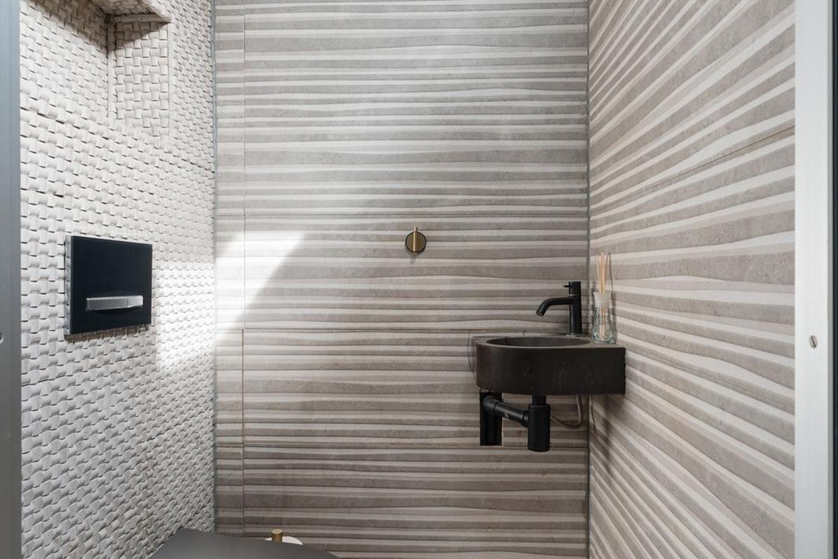- Toilet: Het toilet is volledig betegeld en heeft een moderne uitstraling. De combinatie van strakke wandtegels en een decoratieve tegelvloer geeft de ruimte een verzorgde en stijlvolle afwerking. Daarnaast is er een praktische nis aanwezig, ideaal voor het plaatsen van accessoires.