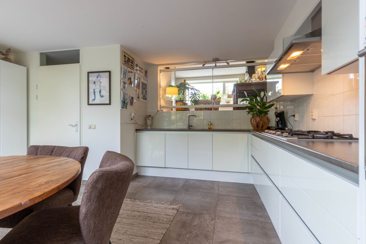 De eerste verdieping is opgesplitst in twee levels, de keuken en de woonkamer. Hier is genoeg ruimte voor een grote eettafel dus een echte woonkeuken. De keuken is uitgerust met onder meer een 5 pits gastoestel, vaatwasser, combi oven/magnetron, 10 liter boiler en een koel-/vriescombinatie. Er is toegang tot het rustig gelegen terras aan de achterzijde. Door de split level indeling is er aan de raamkant een vide naar de bovenliggend kamer. Aan de andere zijde is er een doorkijkje naar de woonkamer. De L-vormige woonkamer is ruim en licht en geeft op zijn beurt ook weer een doorkijk naar de hoger gelegen werkkamer boven de keuken. De keuken heeft een plavuizen vloer, de woonkamer een houten vloer in visgraat patroon gelegd.