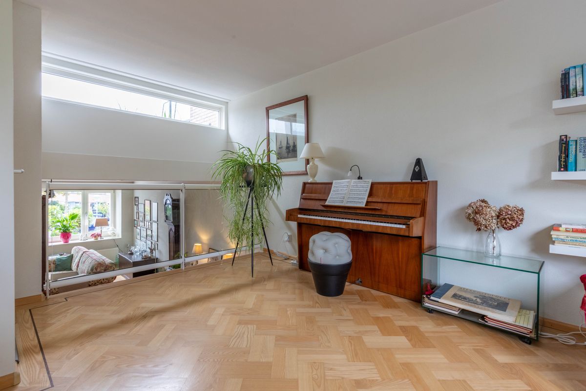 De videkamer schuin boven de woonkamer is een praktische ruimte. Inzetbaar als televisiekamer, werkkamer of eventueel te verbouwen naar slaapkamer. De kamer heeft aan de achterzijde connectie met de ondergelegen keuken. Vanuit deze kamer heeft u mooi uitzicht over park achter de woning. Ook deze kamer heeft een houten vloer in visgraat motief. De op de foto's aanwezige piano is overigens ter overname.