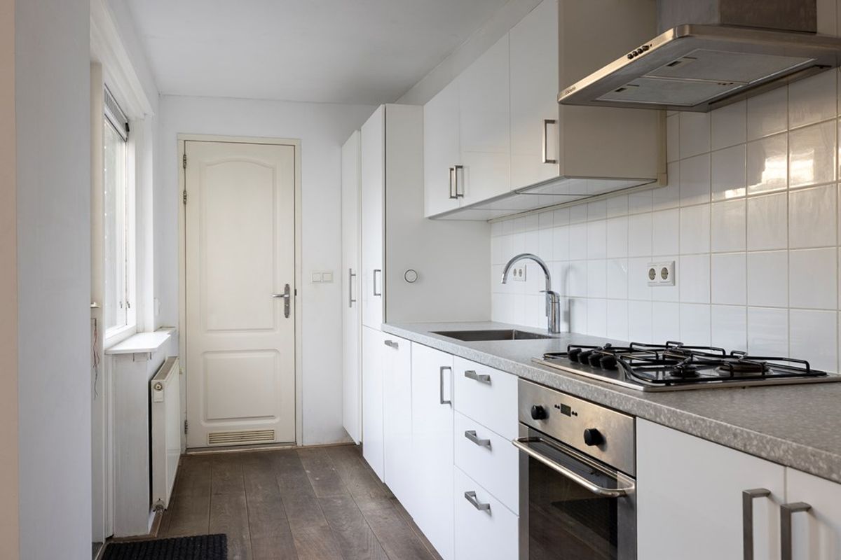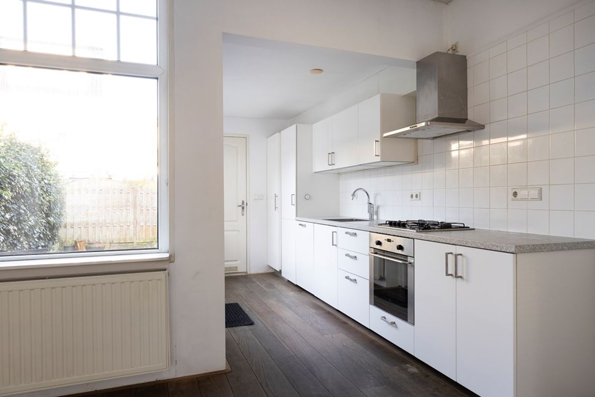 You enter the hallway with the renewed meter cupboard (2004). On the ground floor the property has a concrete floor, so there are no wooden joists anymore. At the end of the hallway you will find the staircase to the first floor and the door to the living room. The living room has high ceilings and an oak slatted parquet floor that can still be sanded if desired. At the rear of the property you will find the kitchen with built-in appliances. These include an oven, a fridge/freezer combination, a dishwasher and a 4-burner hob. The washing machine and dryer are also built into a cupboard here, neatly out of sight. In the kitchen you have instant hot water via the close-in boiler. Behind the kitchen is the first bathroom with a shower, washbasin and toilet. The rear garden is a good size and has rear access.