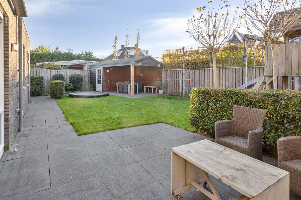 De achtertuin is een sfeervolle oase: met fraai groen, strakke bestrating, een gazon, en een houten berging met aangrenzende veranda. Dankzij de vrije ligging op het westen geniet je hier optimaal van de zon – van de eerste lentezon tot zwoele zomeravonden.