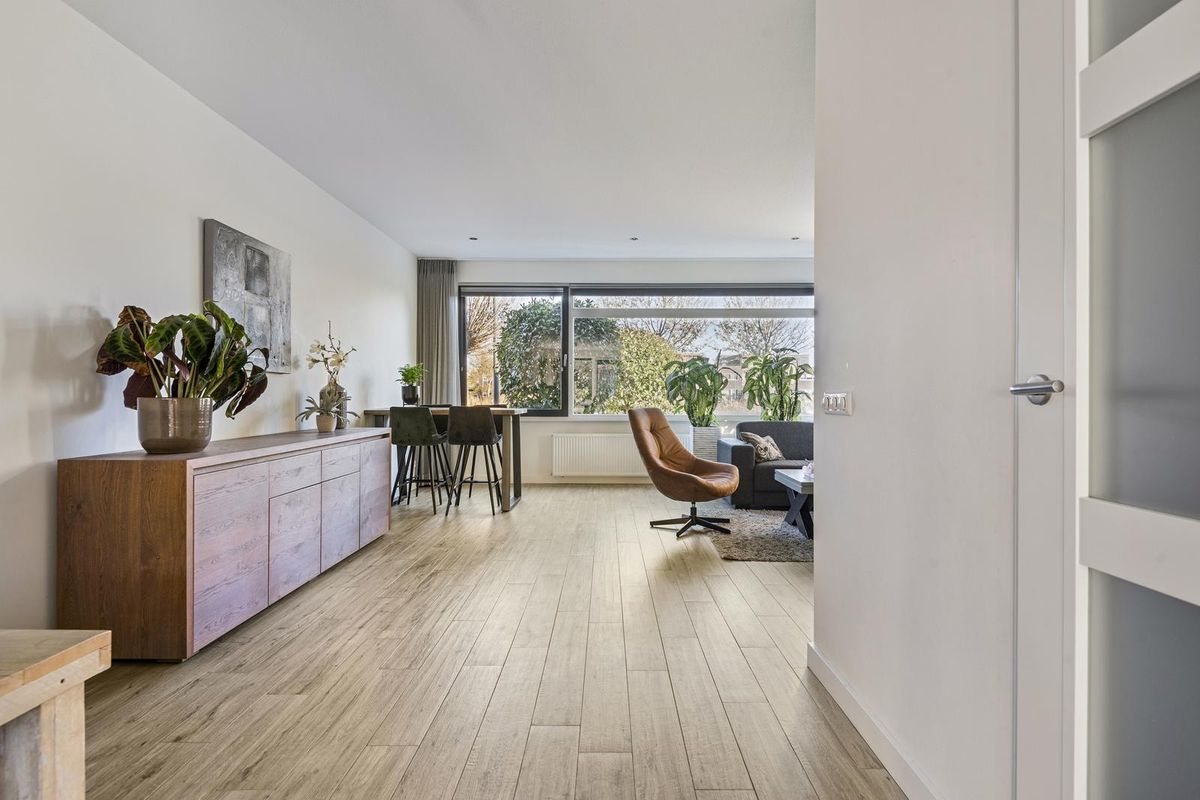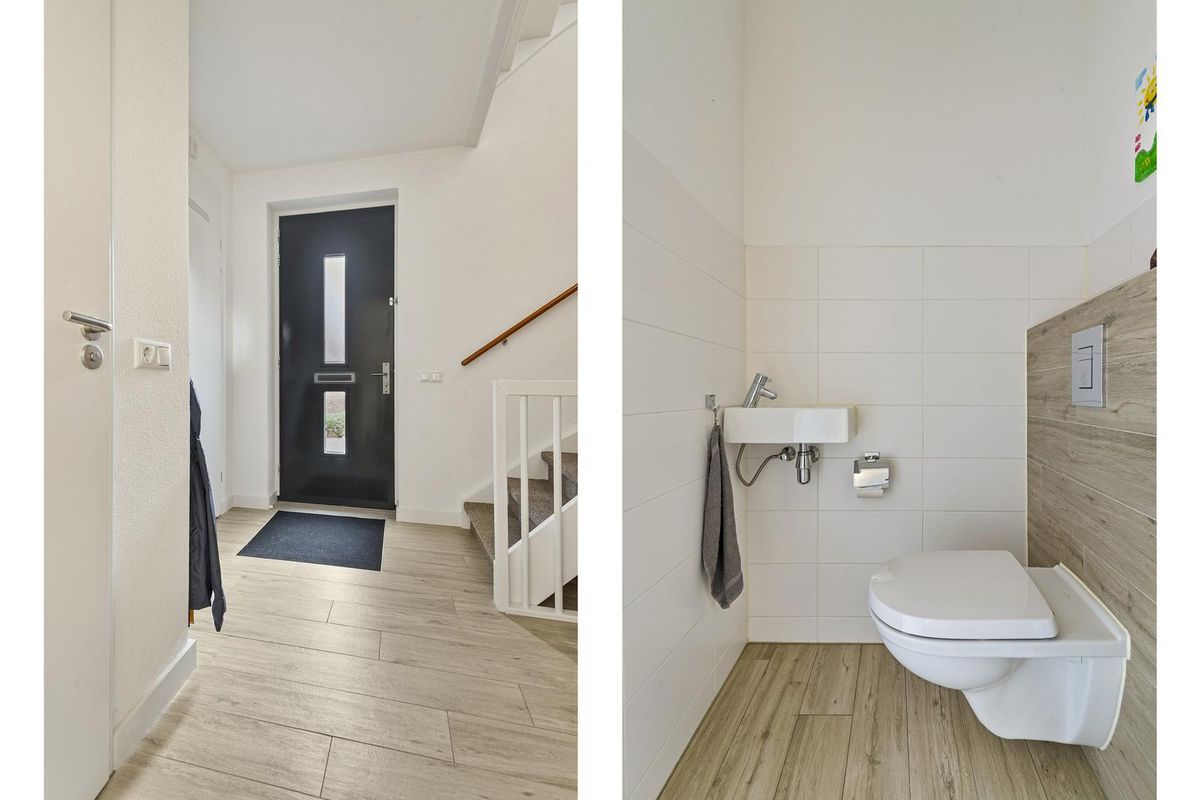 De ruime, lichte entree van de woning heet je van harte welkom en biedt toegang tot het toilet, de trapopgang, meterkast en natuurlijk de woonkamer.