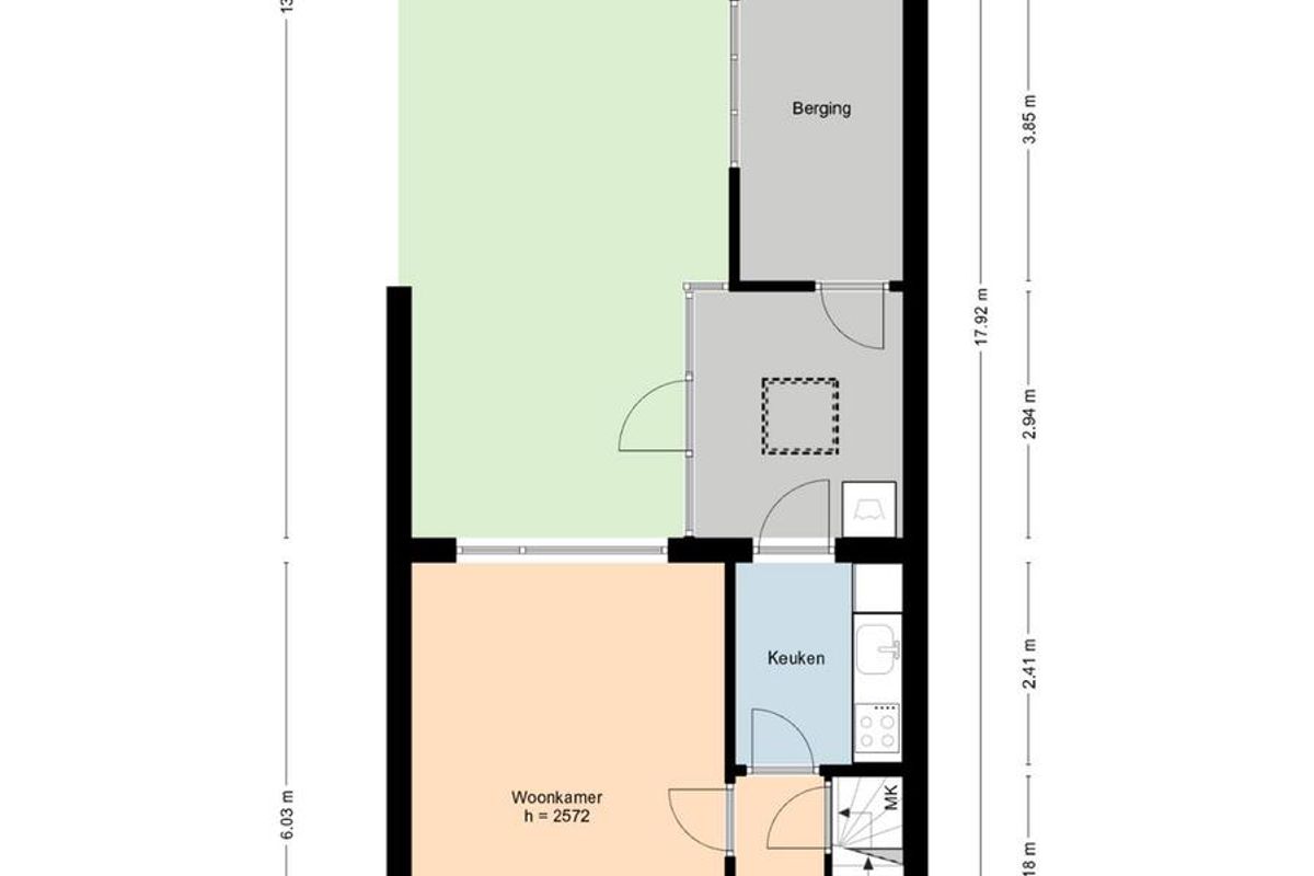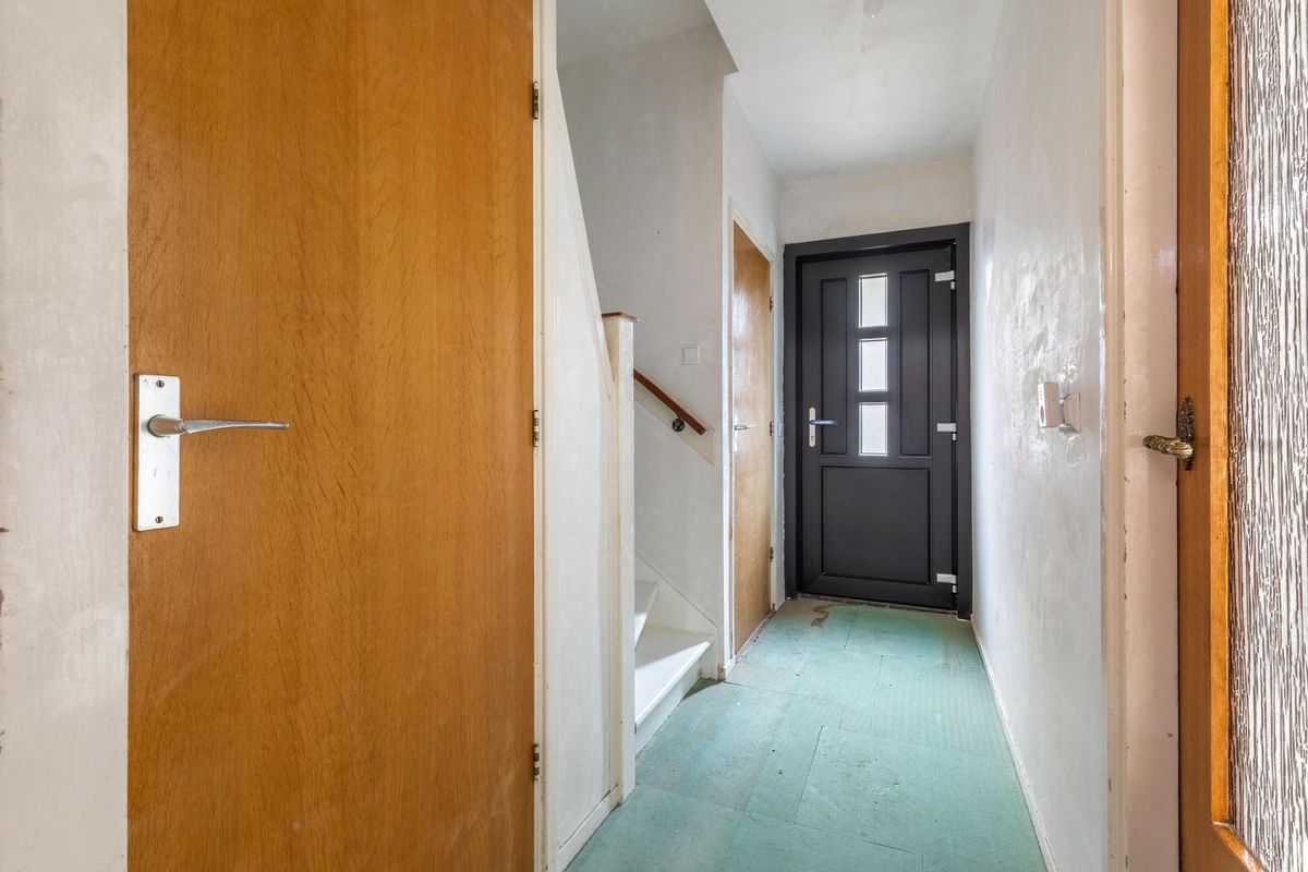 Entree met hal en vernieuwde meterkast (2025). Gezellige woonkamer met veel lichtinval door de nieuwe kunststof kozijnen. Aan de achterzijde bevindt zich de keuken, voorzien van elektrische kookaansluiting. Vanuit de keuken toegang tot de tuin met nieuwe schutting (2025).