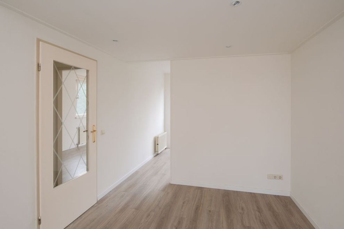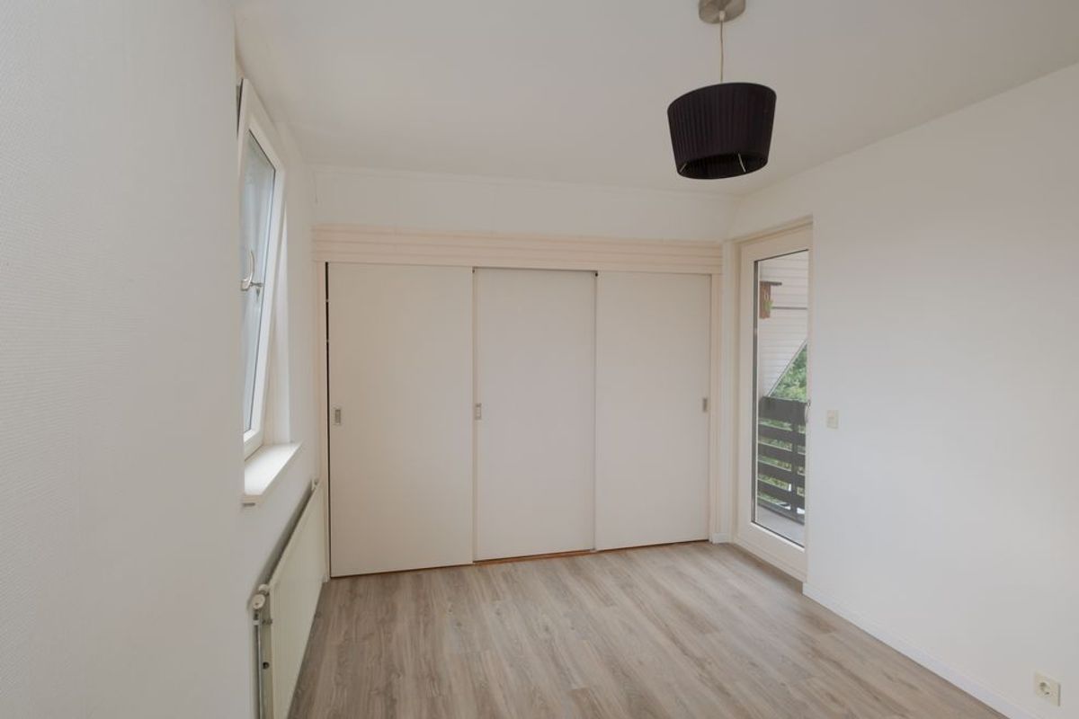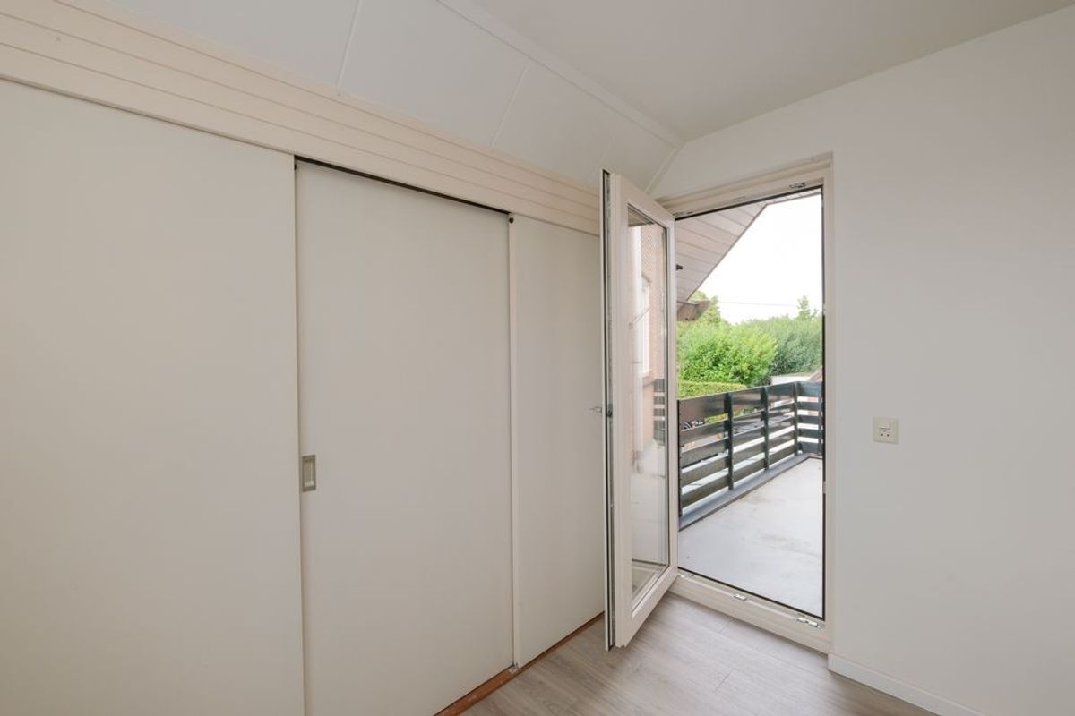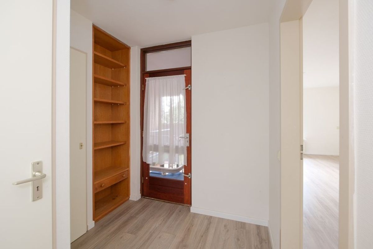 Daarnaast geeft de hal toegang tot een slaap-/hobbykamer. De woonkamer leidt naar een portaal dat toegang biedt tot de ruime slaapkamer en de badkamer.