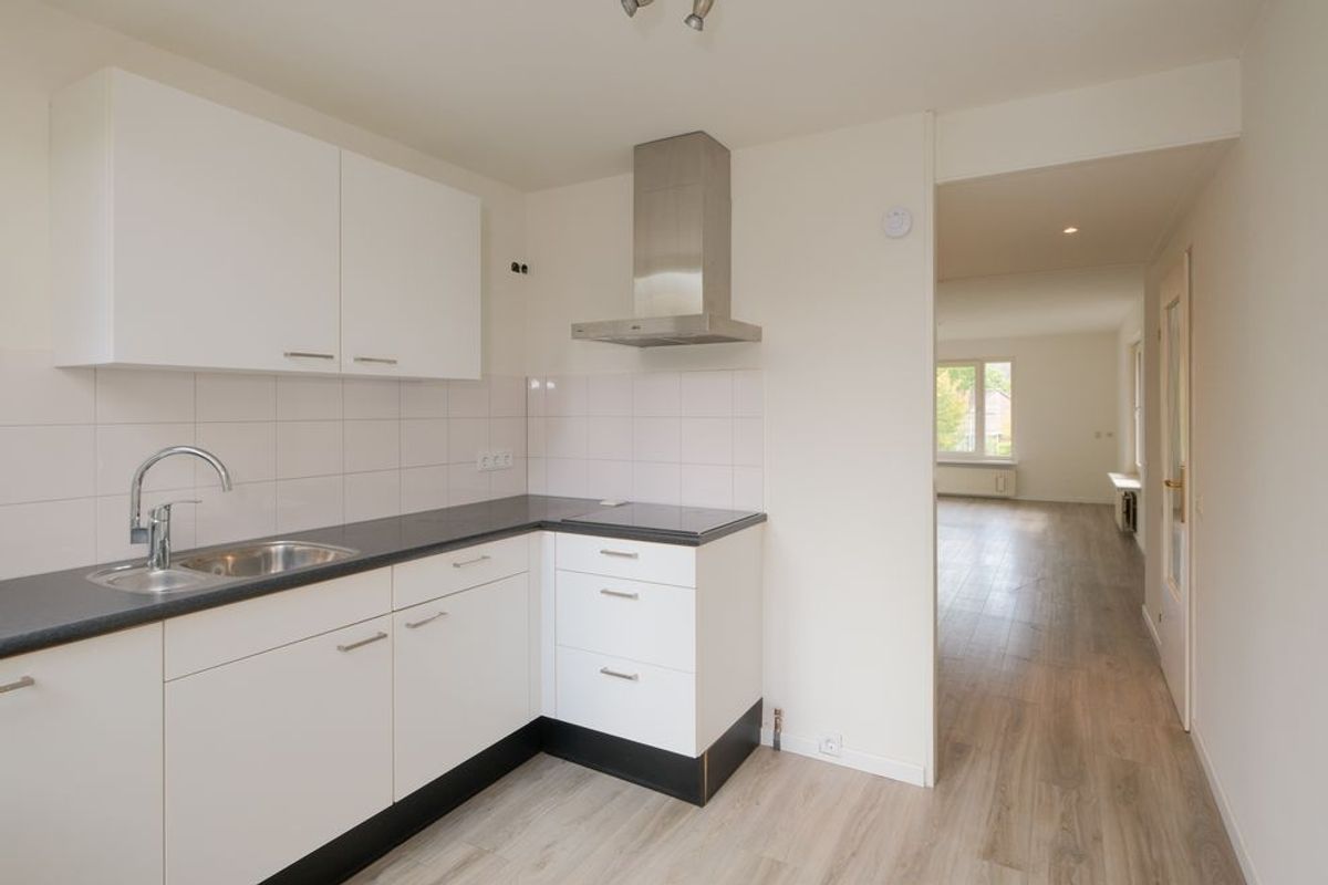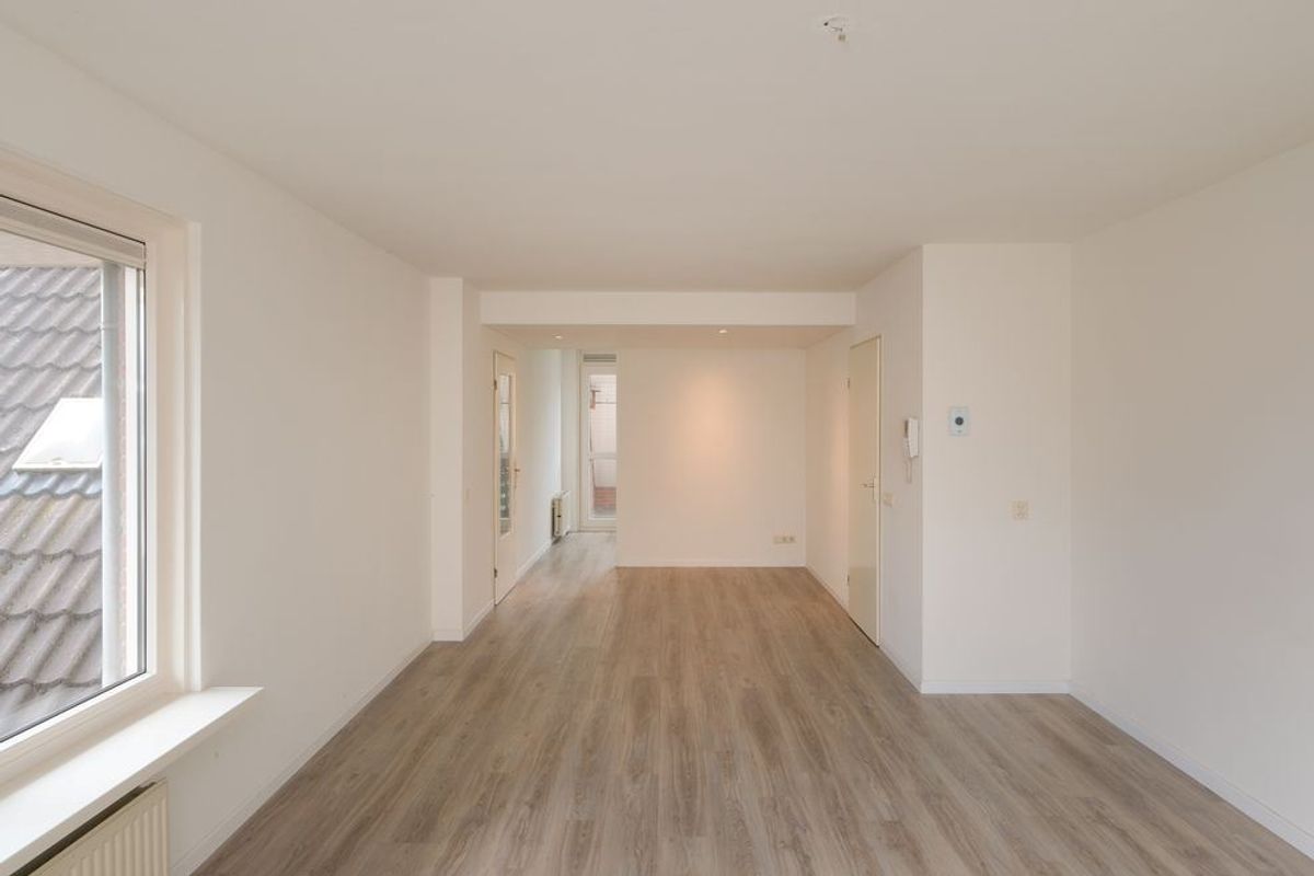 Via de vaste trap bereikt u het portaal van de eerste verdieping. Vanuit de voordeur stapt u binnen in de hal, waar zich de meterkast en het toilet bevinden. Vanuit deze hal heeft u toegang tot de royale woonkamer met open keuken. Vanuit de keuken bereikt u bovendien het balkon, waar u heerlijk buiten kunt zitten.