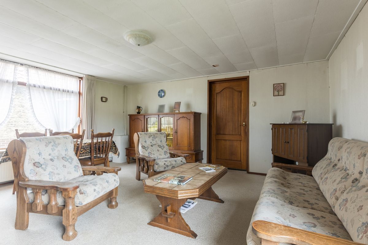Woonkamer met trapopgang en doorloop naar hal met kelderkast en twee slaapkamers.