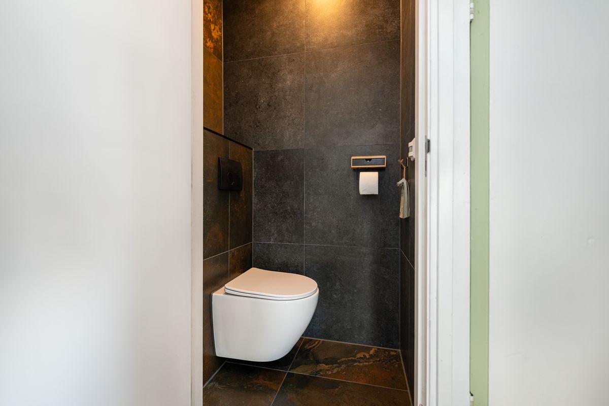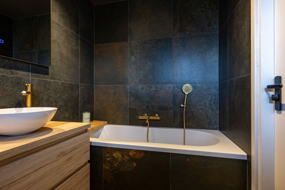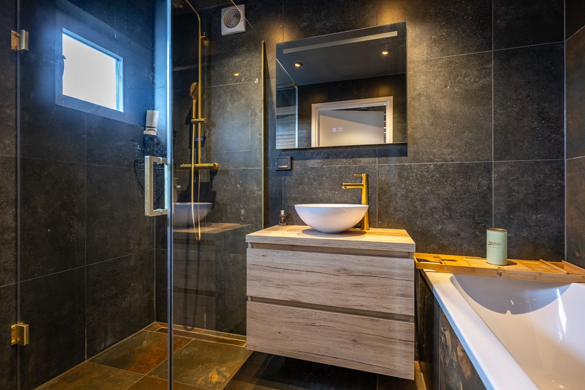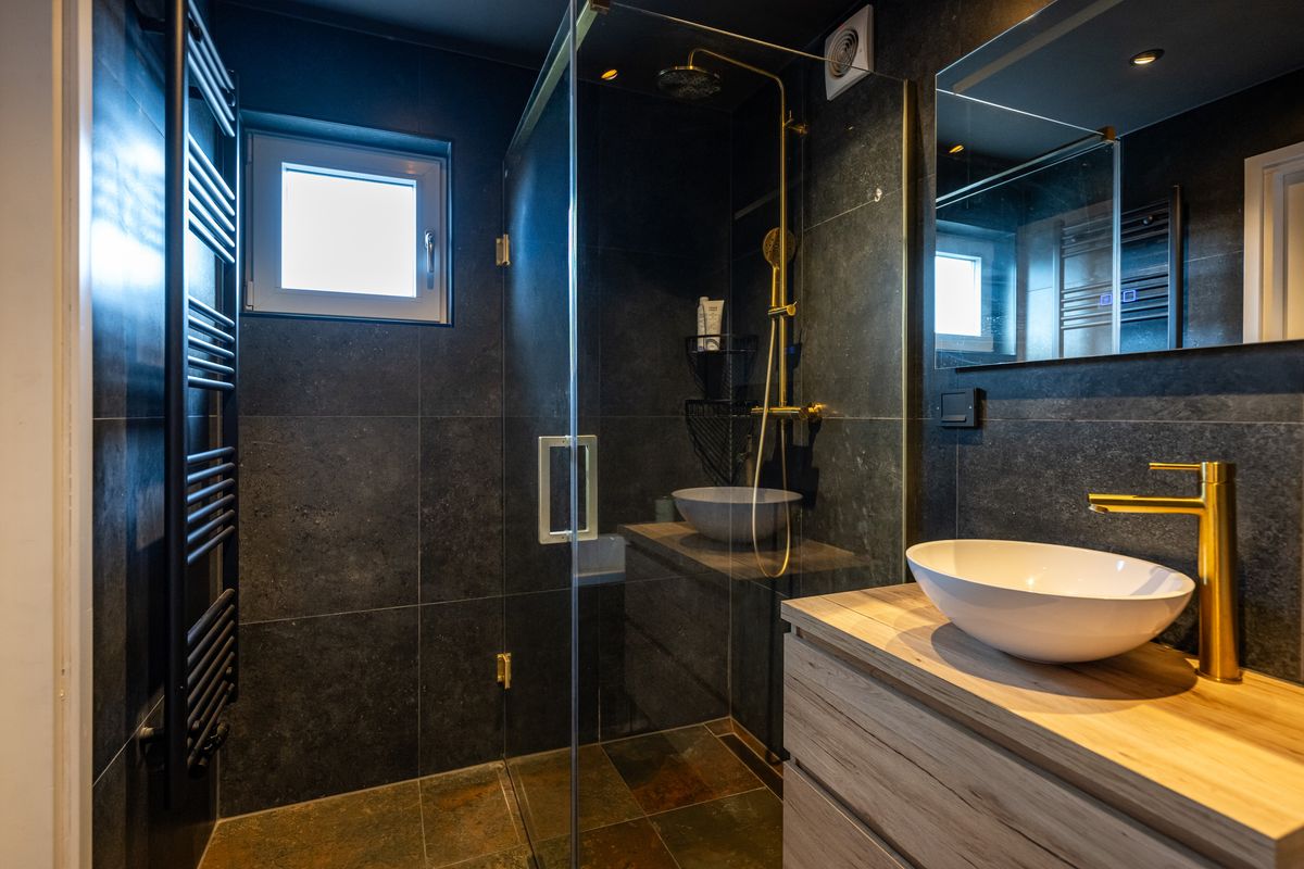 De moderne badkamer bevindt zich op de begane grond en is voorzien van eigentijdse tegels, een comfortabele inloopdouche, een ligbad, een stijlvol wastafelmeubel met waskom en vloerverwarming. Alles voelt fris, nieuw en klaar voor jarenlang woonplezier.