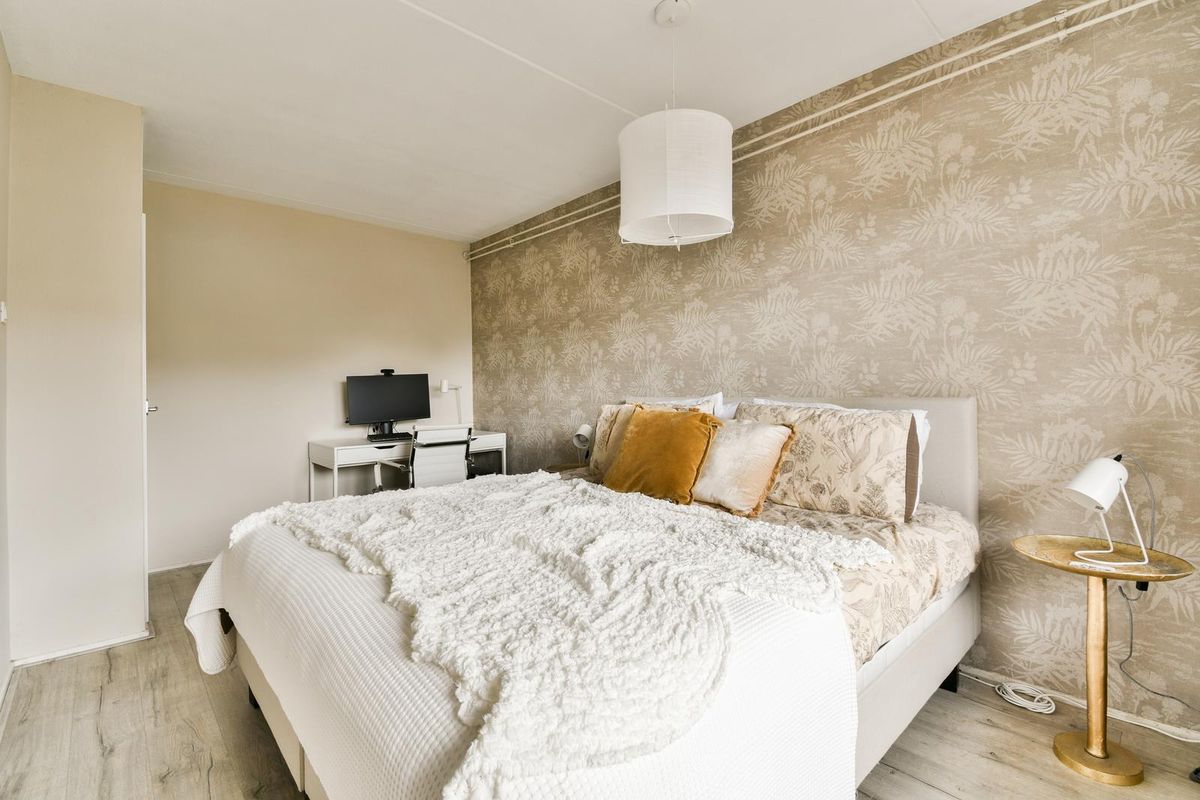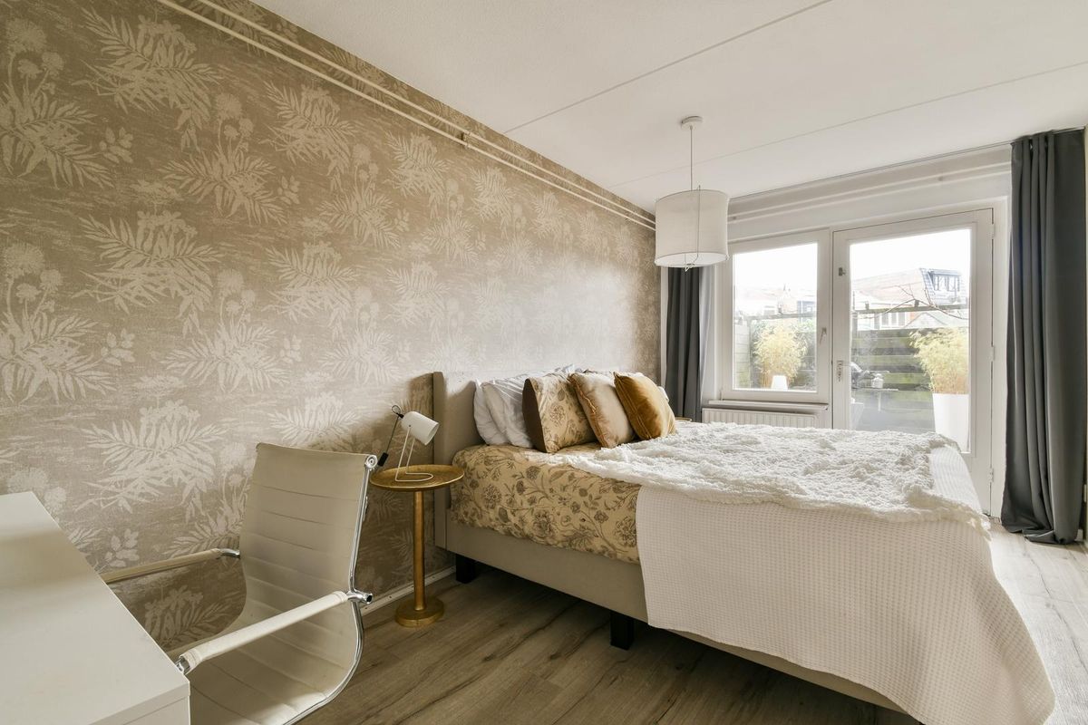 De woning beschikt over twee slaapkamers, die zich beiden aan de achterzijde van de woning bevinden en uitkijken op de tuin. De hoofdslaapkamer is ruim van formaat en biedt directe toegang tot de tuin een heerlijke, rustige plek om te ontspannen. De tweede slaapkamer, gelegen naast de hoofdslaapkamer, kan uitstekend worden gebruikt als kledingkamer, logeerkamer, kinderkamer of werkkamer.