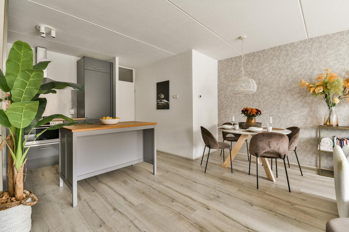 Aan de voorzijde ligt de sfeervolle woonkamer met uitzicht over het water. De ramen zorgen voor prettig natuurlijk licht en dragen bij aan de open, rustige sfeer van de ruimte. De open keuken is voorzien van diverse inbouwapparatuur, waaronder een vaatwasser, een 5-pits gasfornuis met oven, een afzuigkap en een dubbele koelkast met vriesgedeelte. Daarnaast is er een praktisch kookeiland waar u uw maaltijden kunt bereiden en extra bergruimte tot uw beschikking heeft.