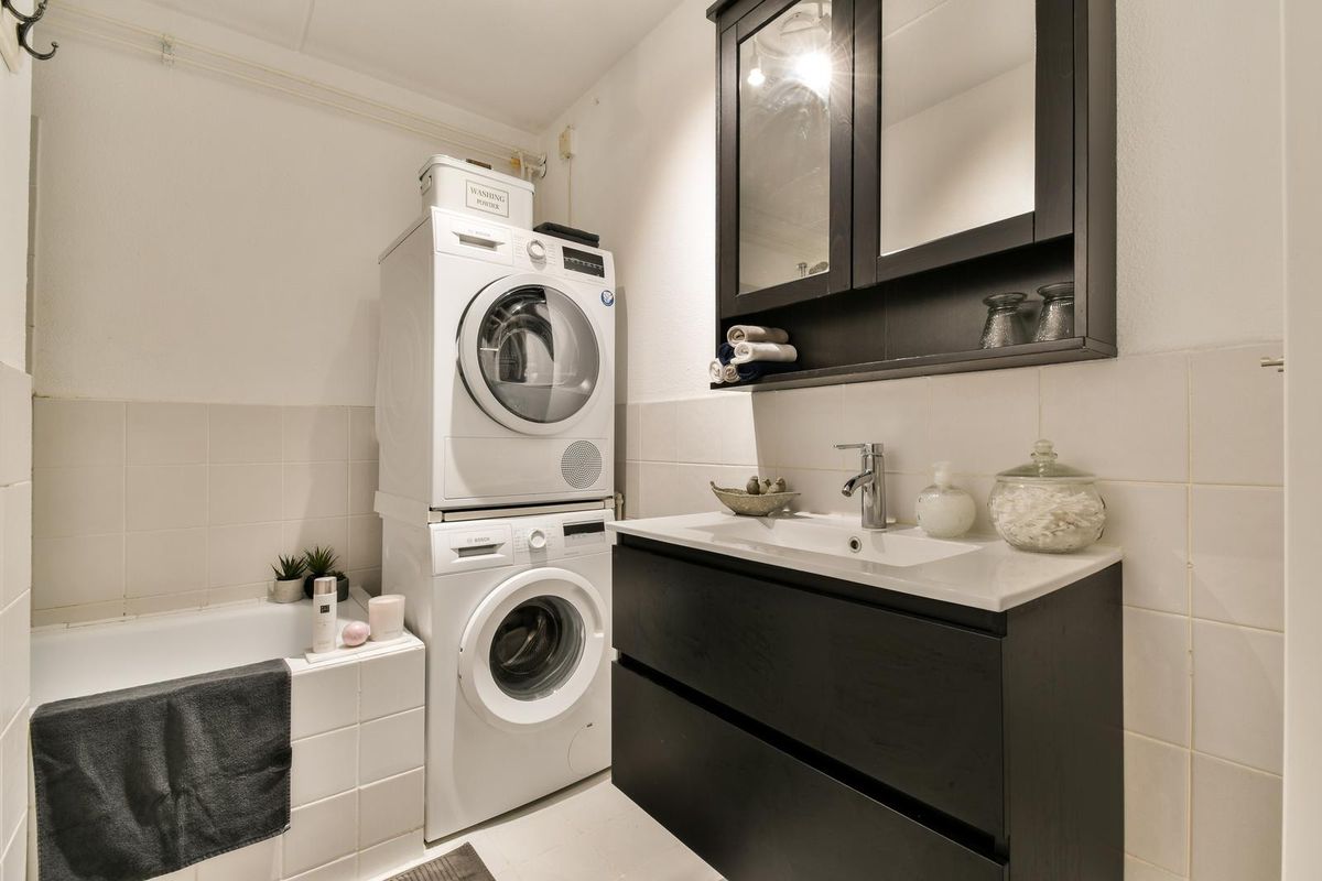 De badkamer is verzorgd uitgevoerd en voorzien van een ligbad, een modern wastafelmeubel en de aansluiting voor de wasmachine.