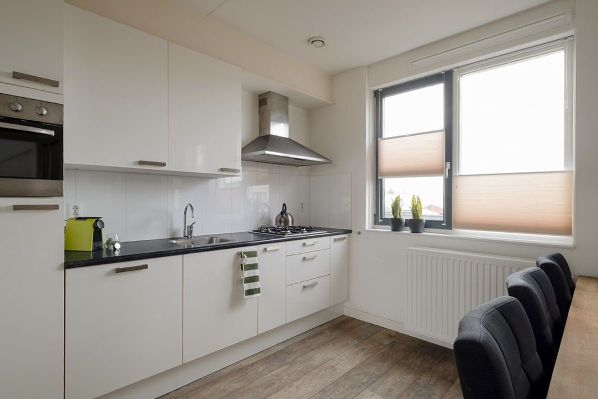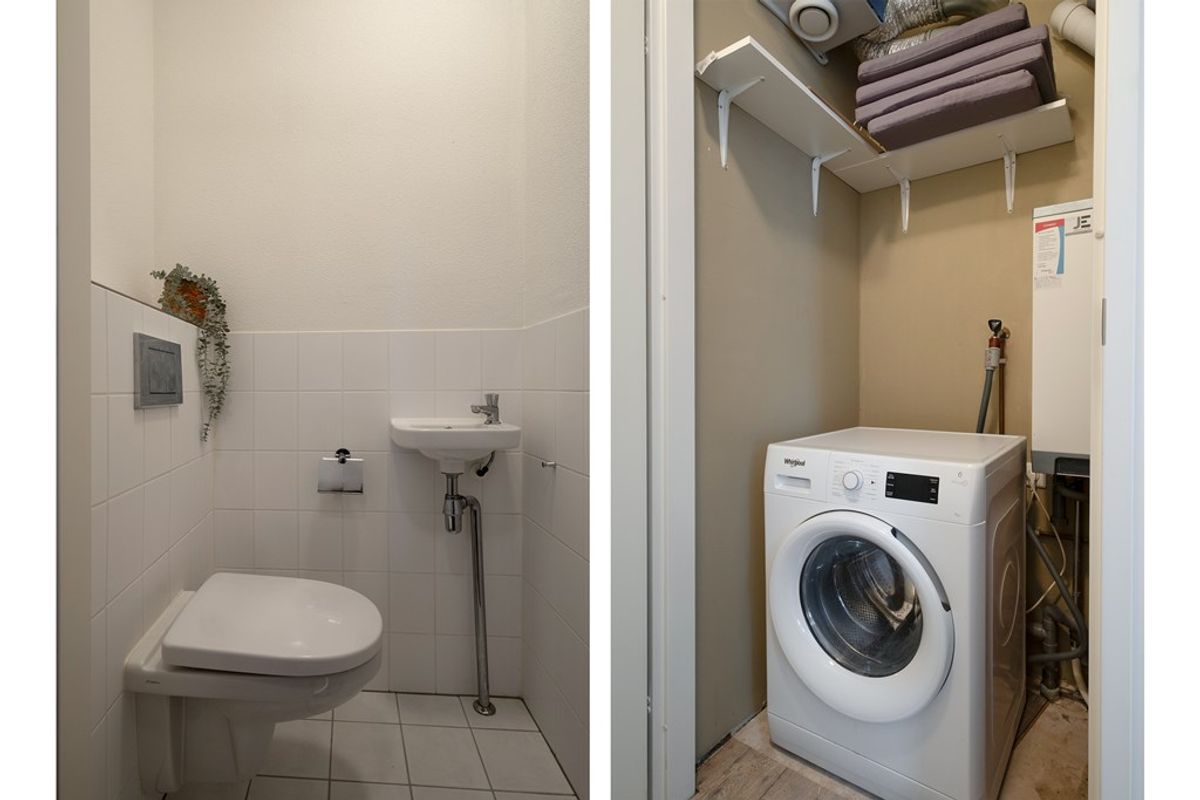 Op de eerste verdieping bevindt zich de royale en lichte woonkamer met grote raampartijen en een deur naar het balkon. Aangrenzend ligt de open keuken, voorzien van diverse inbouwapparatuur: koelkast, vaatwasser, combi-oven/magnetron, 4-pits gasfornuis en afzuigkap. De ruimte is groot genoeg voor een gezellige eethoek. Tevens vindt u hier een praktische inpandige berging met de CV-installatie en aansluitingen voor wasmachine en droger. In de naastgelegen gang bevindt zich eveneens het moderne toilet.
