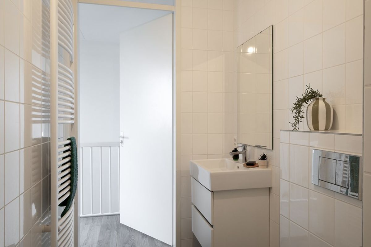 De tweede verdieping bereikt u via een lichte overloop die toegang biedt tot twee slaapkamers. De hoofdslaapkamer is royaal van formaat en biedt volop ruimte voor een grote kledingkast. De tweede kamer leent zich uitstekend als slaapkamer, thuiskantoor of logeerkamer. De badkamer is modern uitgevoerd, geheel betegeld en voorzien van een comfortabele inloopdouche, wastafelmeubel en tweede toilet.
