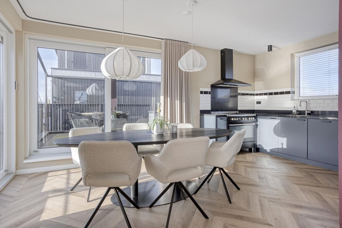Entree met hal, toilet en trap naar de benedenverdieping. De woonkamer en open keuken liggen op deze verdieping. Grote raampartijen zorgen voor veel licht en een sfeervolle verbinding met het water. Vanuit de keuken is er toegang tot het zijterras, een heerlijke plek om buiten te zitten en te genieten van de omgeving.