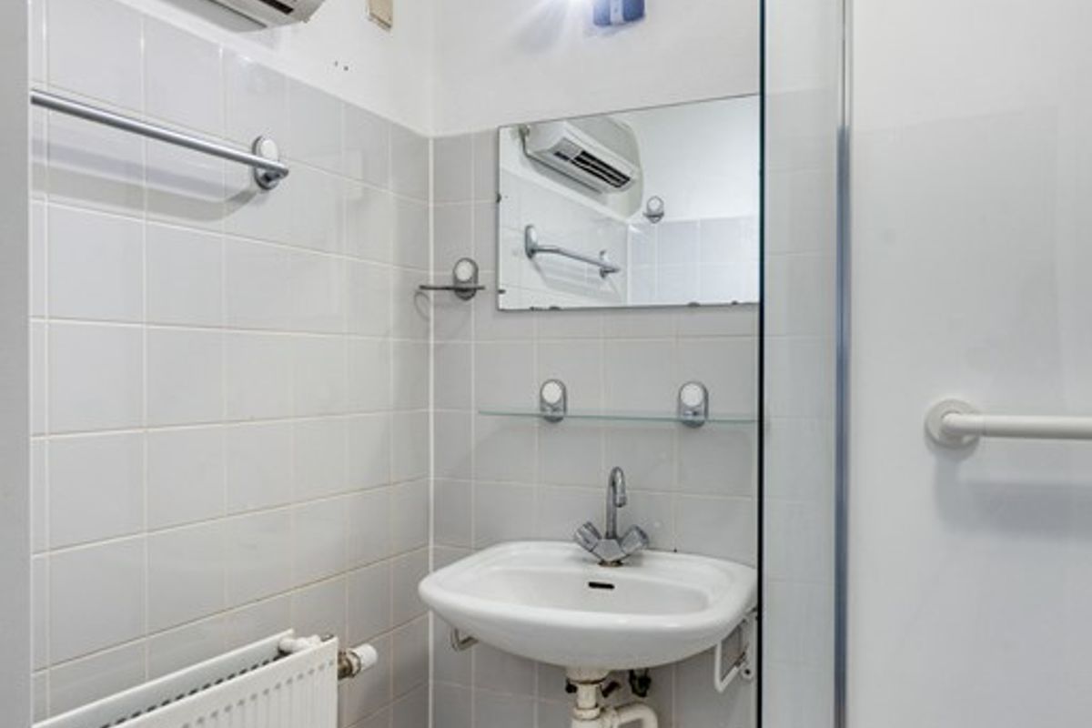 De ruime is voorzien van een douchecabine en een vaste wastafel in lichte kleurstelling, volledig betegeld. Er is een aparte wasruimte met ruimte voor de wasmachine en droger en voldoende opslagruimte.