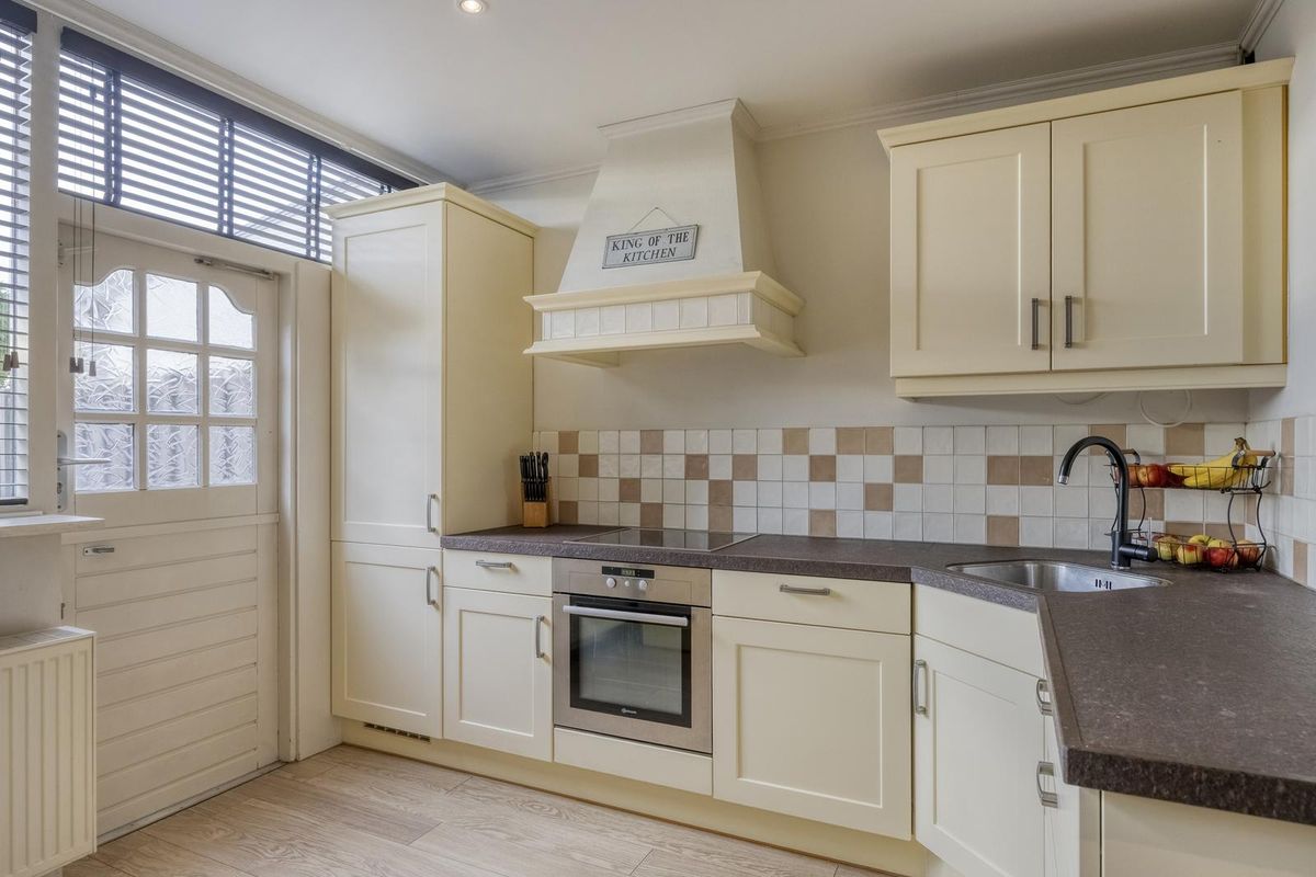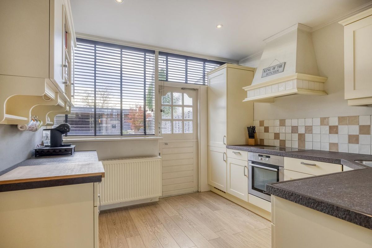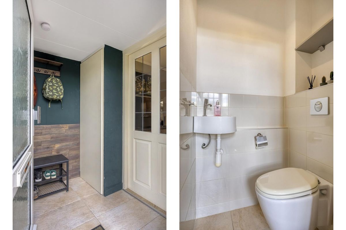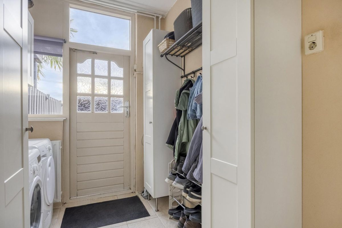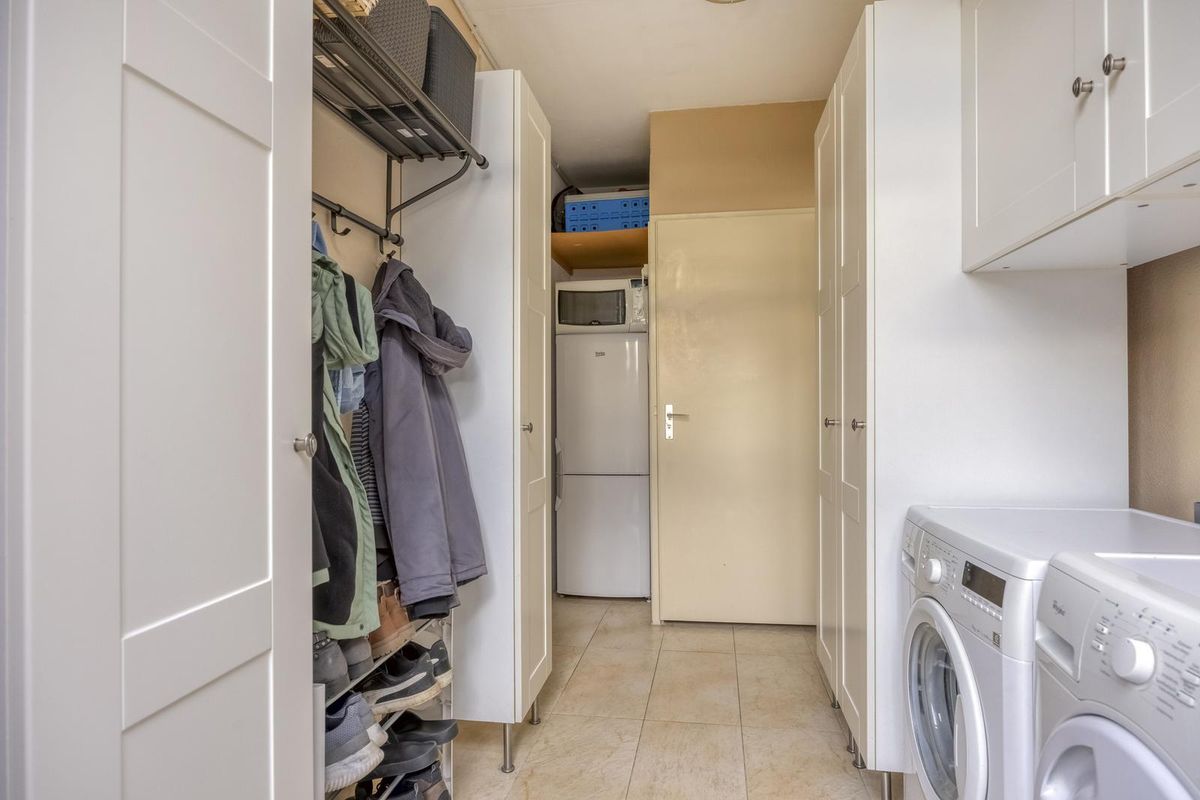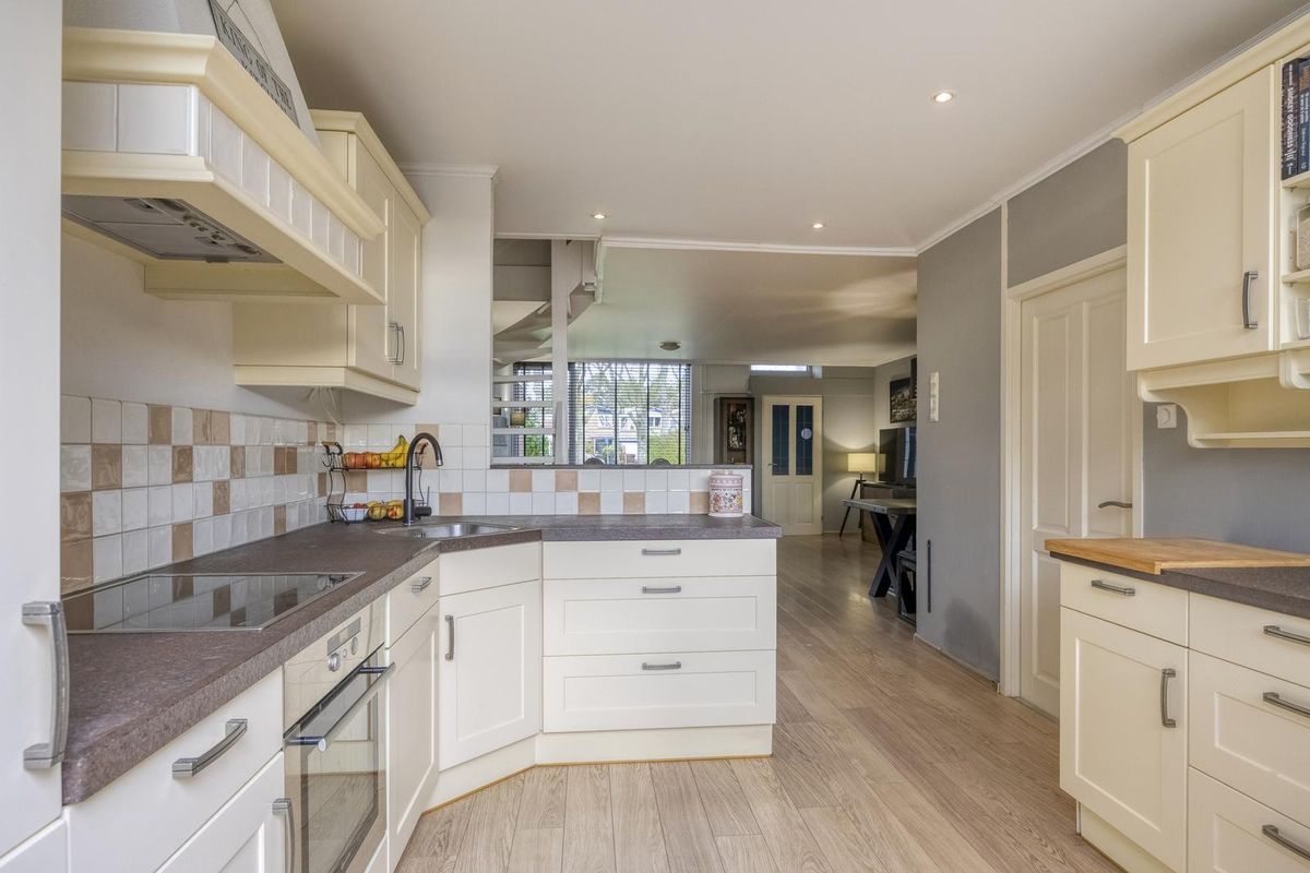 Entree/hal met meterkast en toegang tot de woonkamer. De ruime woonkamer is van een mooie formaat en door de grote raampartijen is er prettig veel lichtinval. De keuken is aan de achterzijde van de woning gesitueerd met daarnaast een fijne bijkeuken. De keuken in L-vormige wandopstelling is voorzien van een koelkast, oven, keramische kookplaat met afzuigkap, spoelbak en diverse bergkasten en lades. In de bijkeuken is er een aansluiting voor de wasmachine. Hier is ook het toilet te vinden.