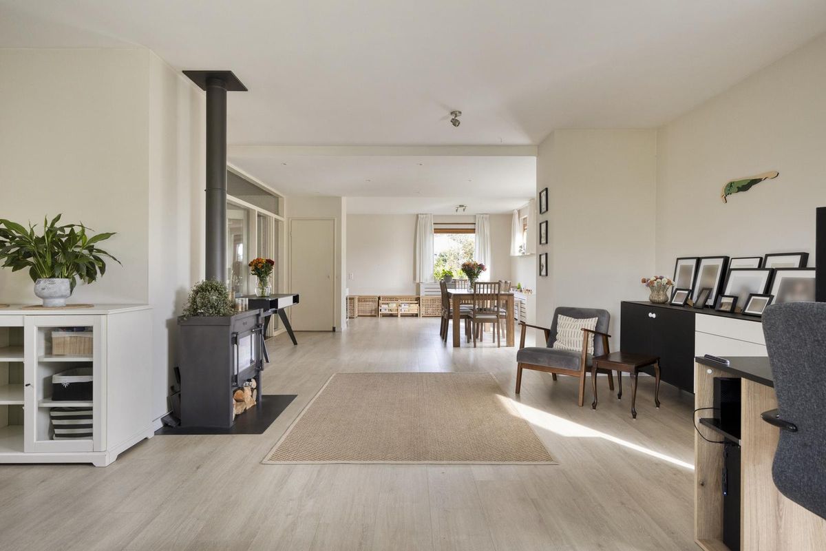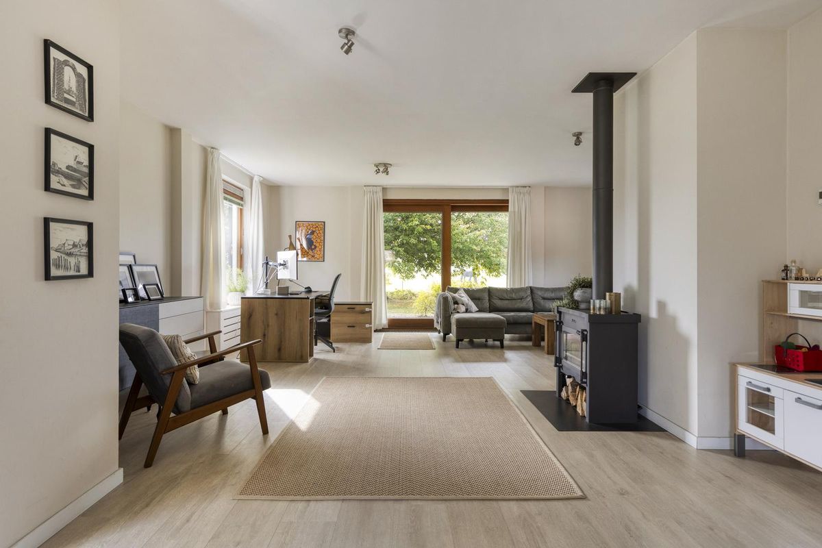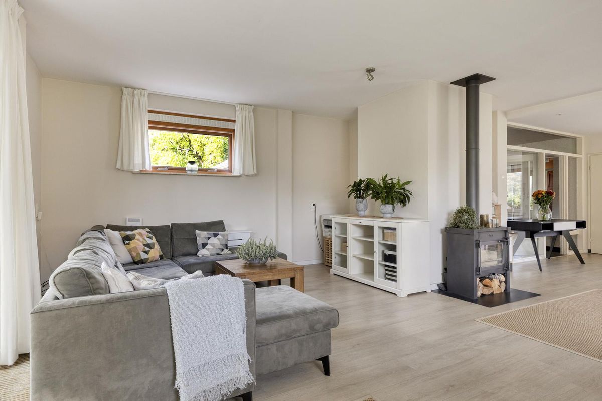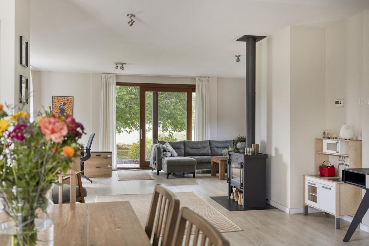 Aan de andere kant van het huis ligt de woonkamer met sfeervolle haard. Door de grote raampartijen komt er veel licht de woonkamer binnen en kijk je mooi uit over de tuin én de achtergelegen weide waar altijd iets te zien is. Door de mooie afmetingen van de woonkamer zijn diverse zitopstellingen mogelijk. De schuifpui zorgt voor een goede verbinding met het overdekte terras aan de tuinzijde. Aangrenzend aan de woonkamer vinden we de neutrale keuken met een inductiekookplaat, koel-vriescombinatie, oven, vaatwasser en afzuigkap.