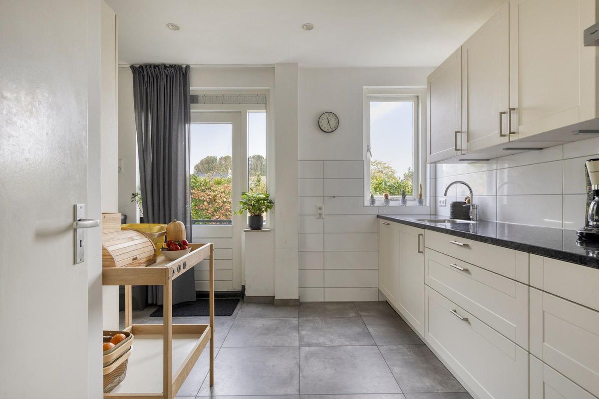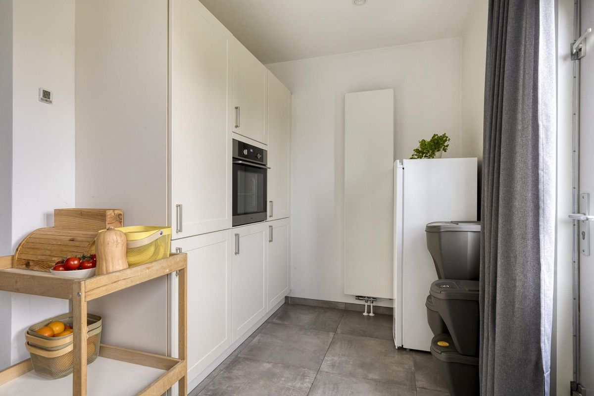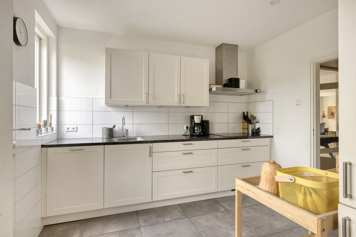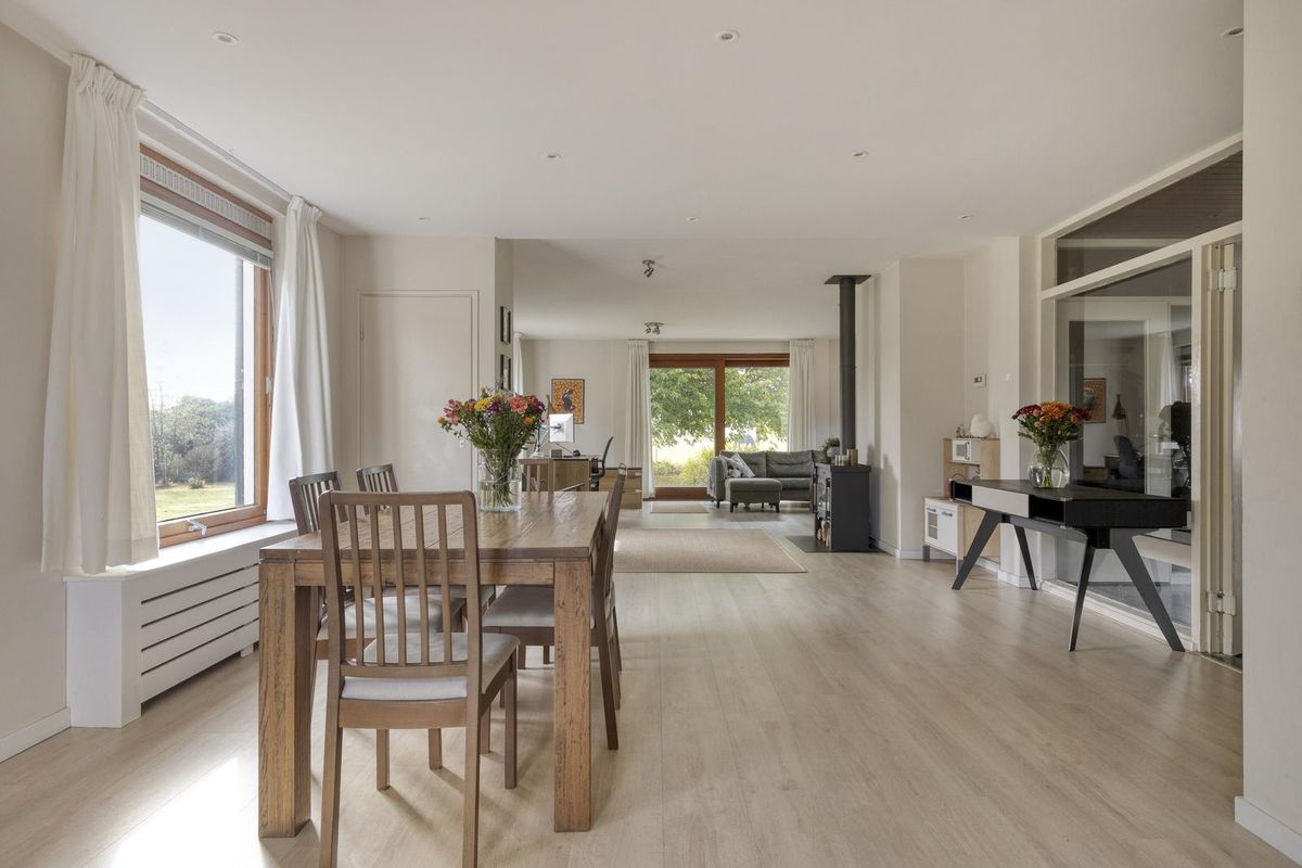 Aan de andere kant van het huis ligt de woonkamer met sfeervolle haard. Door de grote raampartijen komt er veel licht de woonkamer binnen en kijk je mooi uit over de tuin én de achtergelegen weide waar altijd iets te zien is. Door de mooie afmetingen van de woonkamer zijn diverse zitopstellingen mogelijk. De schuifpui zorgt voor een goede verbinding met het overdekte terras aan de tuinzijde. Aangrenzend aan de woonkamer vinden we de neutrale keuken met een inductiekookplaat, koel-vriescombinatie, oven, vaatwasser en afzuigkap.