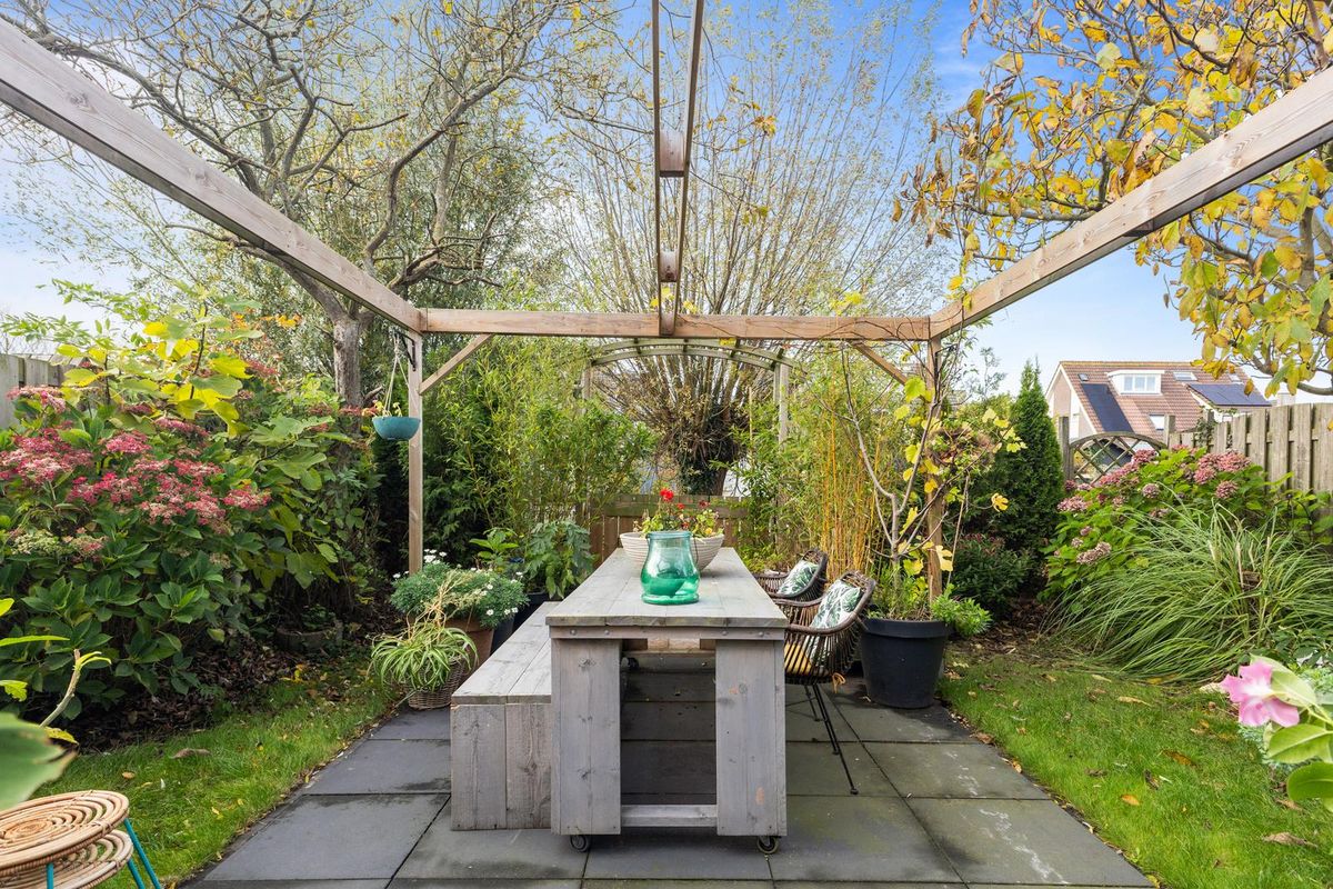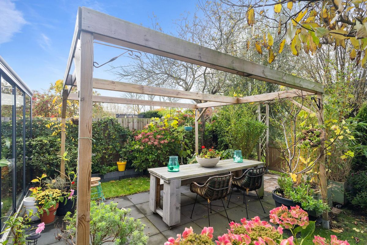 De achtertuin ligt op het noordwesten en biedt de perfecte combinatie van zon en beschutting. Vanuit de serre kijk je vrij uit over het achterliggende groen en is een heerlijke plek om te ontspannen na een lange dag.